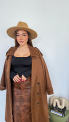 Trench da donna in camoscio, foderato internamente. Chiusura a bottoni e cintura in vita. La modella in foto indossa taglia S/M.