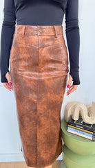 Gonna da donna in ecopelle, top quality e veste regolarmente la propria taglia, la modella indossa taglia S