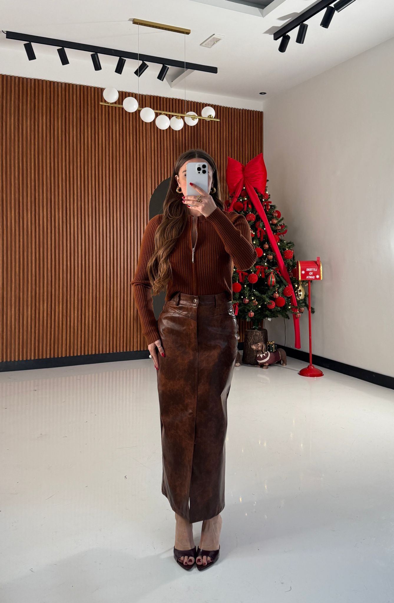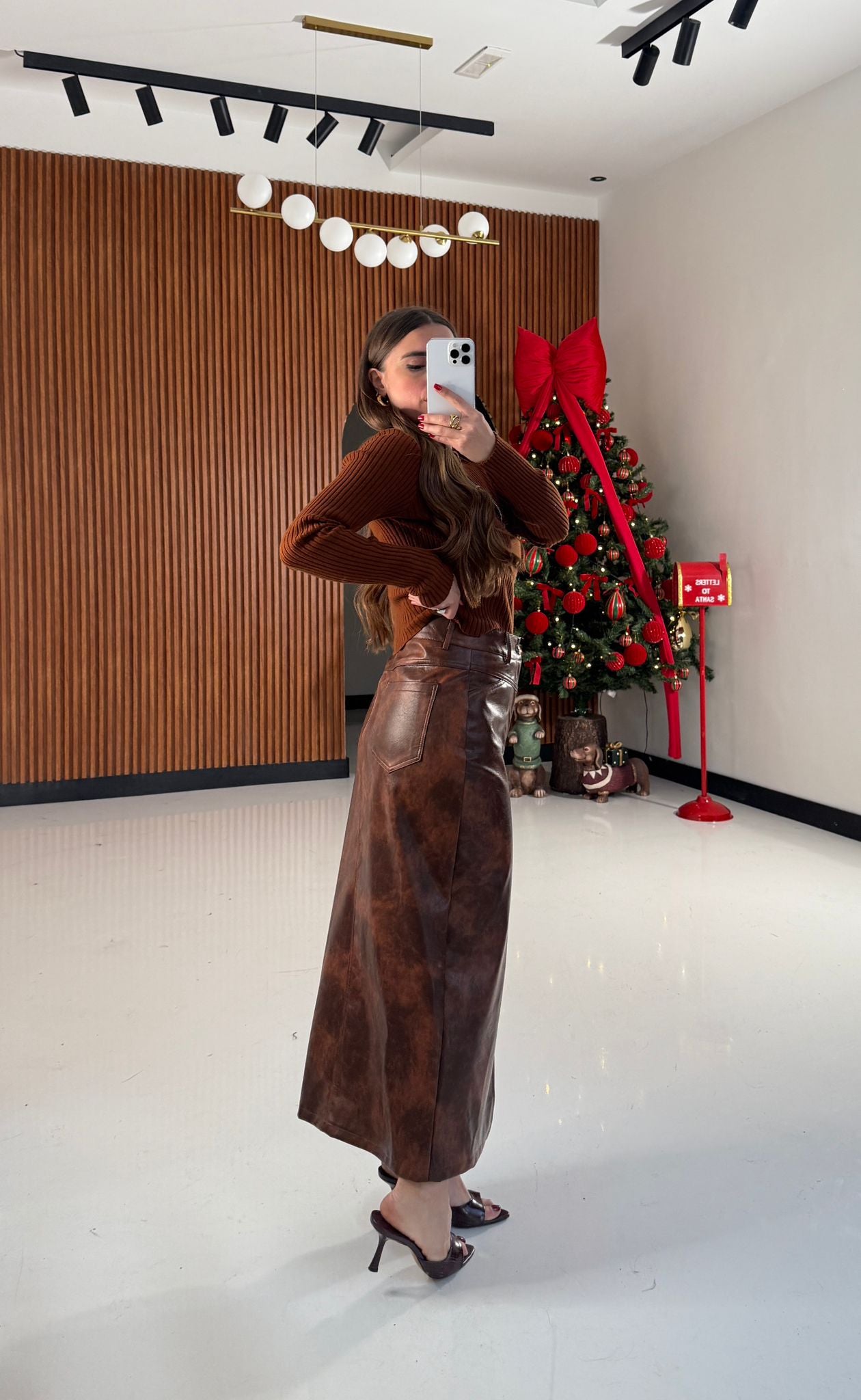 Gonna da donna in ecopelle, top quality e veste regolarmente la propria taglia, la modella indossa taglia S