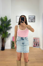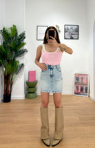 Gonna da donna in denim chiaro tessuto elasticizzato ma veste regolarmente la propria taglia e Giusy indossa taglia XS