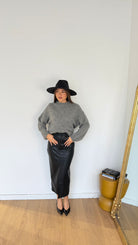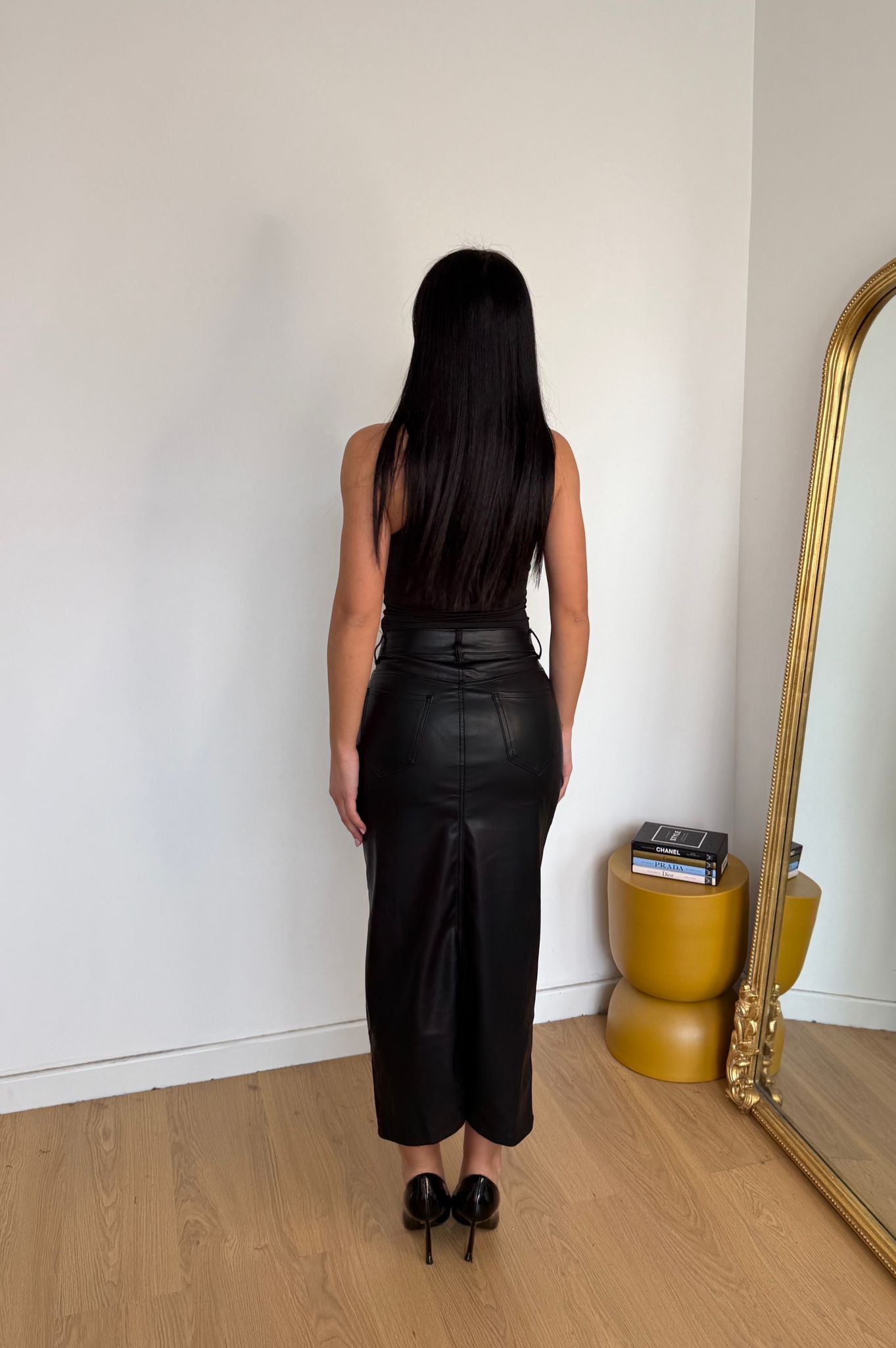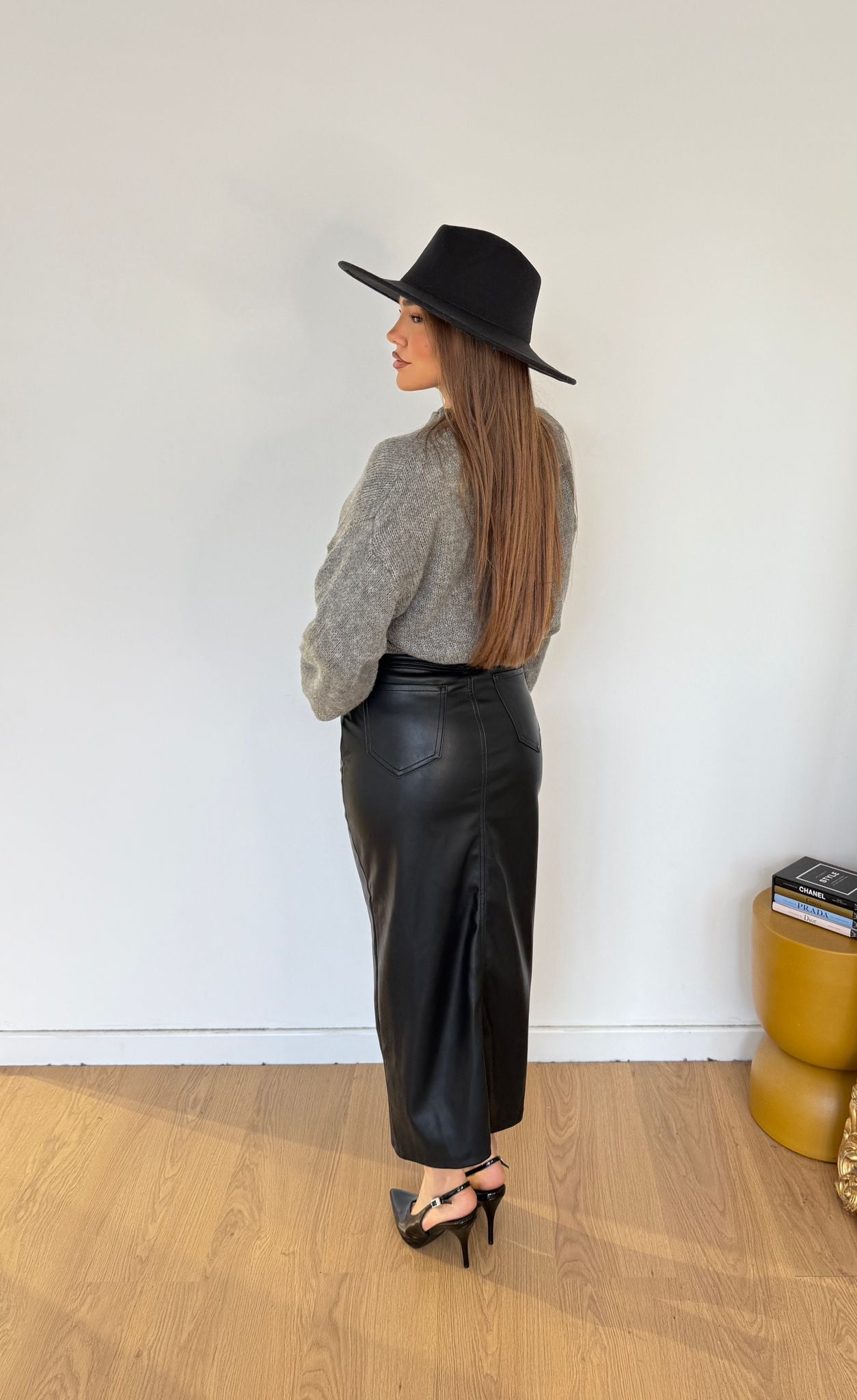 Gonna da donna in ecopelle, tessuto elasticizzato e con spacchetto sul davanti e veste bene la propria taglia e la modella indossa taglia S