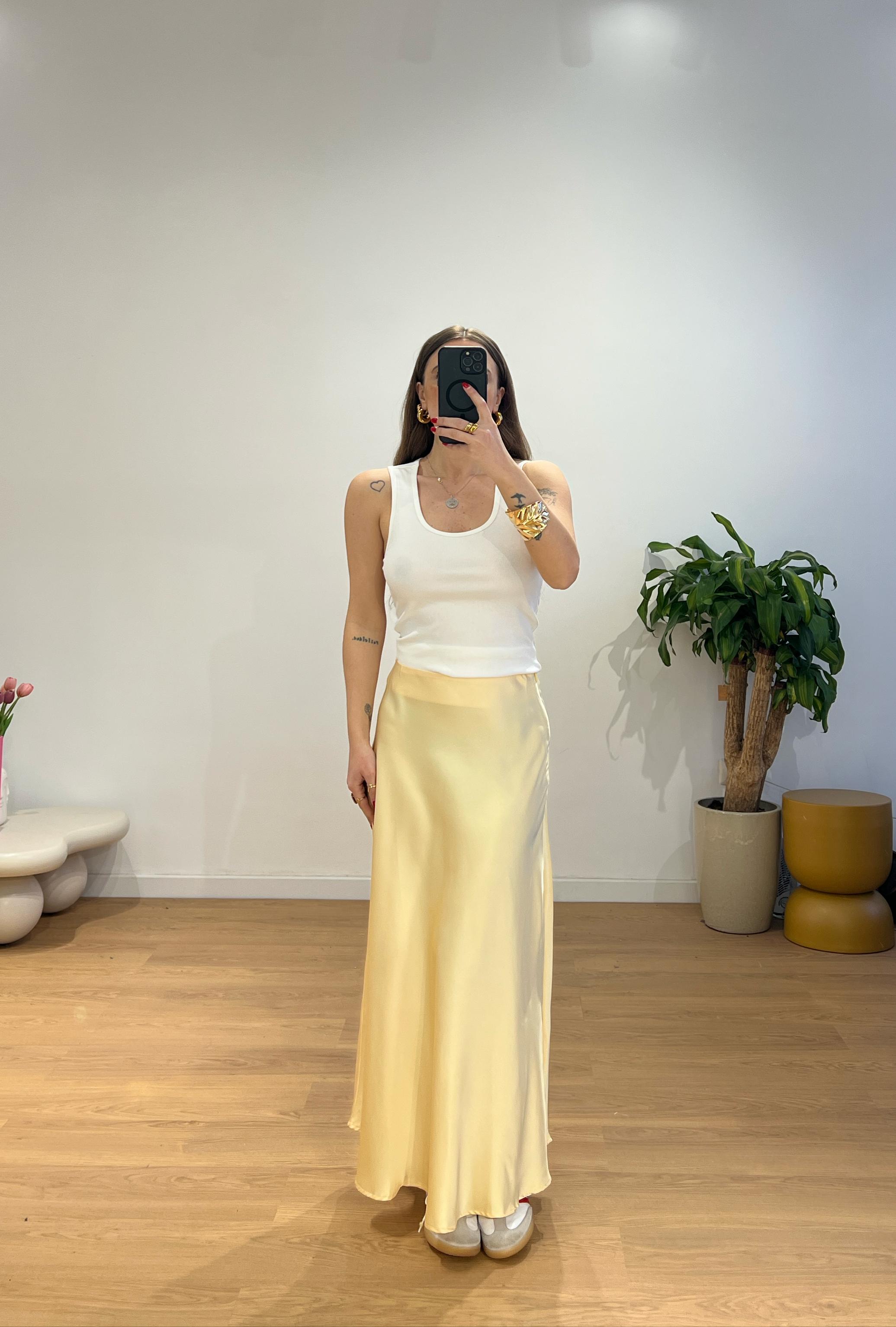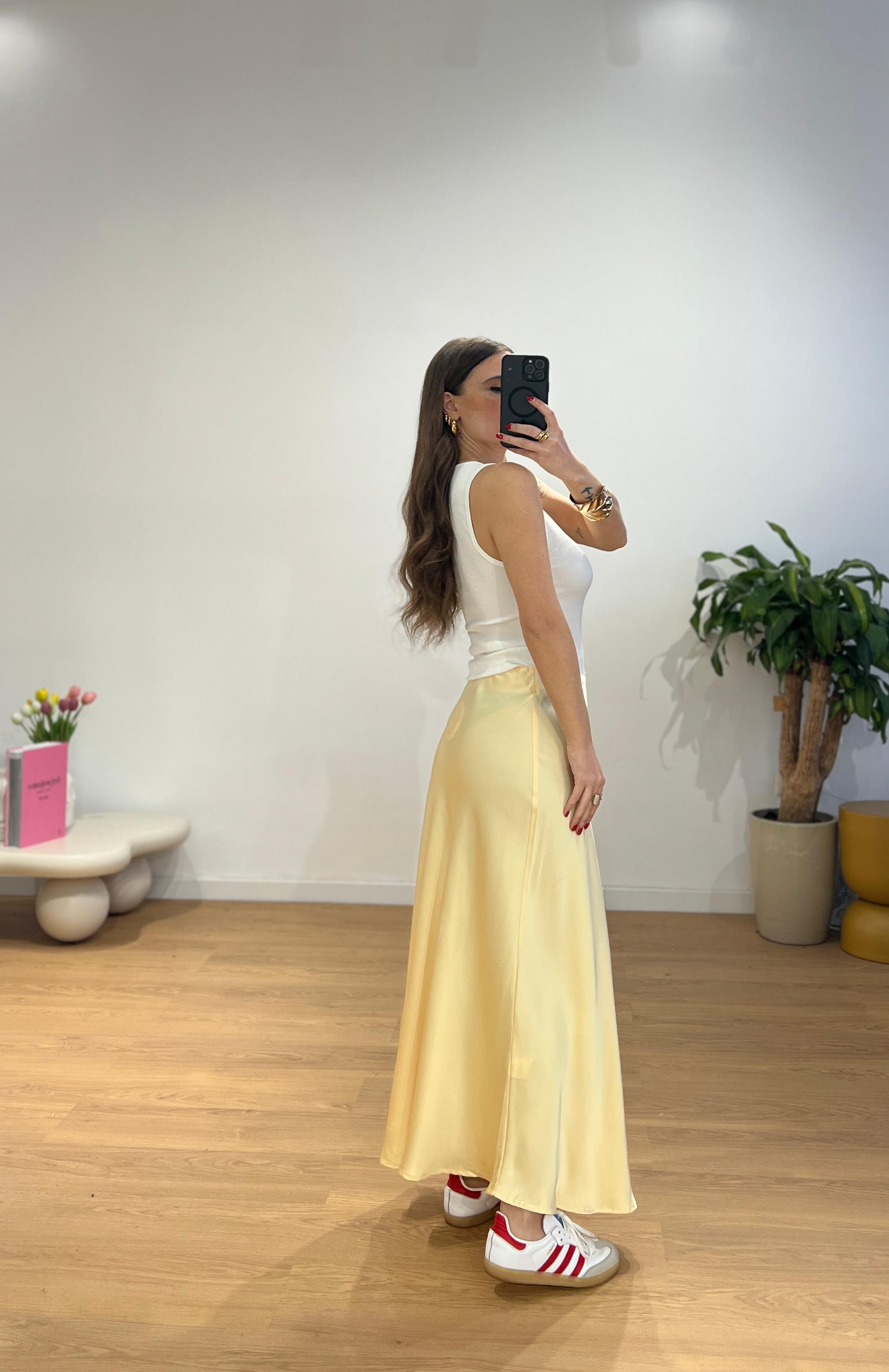 Gonna da donna effetto raso lucido con chiusura zip laterale, vestibilità morbida e veste regolarmente la propria taglia e Giusy indossa taglia S