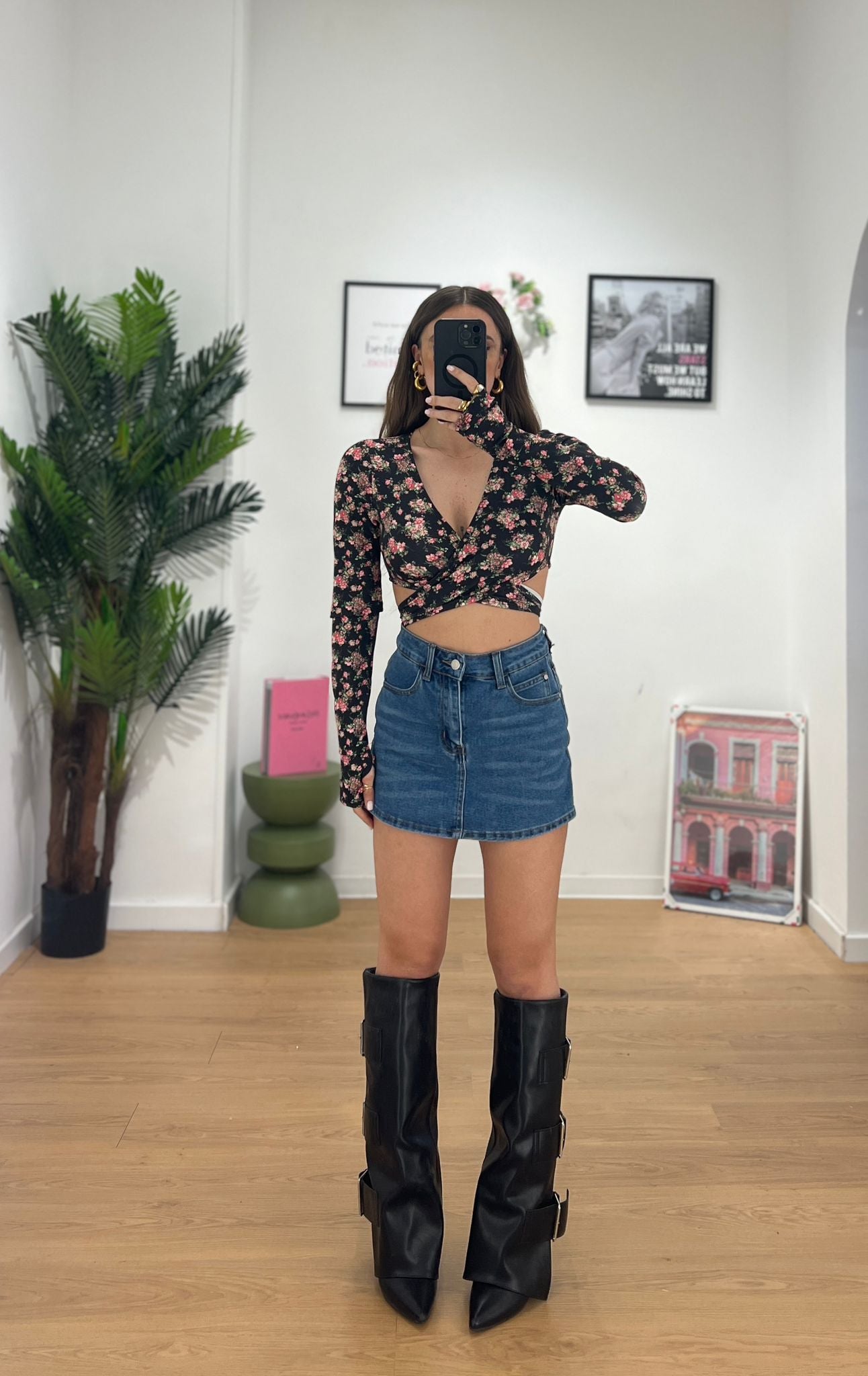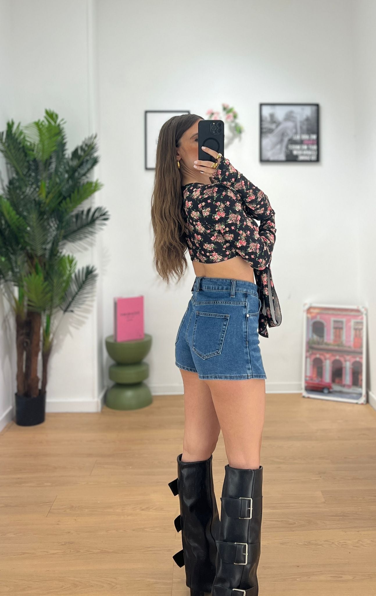 Pantagonna da donna in denim tessuto elasticizzato ma veste regolarmente la propria taglia e Giusy indossa taglia XS