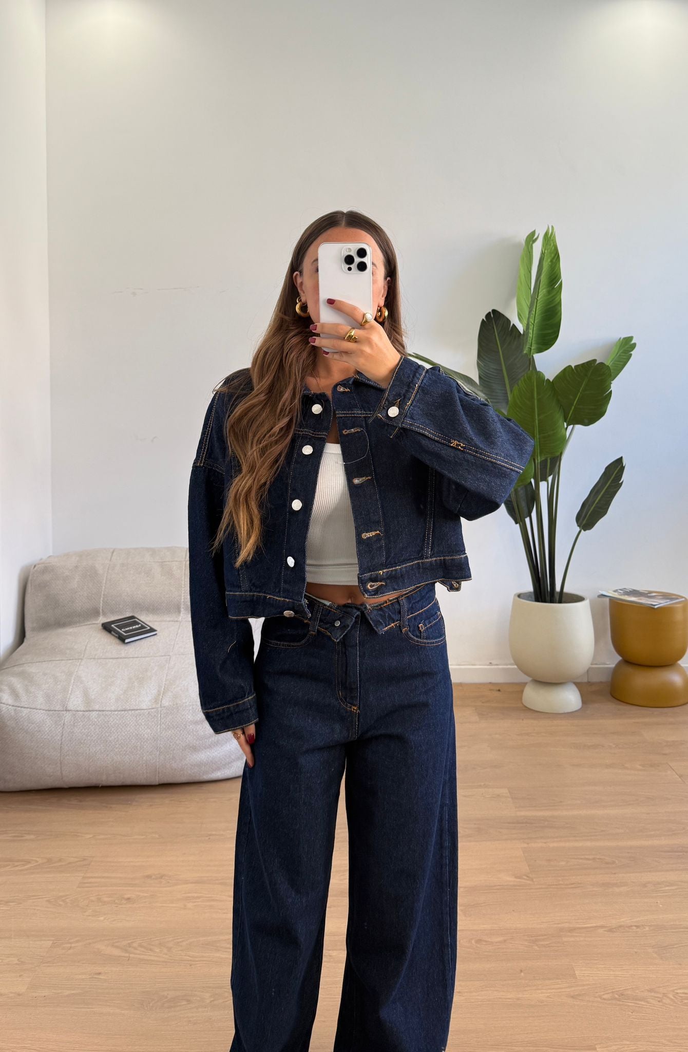 Giacca da donna crop in denim tela fissa e veste la propria taglia e la modella indossa taglia XS