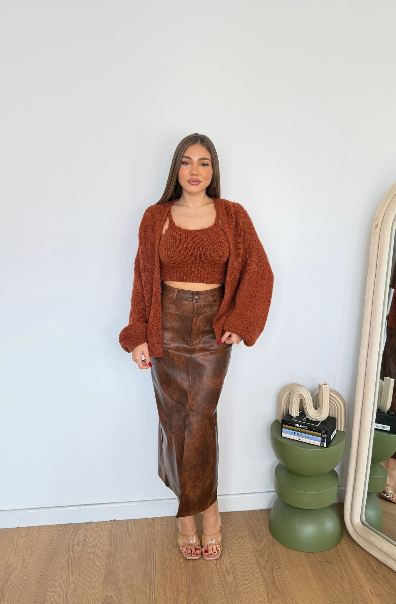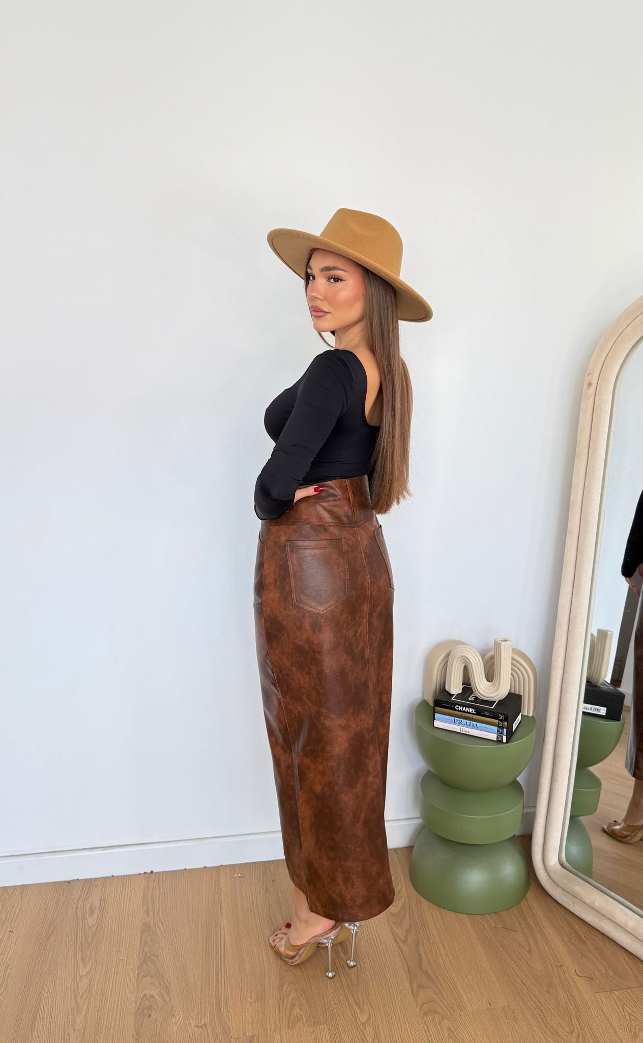 Gonna da donna in ecopelle, top quality e veste regolarmente la propria taglia, la modella indossa taglia S
