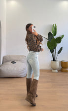 Jeans da donna in denim tessuti elasticizzato e veste la propria taglia e la modella indossa taglia XS
