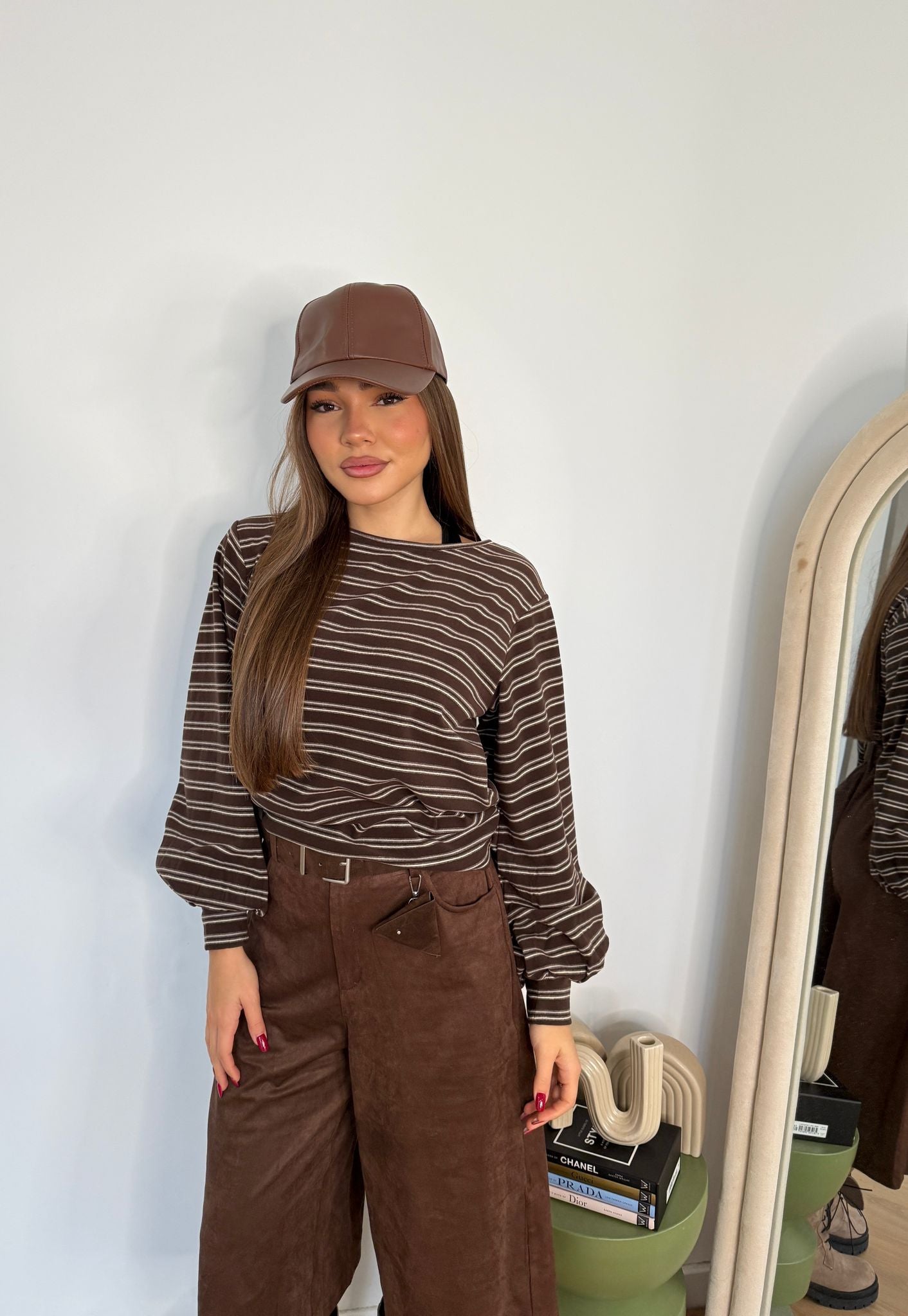 Maglia da donna fantasia righe piccole con polsini vestibilità over e veste regolarmente la propria taglia e la modella indossa taglia S