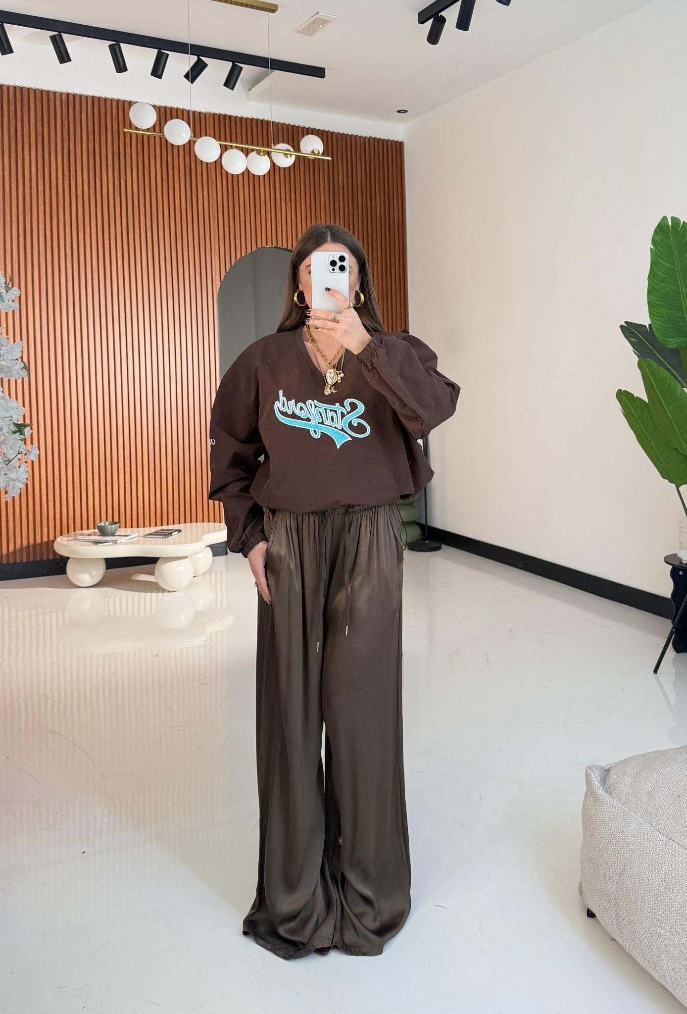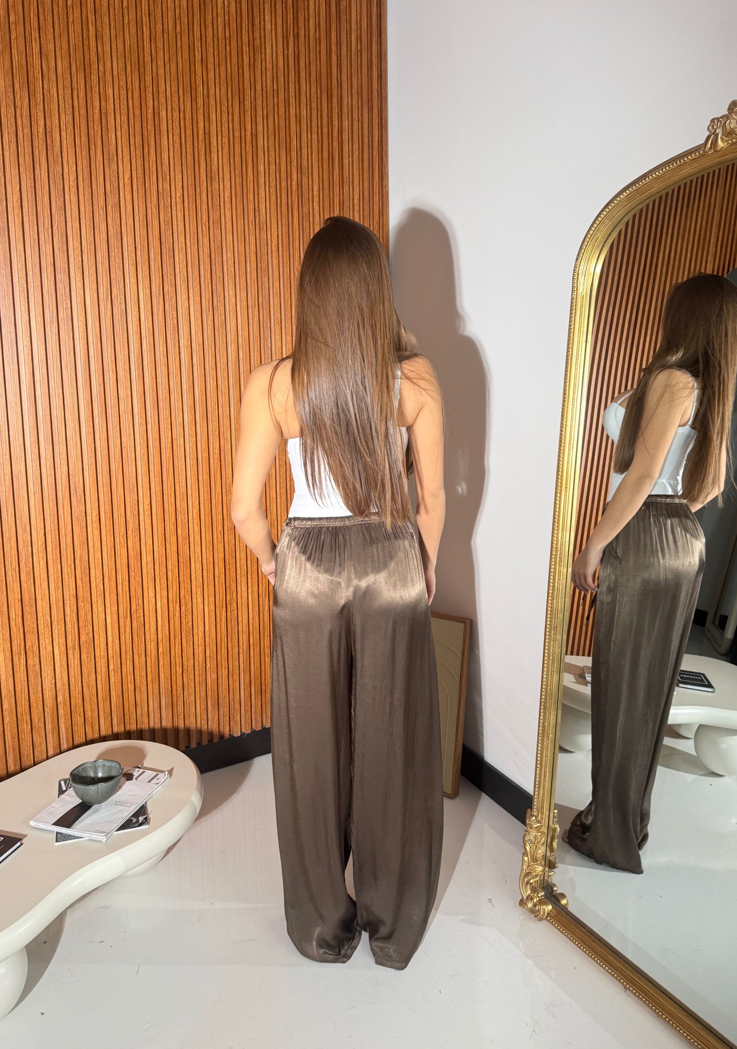 Pantalone da donna in tessuto morbido effetto satin, con elastico in vita e laccio regolabile. Taglia unica, veste bene fino ad una taglia M/L. La modella è alta 1,65 e pesa 52/53kg.