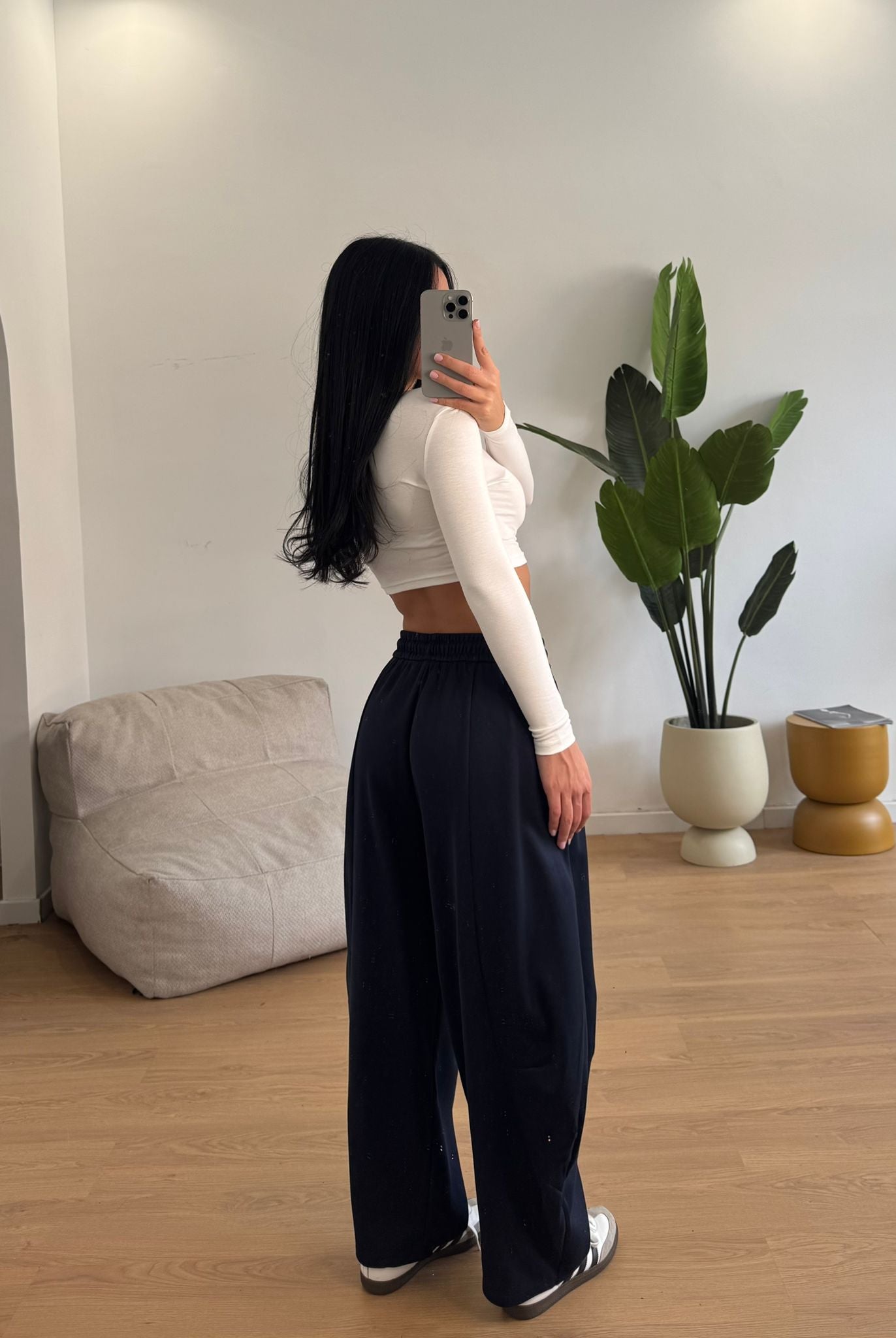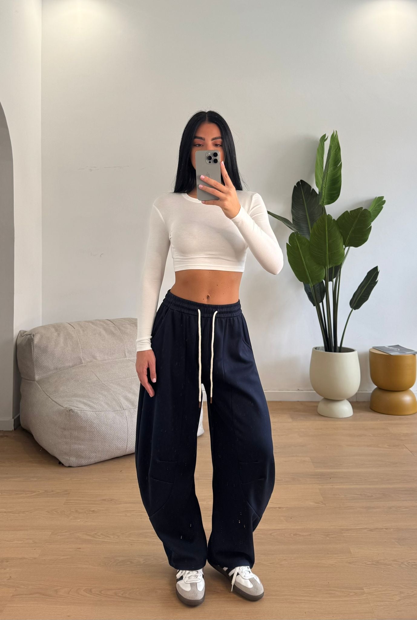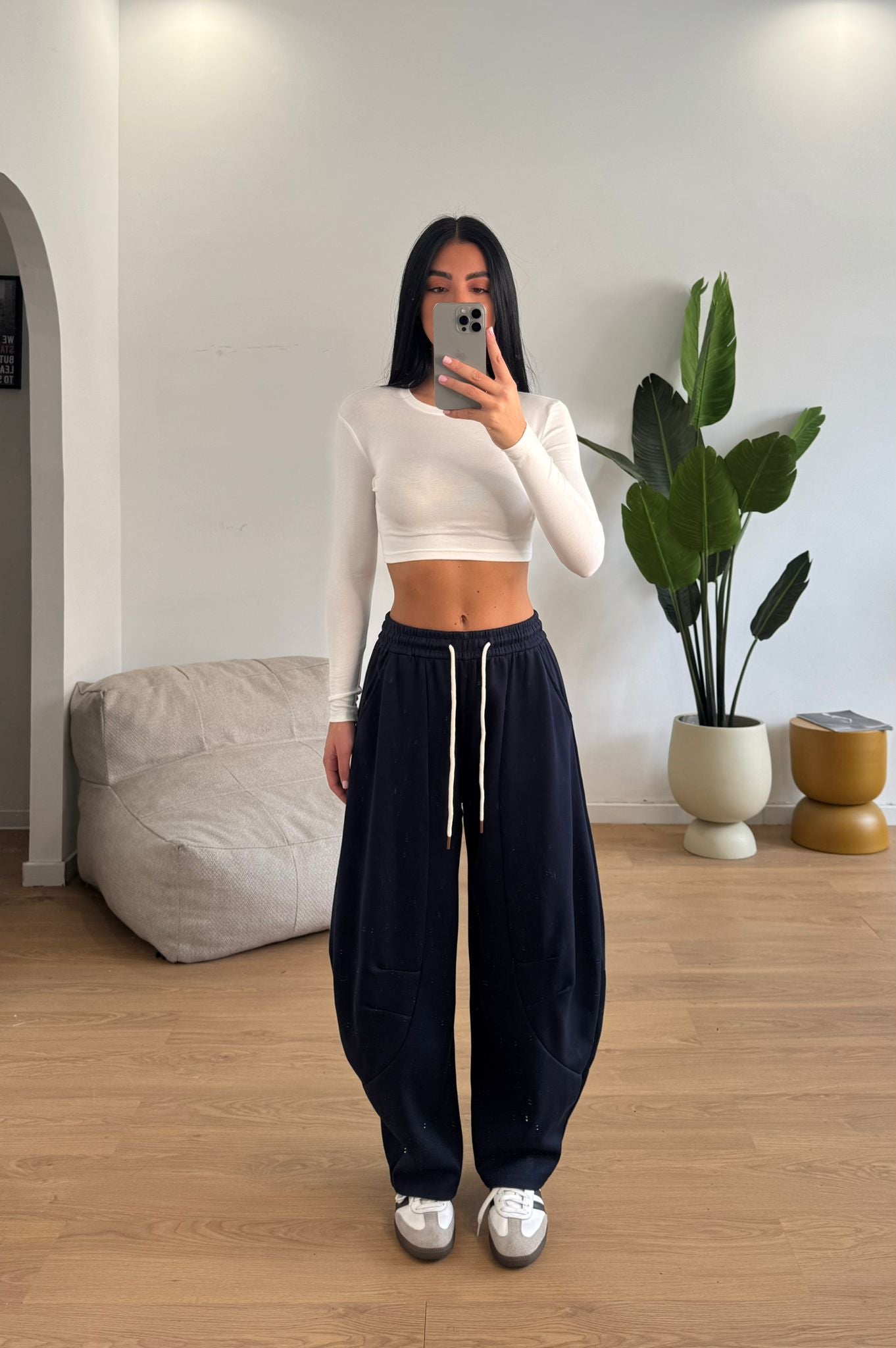 Pantatuta da donna modello ballon con elastico in vita e laccio regolabile e veste regolarmente la propria taglia e la modella indossa taglia S/M