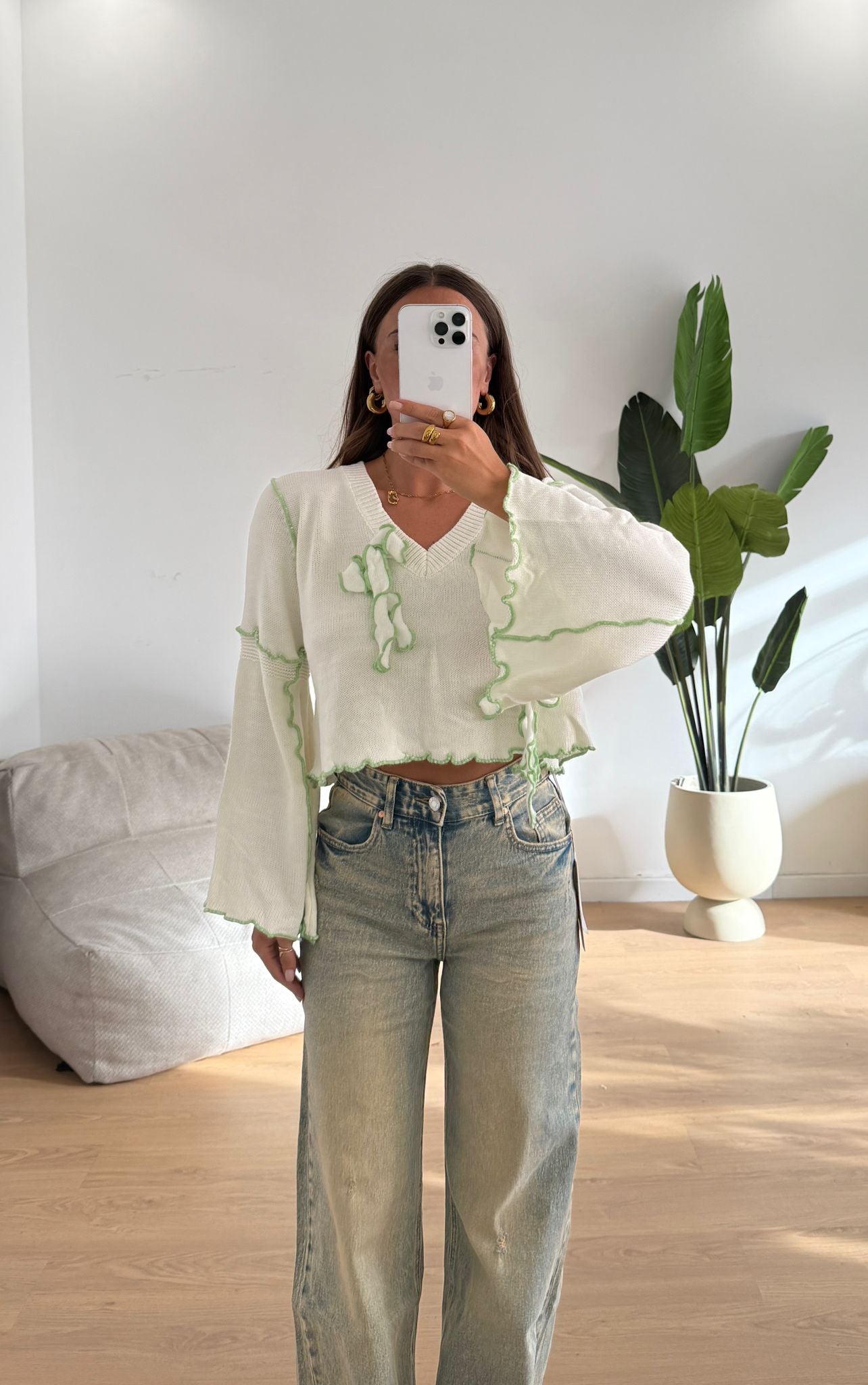 Maglioncino da donna in filo con maniche a campana sul finale e veste bene fino ad una M/L