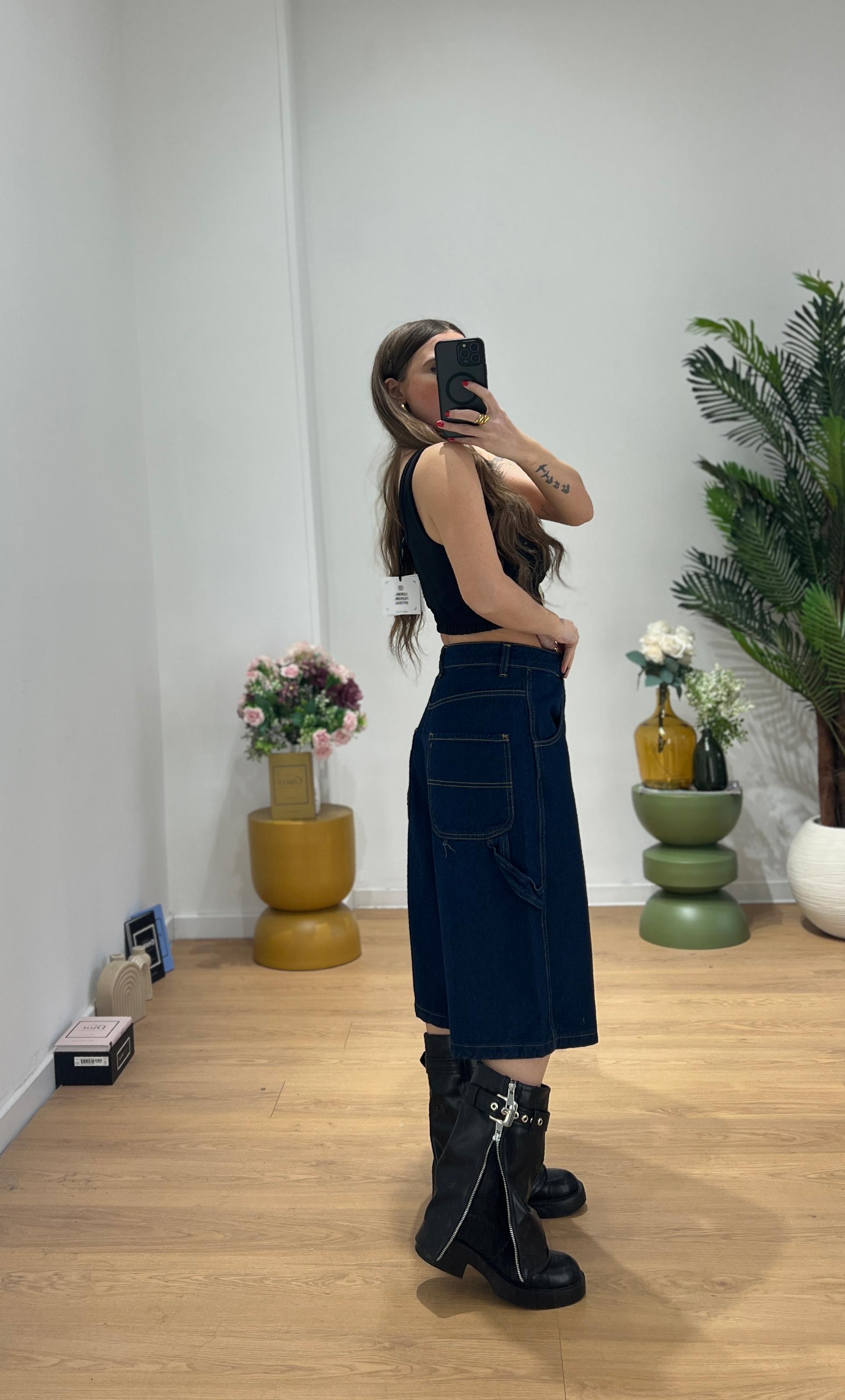 Bermuda da dona in denim scuro, tela fissa non elasticizzato ma veste regolarmente la propria taglia e giusy indossa taglia XS