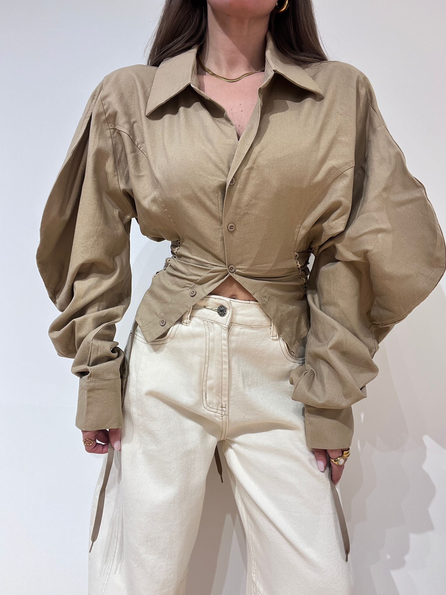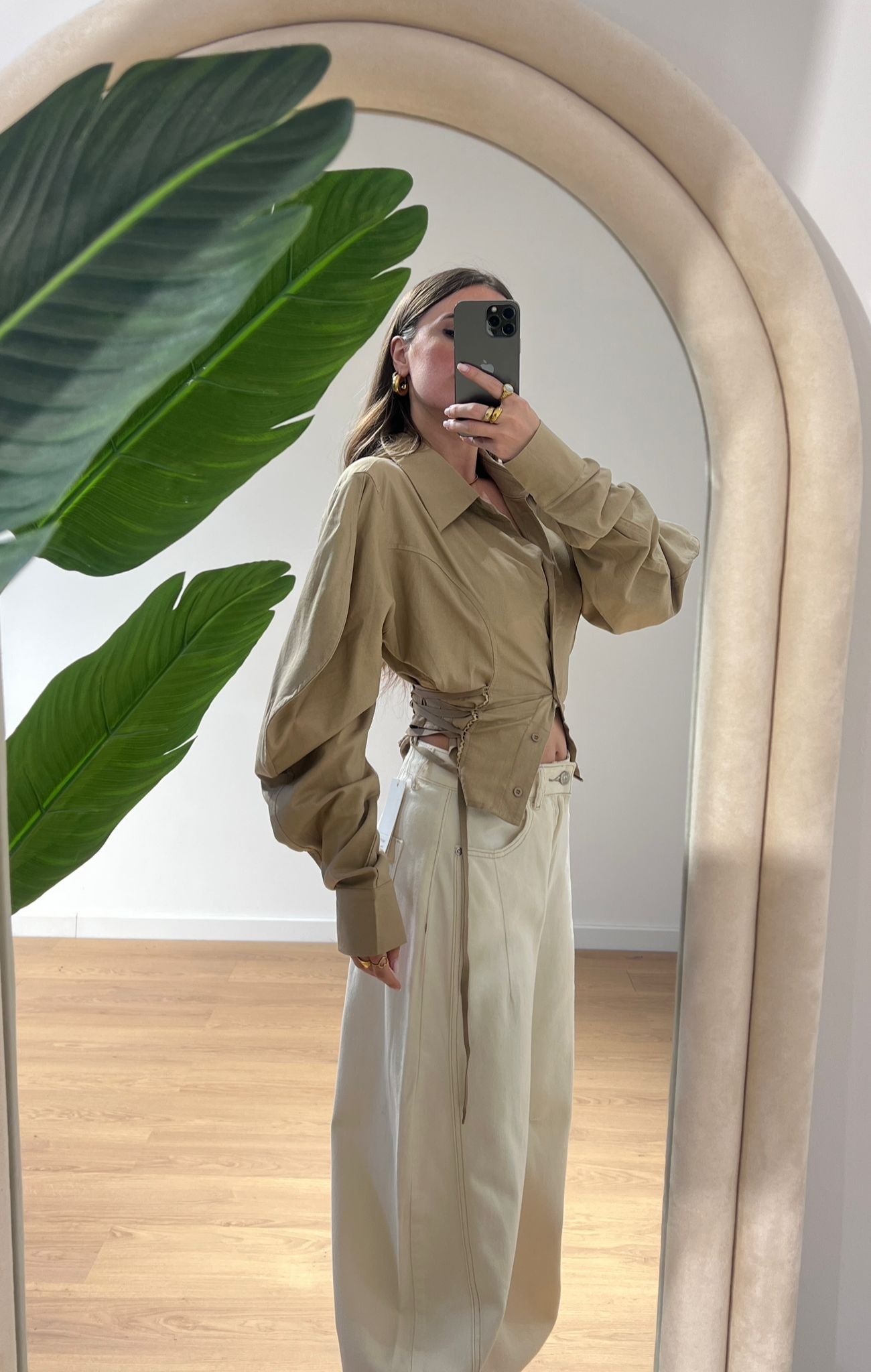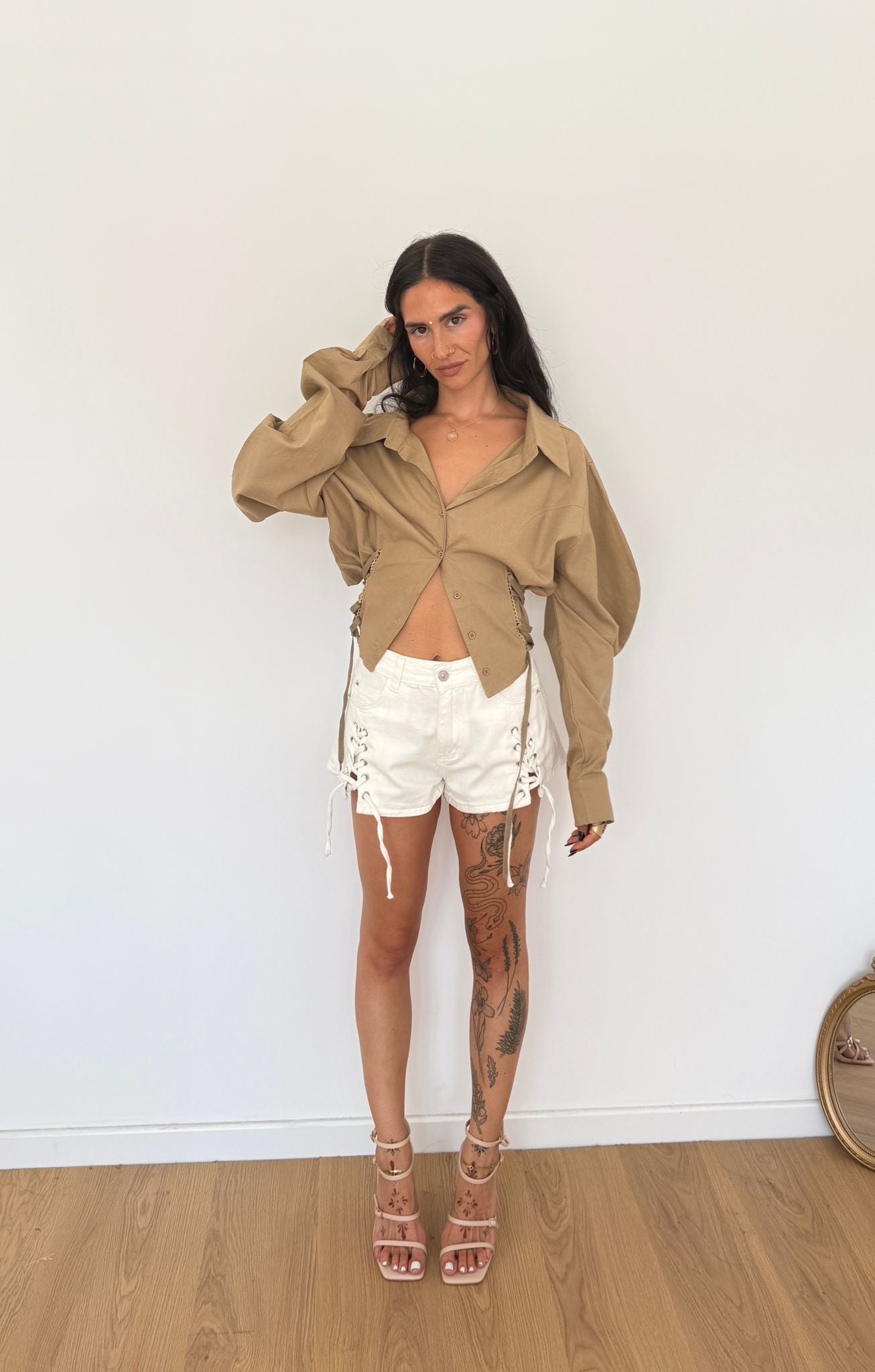Camicia da donna in semi lino con intreccio laccio ai lati regolabili, veste regolarmente la propria taglia e giusy indossa taglia S/M