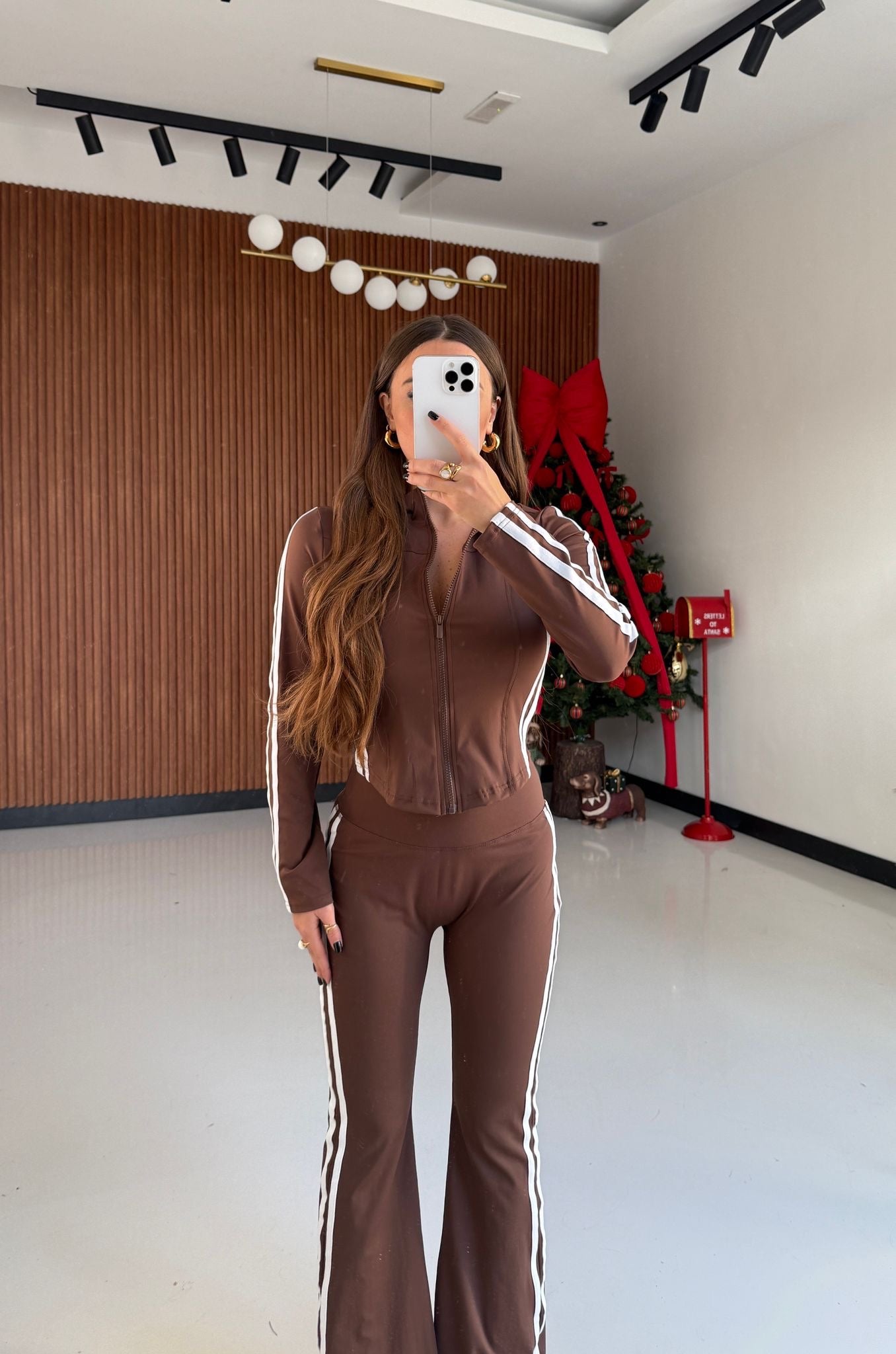 Coordinato da donna in lycra, tessuto elasticizzato. Composto da maglia con zip sul davanti e pantalone a zampa con elastico in vita. Taglia unica, veste bene fino ad una taglia M.