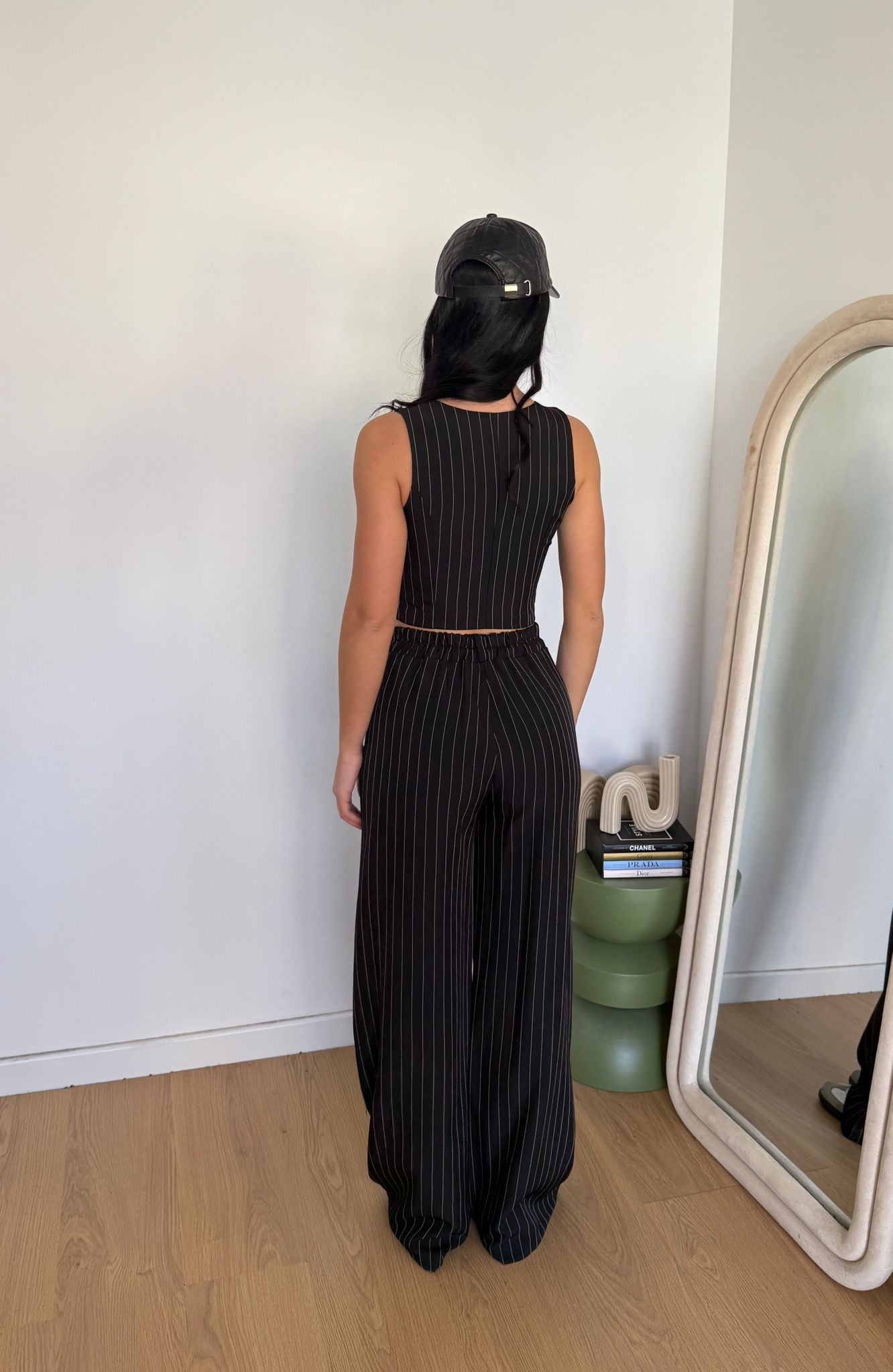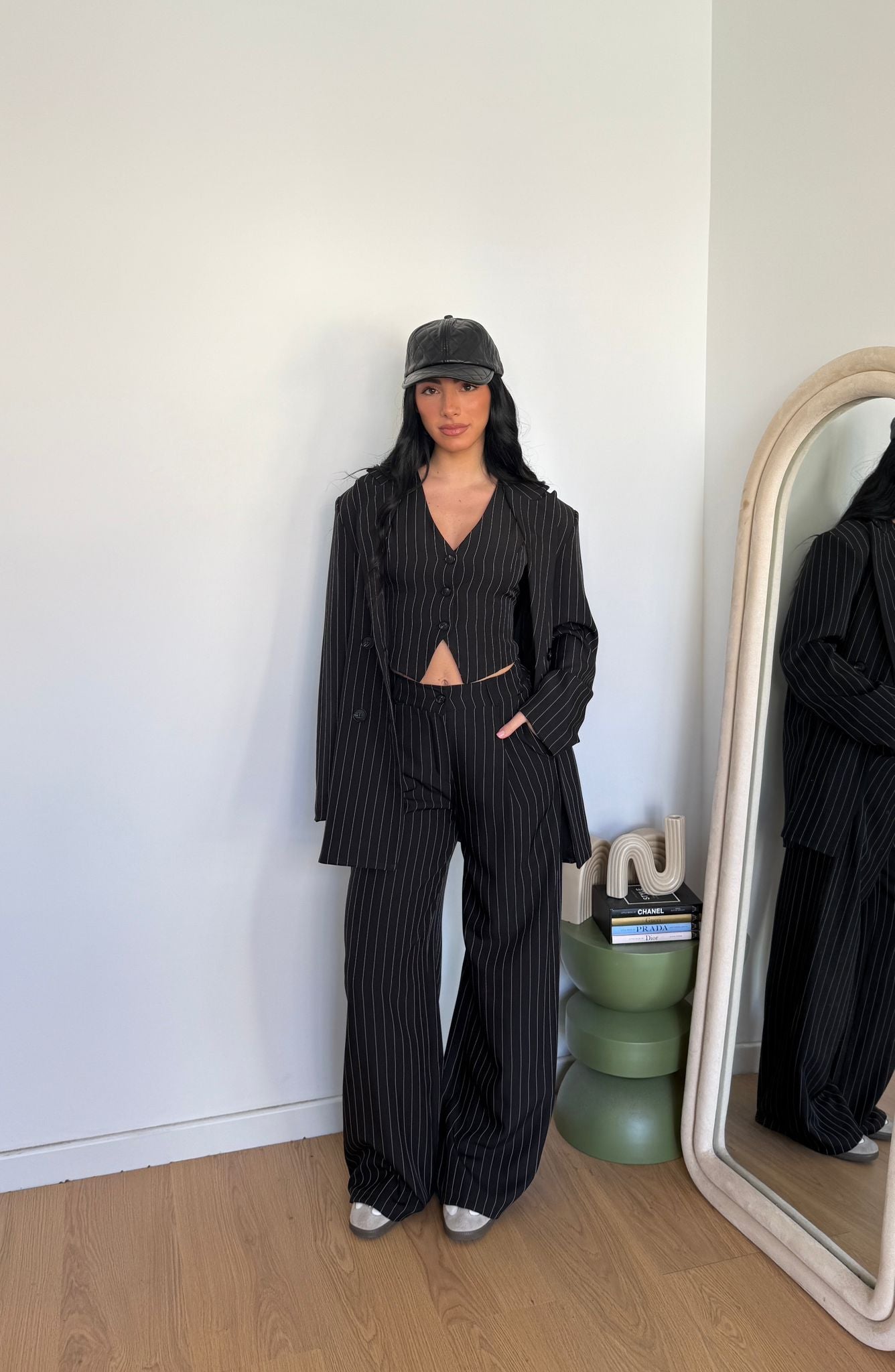 Coordinato da donna gessato composto da giacca con spalline imbottite, foderata internamente, gilet e pantalone con elastico in vita sul retro. Taglia unica, veste bene fino ad una 44.