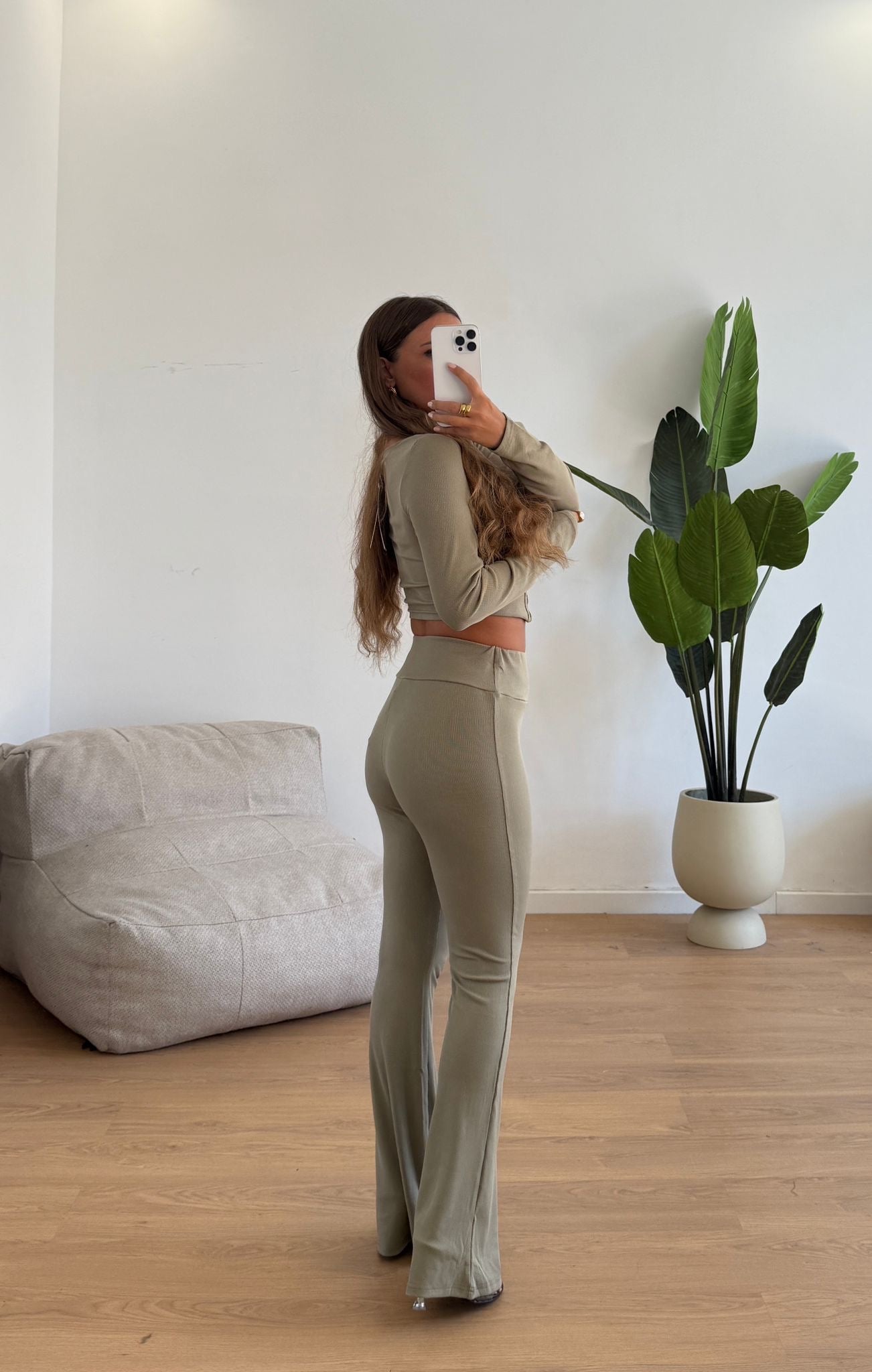 Coordinato da donna a constine tessuto elasticizzato composto da maglia e pantalone a zampa e veste regolarmente la propria taglia e la modella indossa taglia S/M