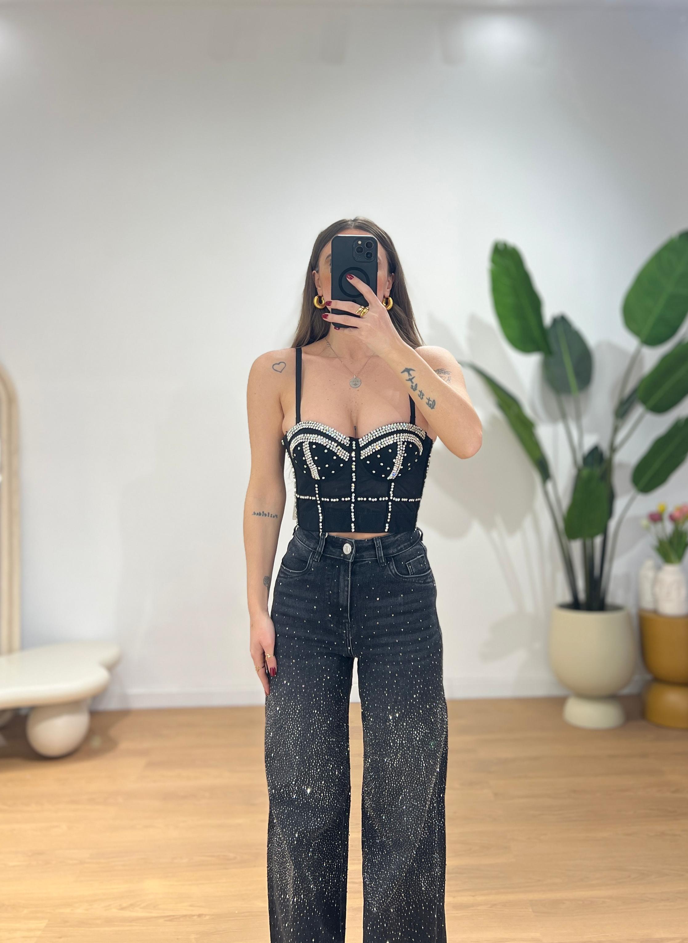 Corpetto da donna con ferretto e coppa imbottita ricoperta di brillantini e bretelle regolabili. Chiusura sul retro da reggiseno veste regolarmente la propria taglia e Giusy indossa taglia S
