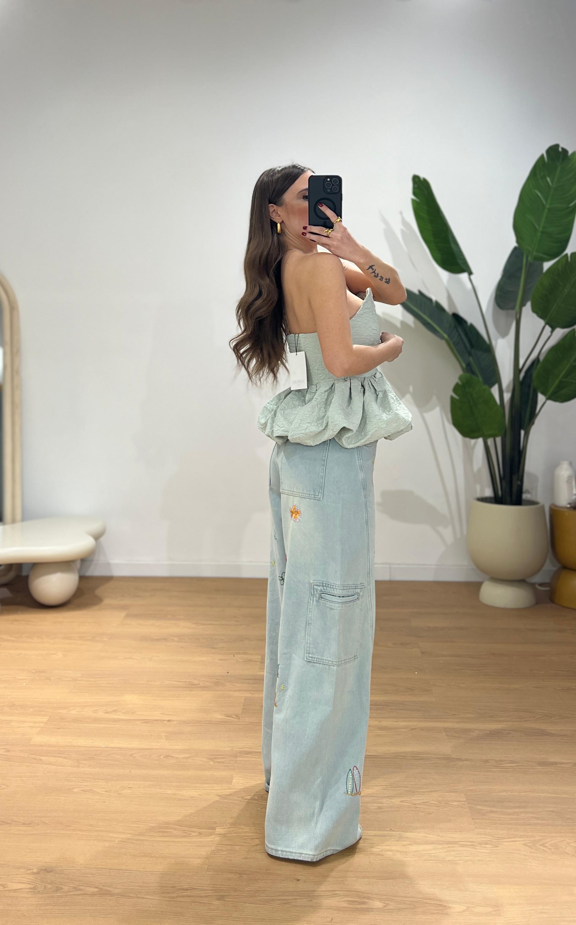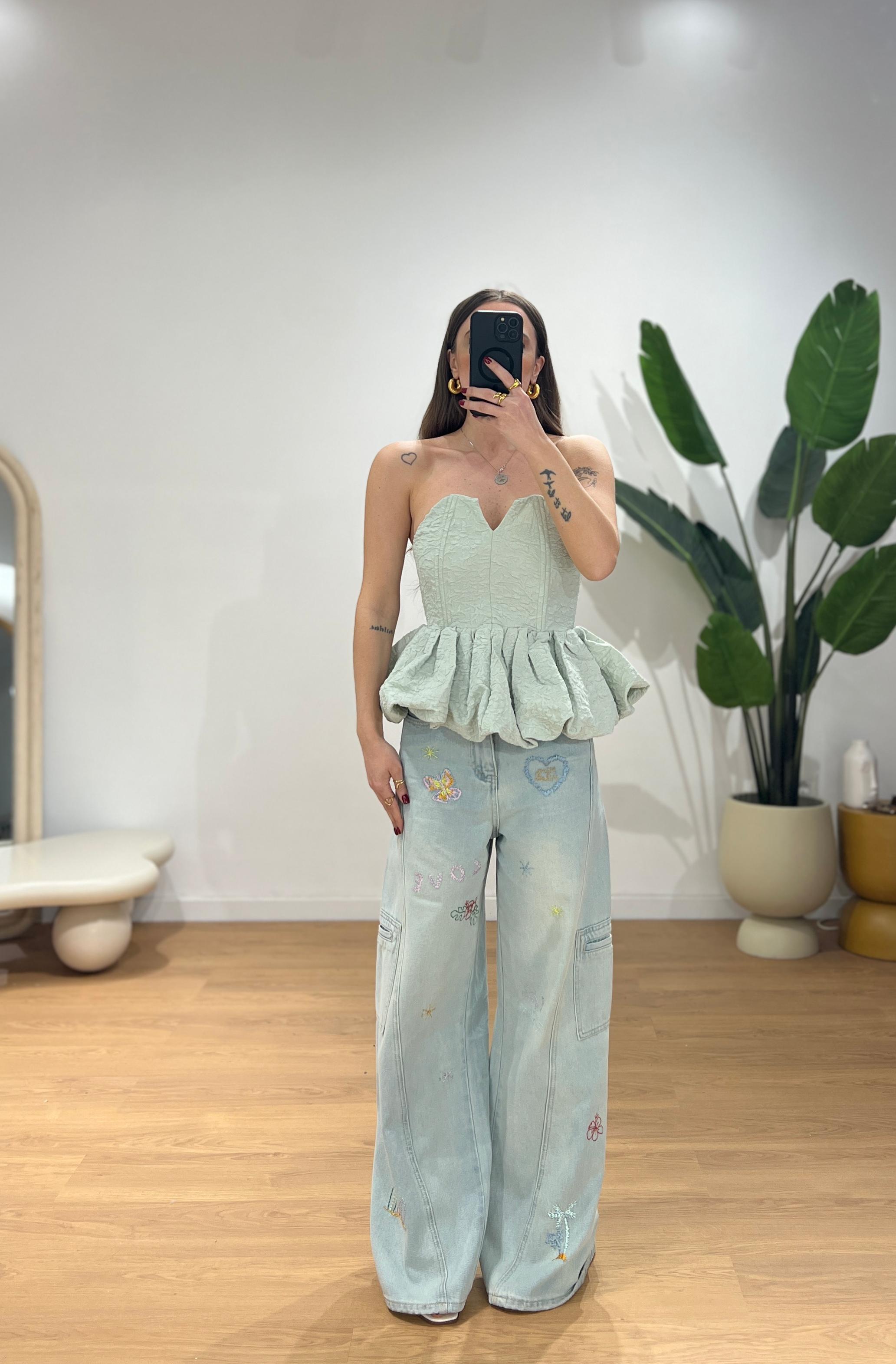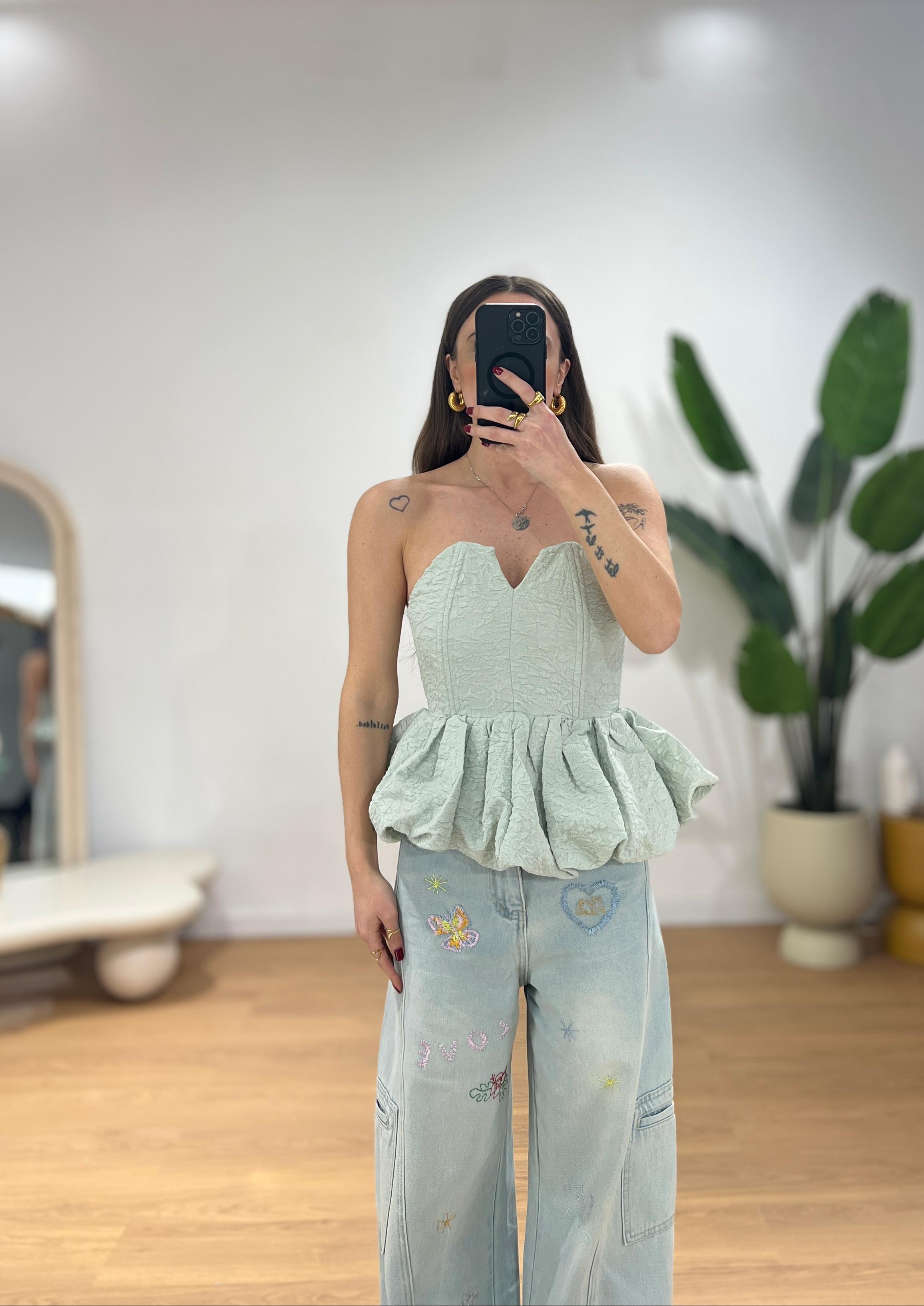 Corpetto a cuore senza spalline, con una scollatura strutturata e ferretti, termina sul fondo con un volant che aggiunge volume e movimento. Il tessuto dall'effetto stropicciato è leggermente elasticizzato. Sul retro presenta una chiusura con zip. Giusy indossa la taglia S.