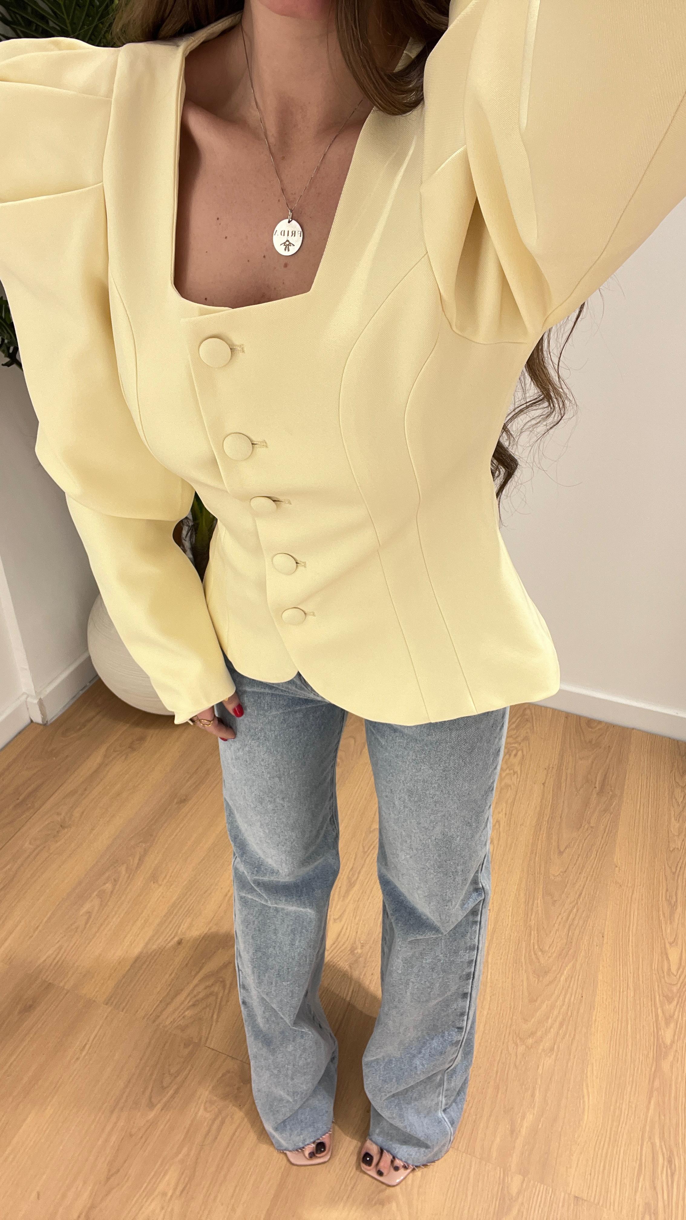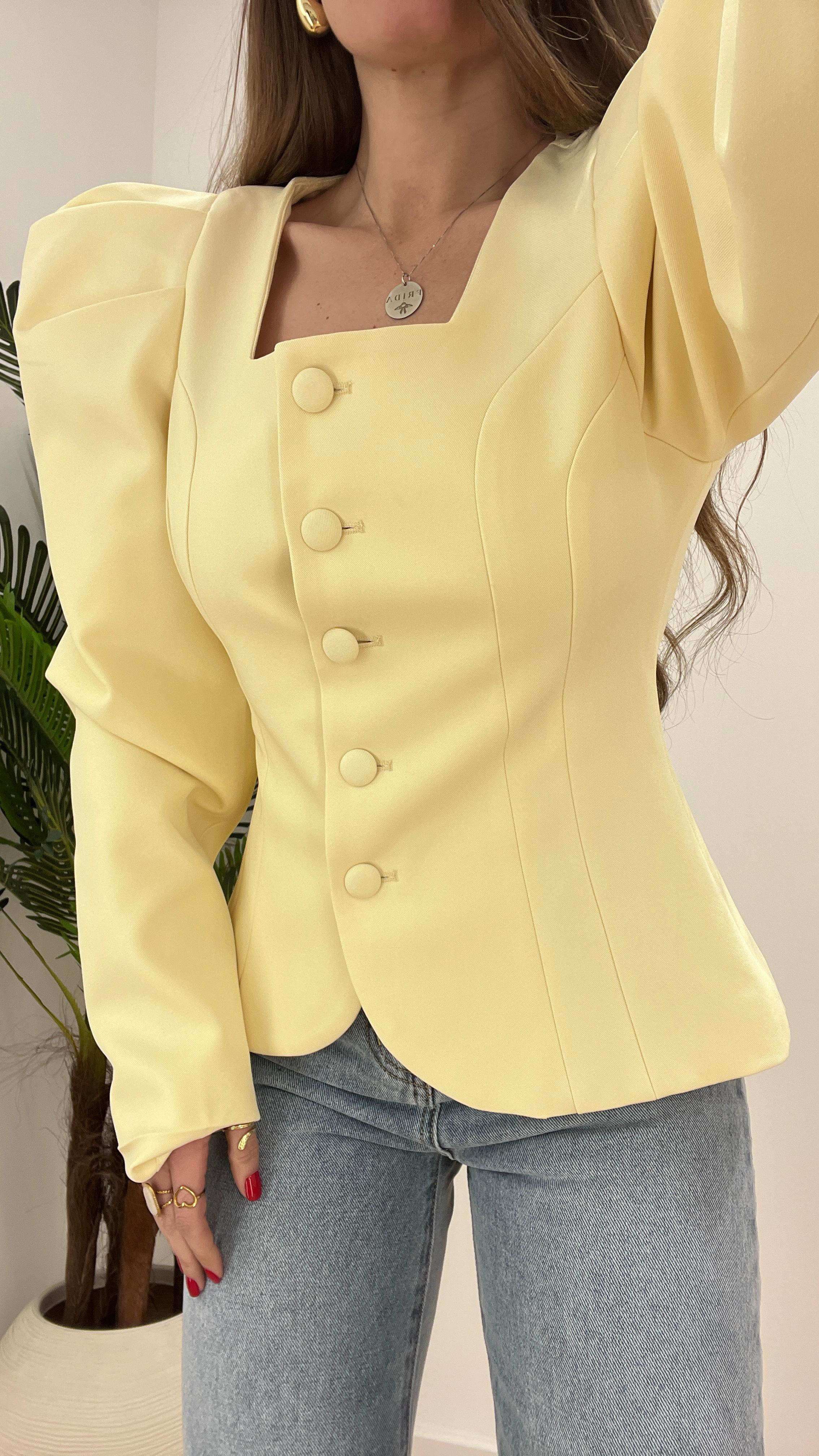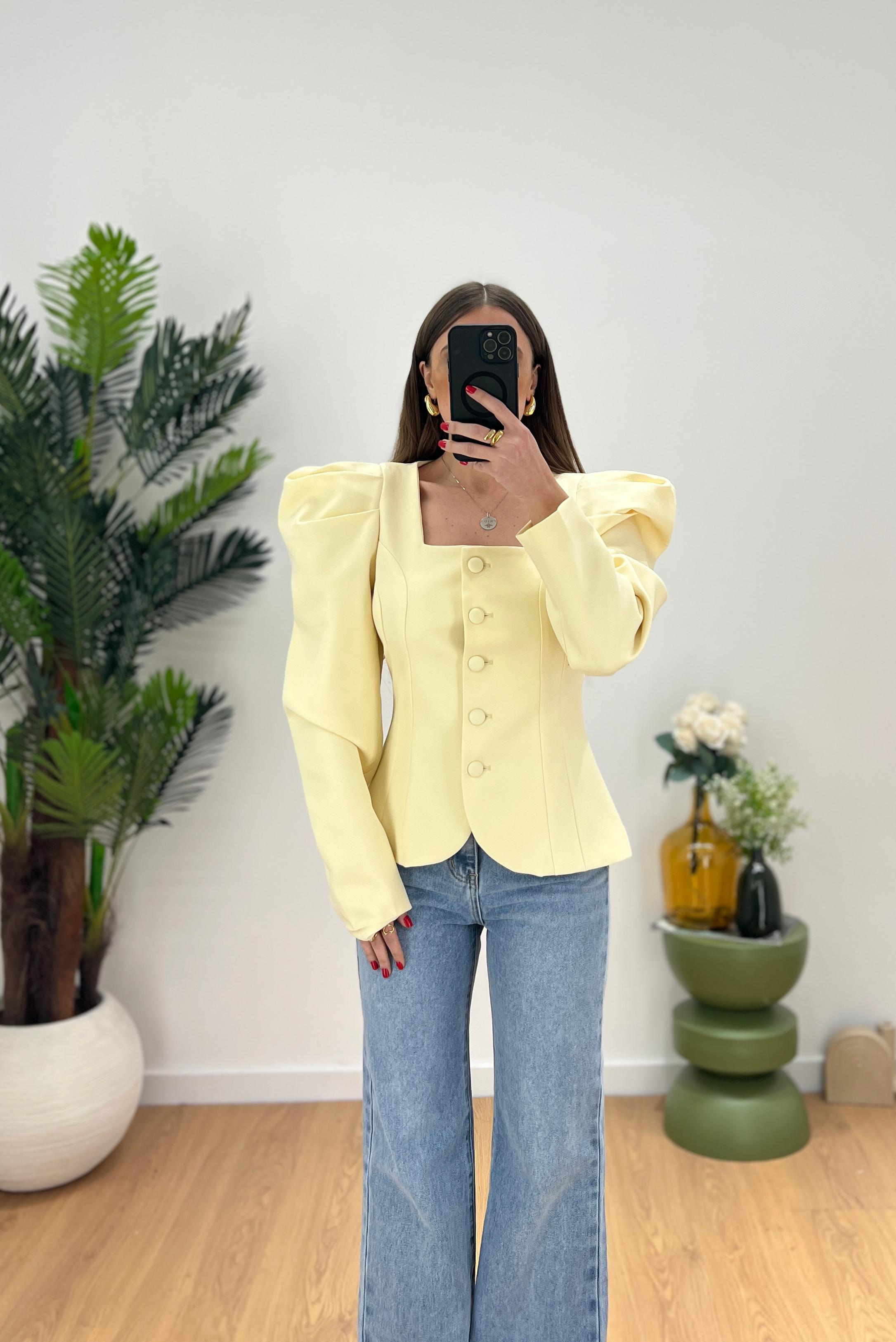 Giacca da donna con scollo quadrato sul davanti e chiusura con bottoncini rivestiti e particolarità con spalle a buffo, veste regolarmente la propria taglia e giusy indossa taglia S