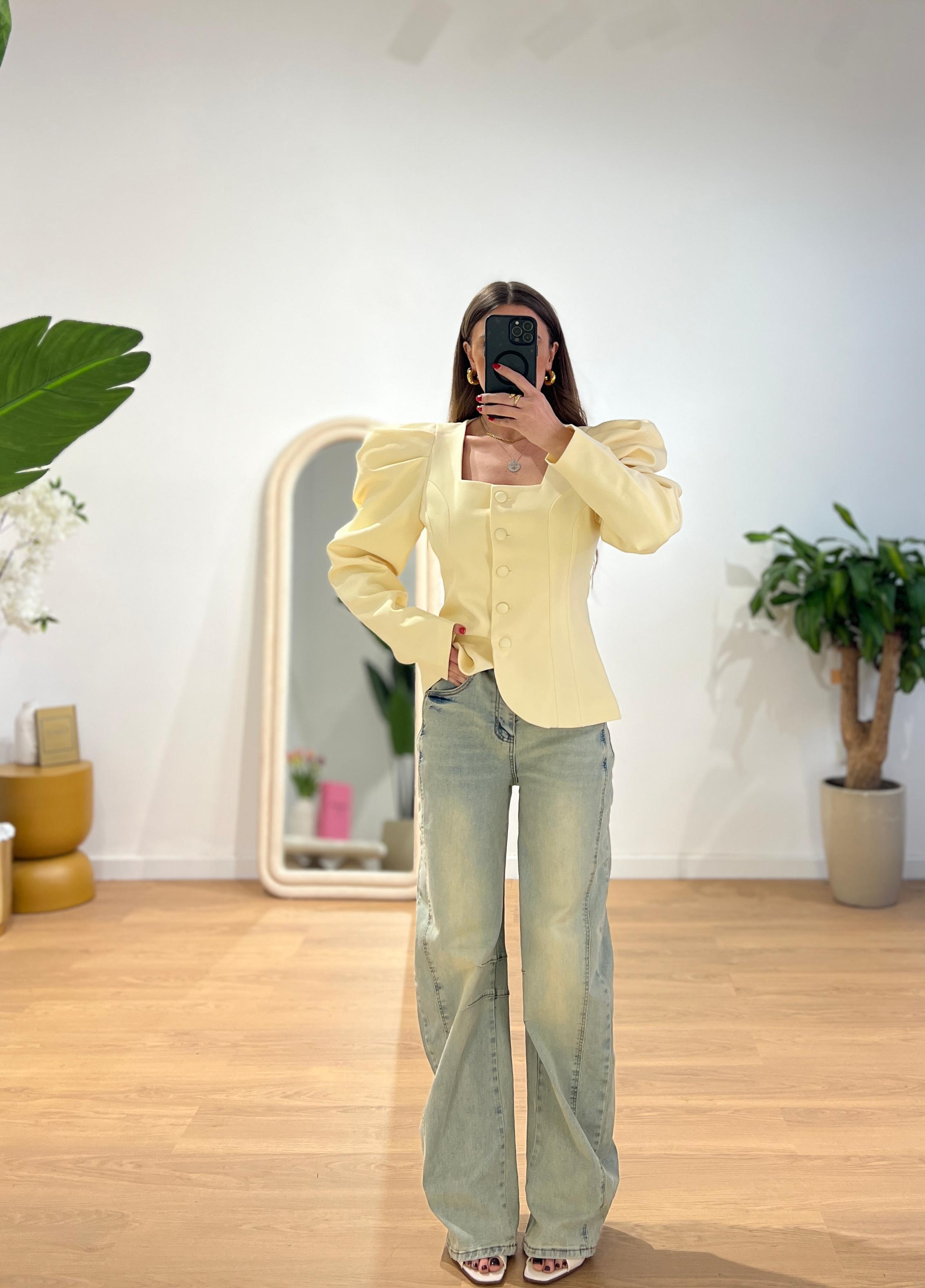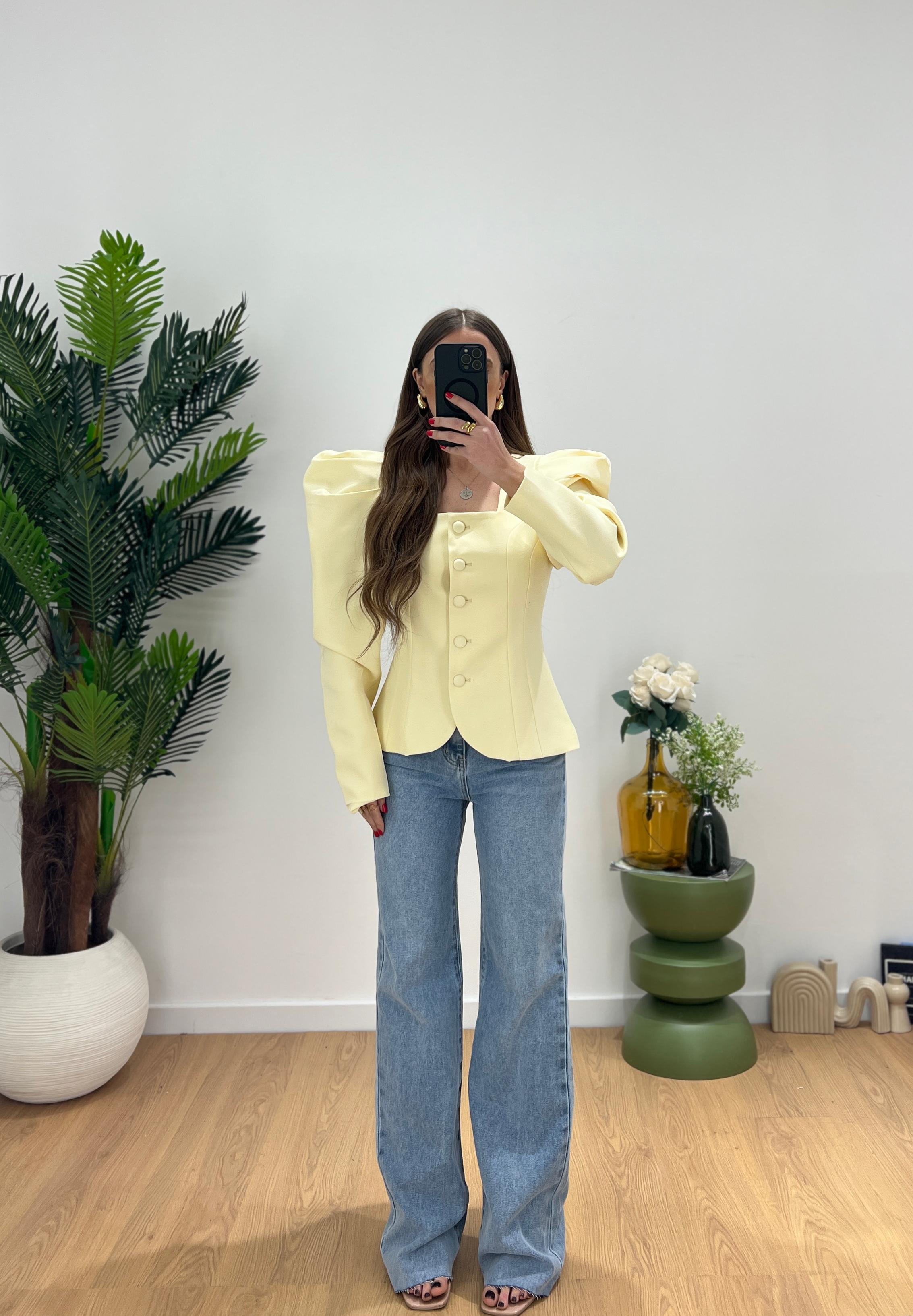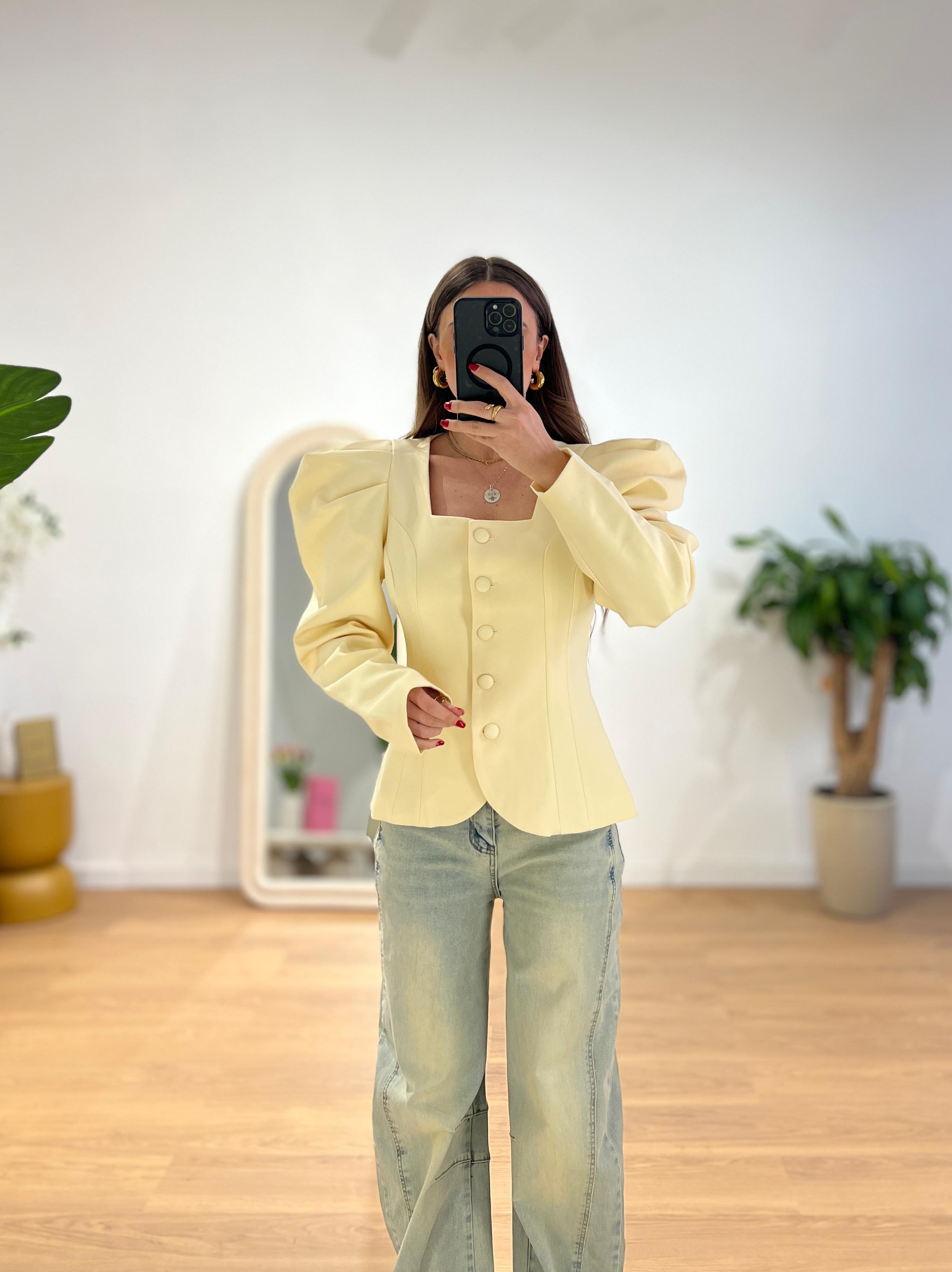 Giacca da donna con scollo quadrato sul davanti e chiusura con bottoncini rivestiti e particolarità con spalle a buffo, veste regolarmente la propria taglia e giusy indossa taglia S