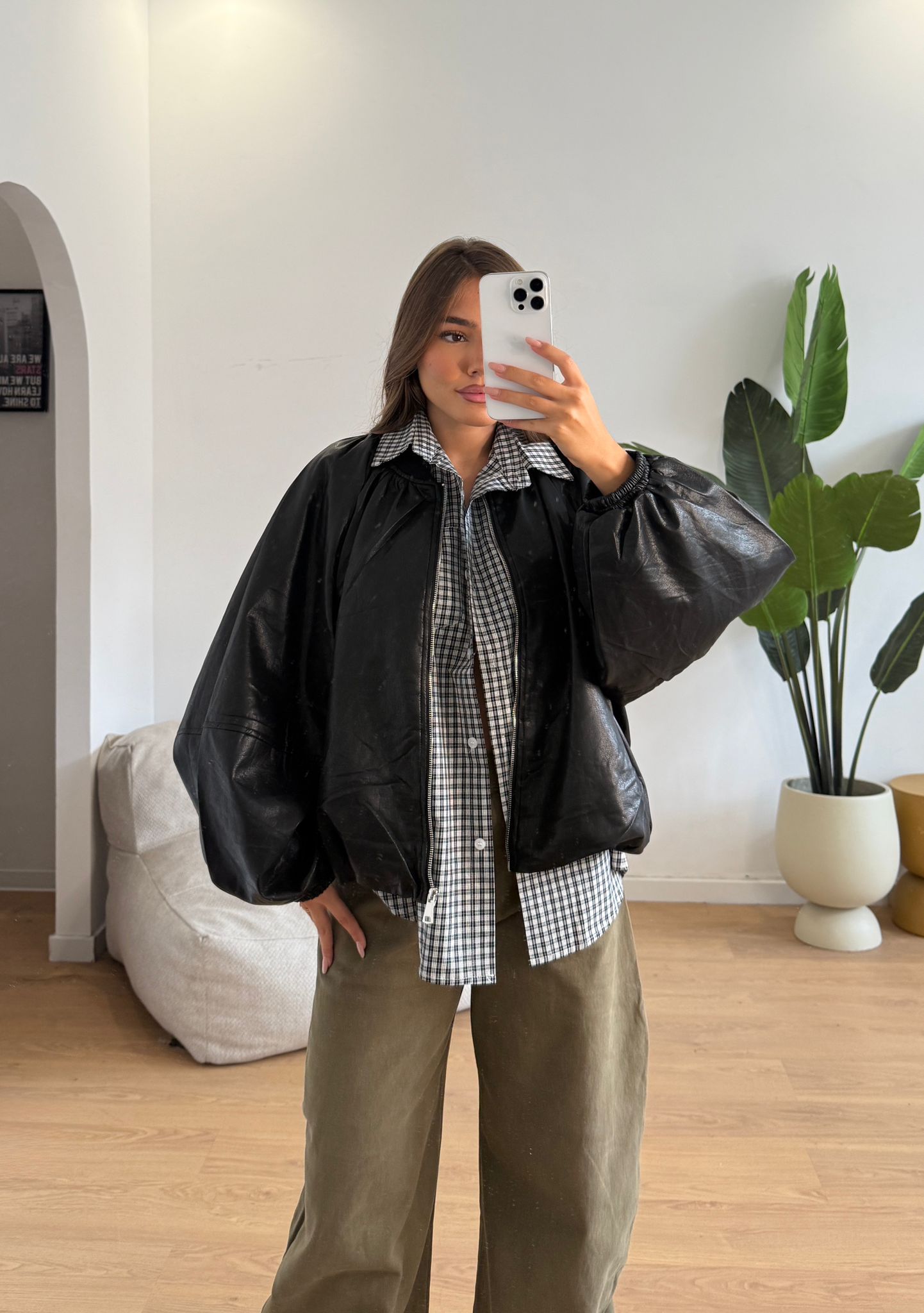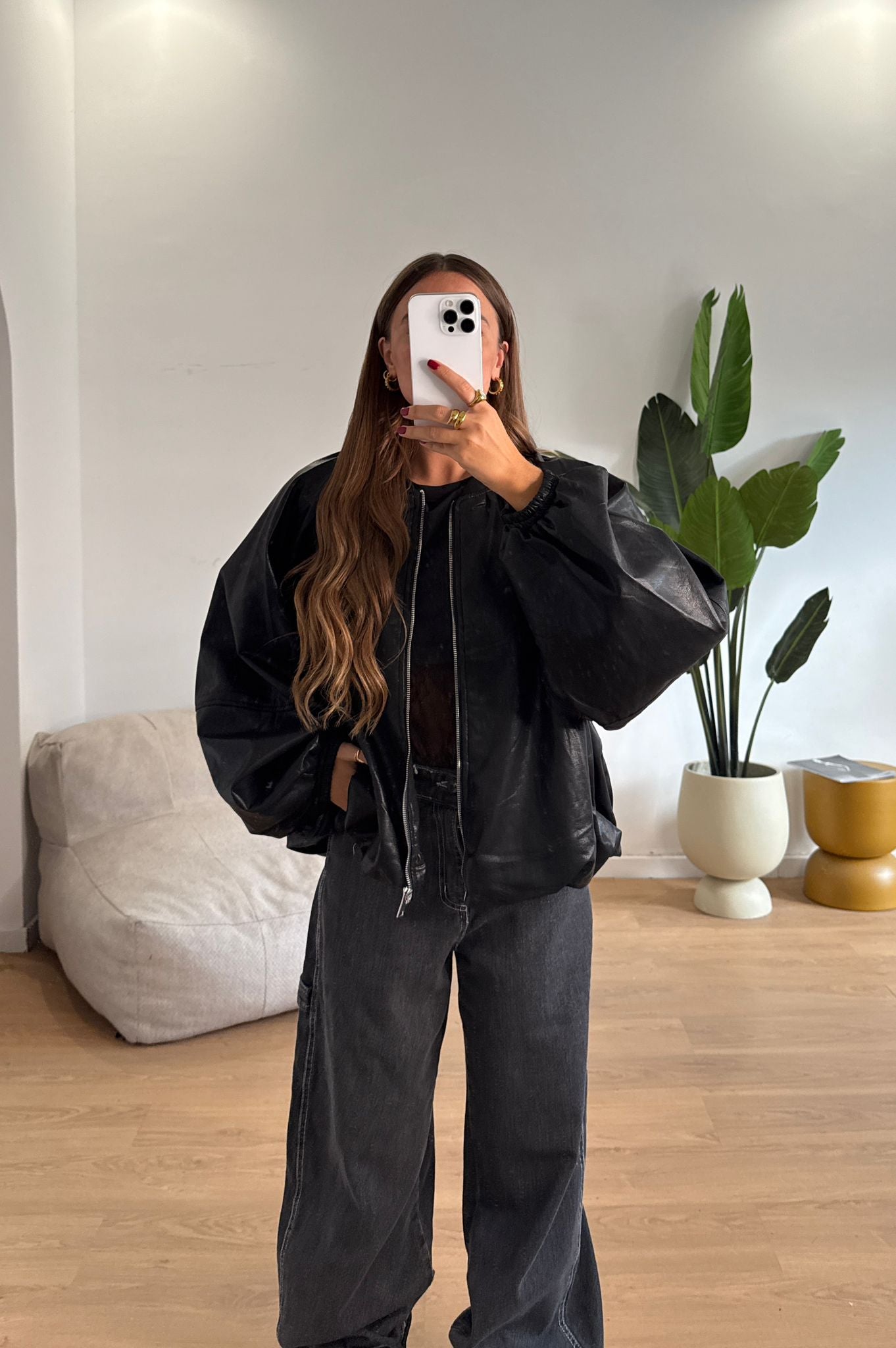 Giubbino da donna in ecopelle con chiusura zip sul davanti. Taglia unica, veste bene fino ad una 46.