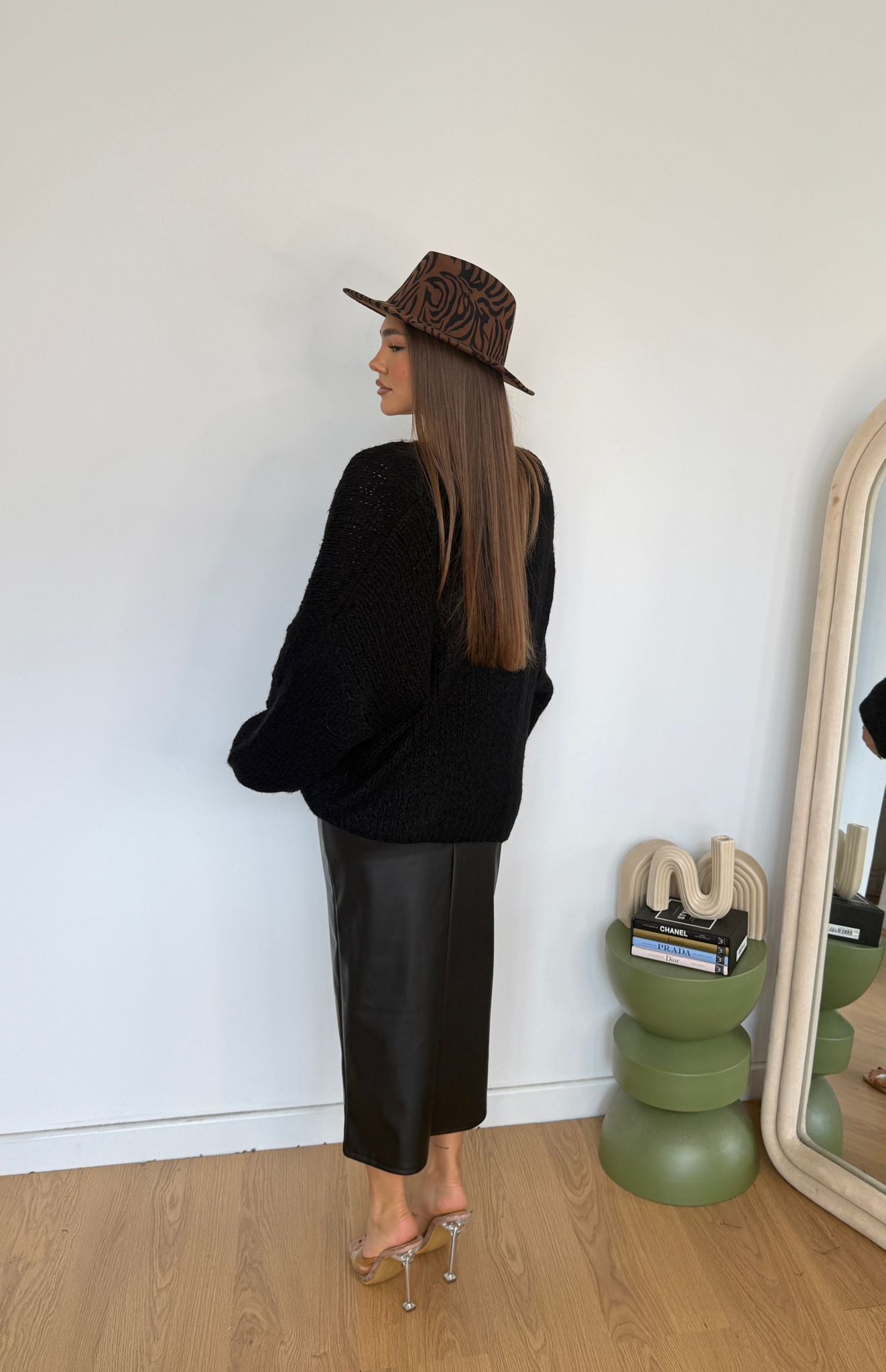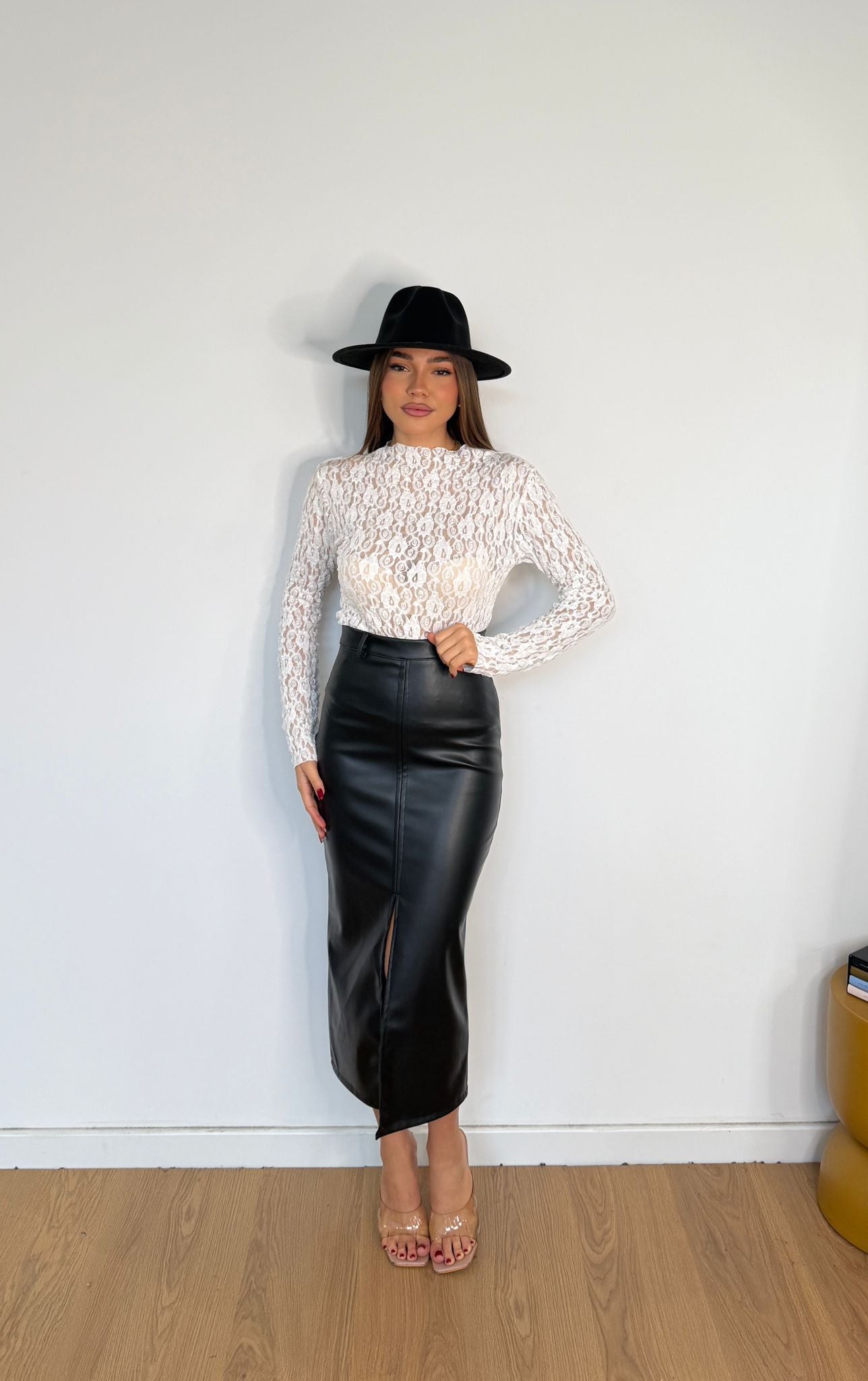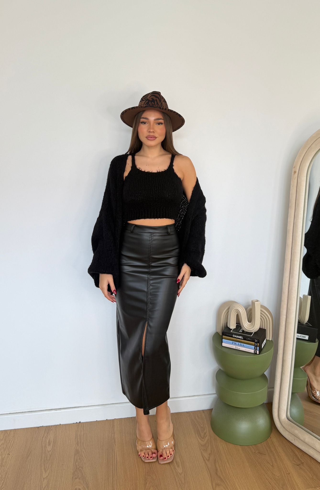 Gonna da donna in ecopelle con chiusura zip sul retro tessuto leggermente elasticizzato e veste regolarmente la propria taglia e la modella indossa taglia S
