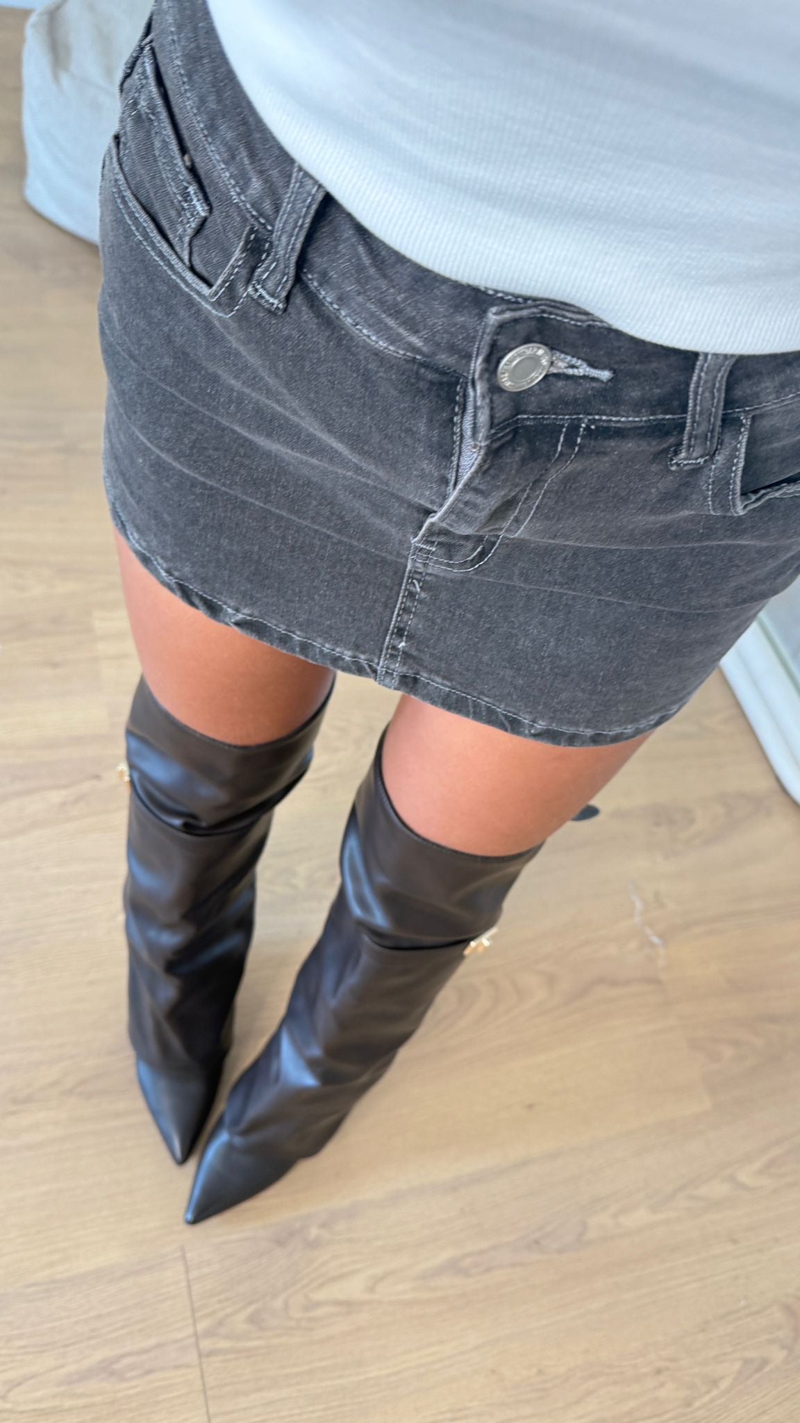 Mini ganna da donna in denim tessuto elasticizzato con shorts interno e veste regolarmente la propria taglia e la modella indossa taglia XS