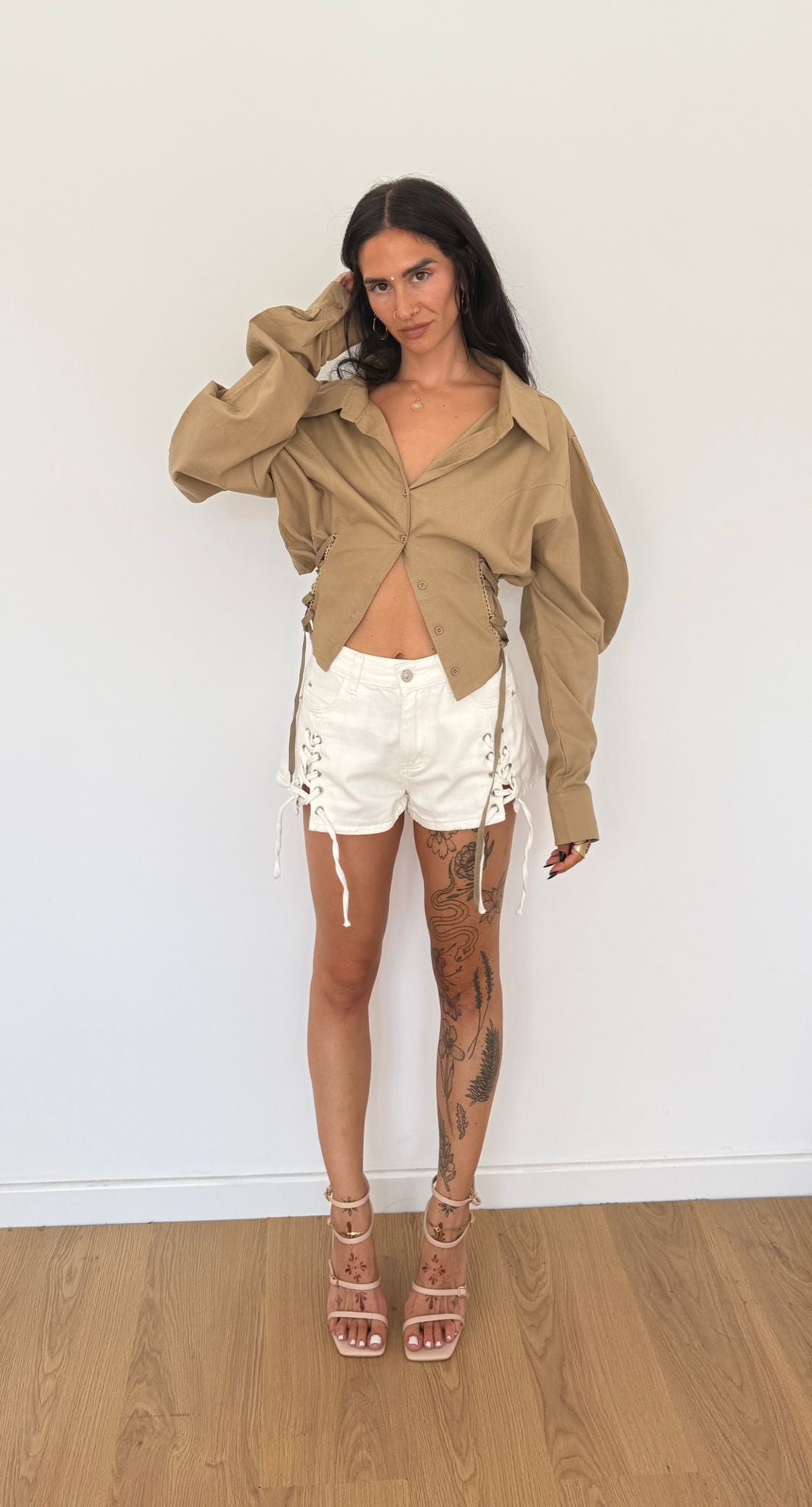 Shorts da donna in tela fissa, non elasticizzato, con intreccio sul davanti. La modella indossa taglia S e veste regolarmente la propria taglia.