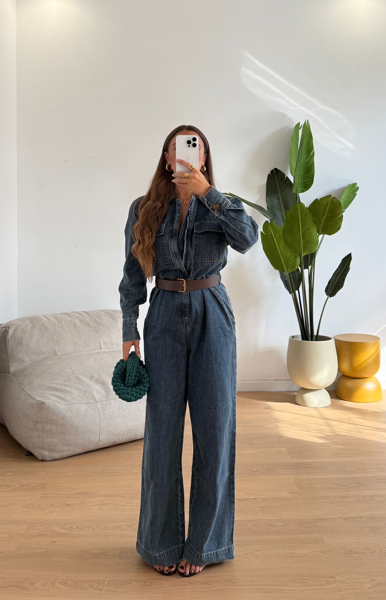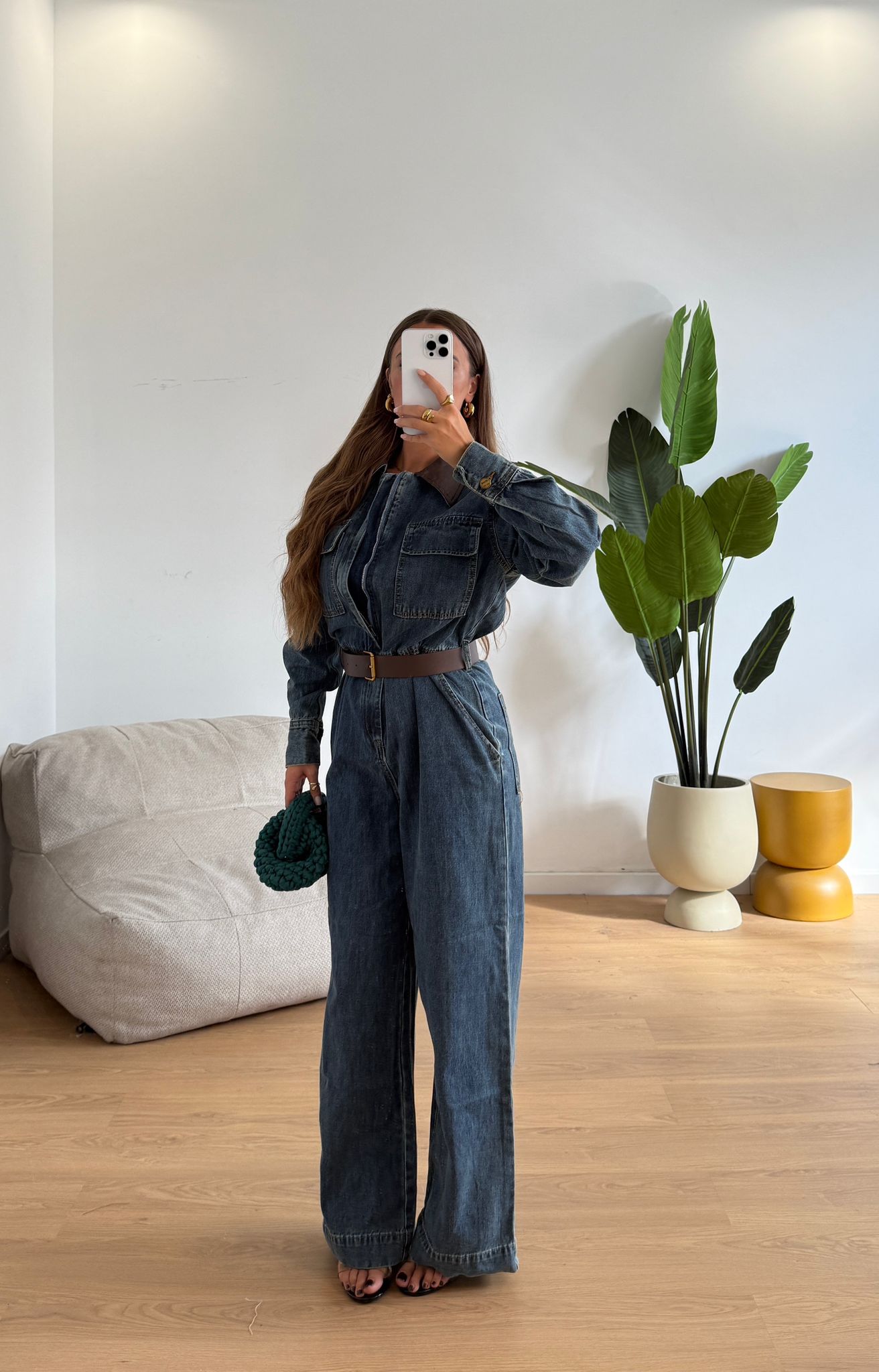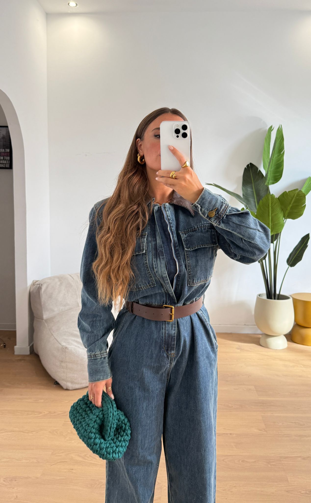 Tuta da donna in denim, tessuto in tela rigida con chiusura zip sul davanti e veste regolarmente la propria taglia. In foto indossa taglia S/M.
