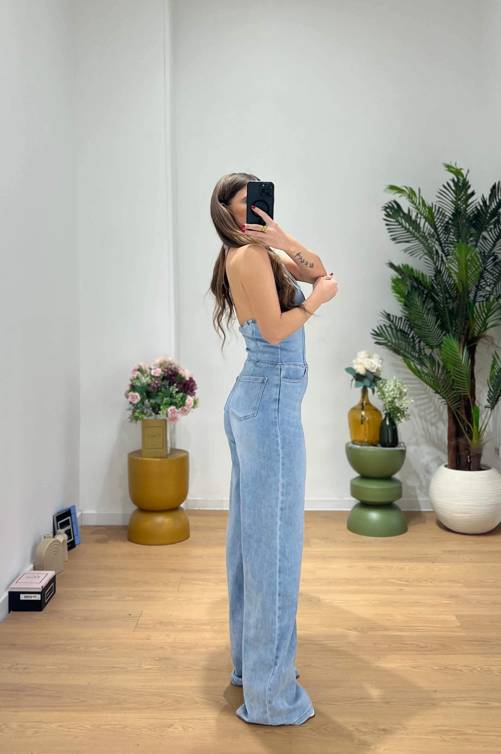 Tuta da donna a palazzo in denim chiaro tessuto elasticizzato con zip sul davanti e veste regolarmente la propria taglia e Giusy indossa taglia S