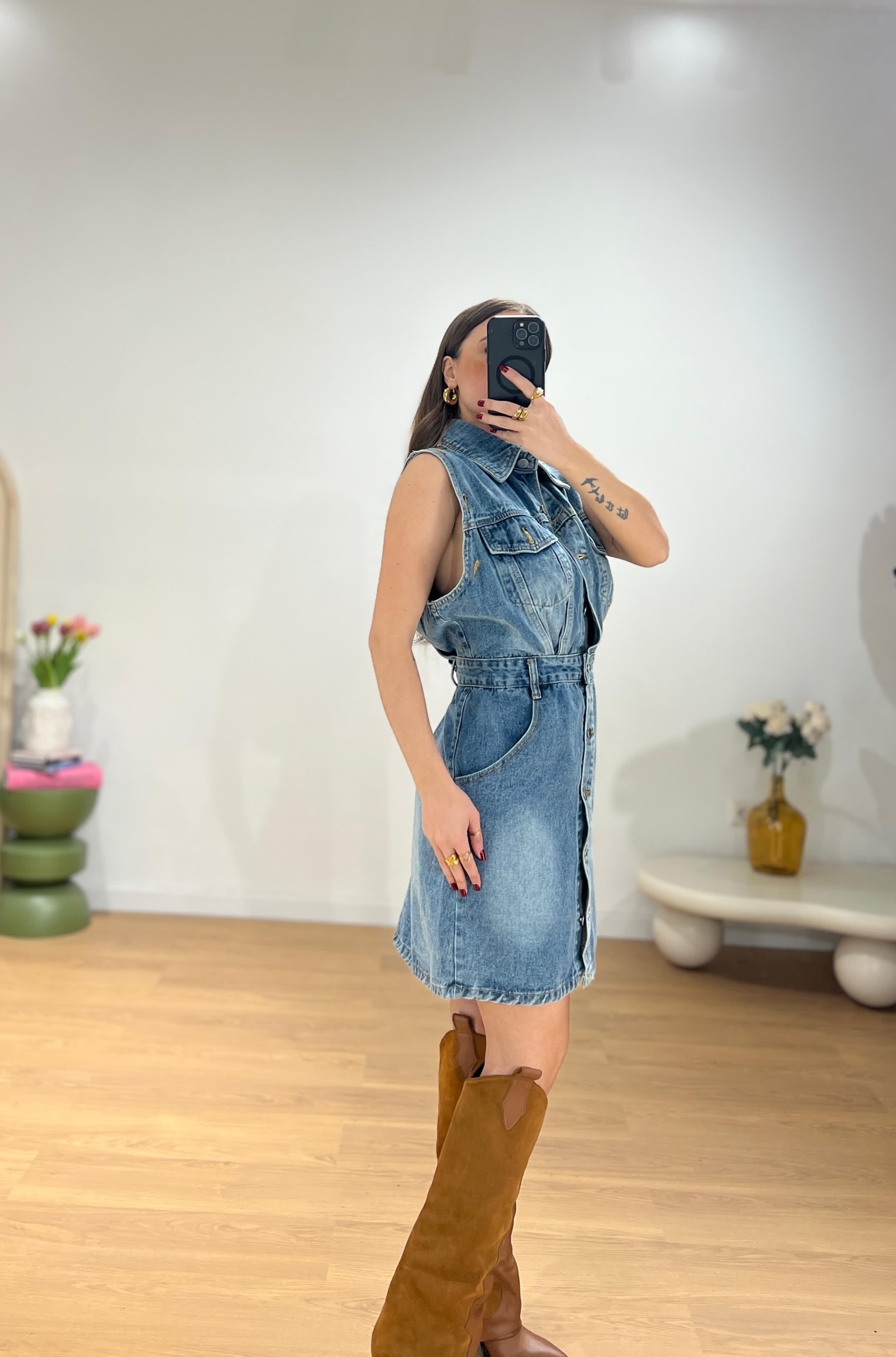 Vestitino da donna in denim con maniche rimovibili e veste regolarmente la propria taglia e Giusy indossa taglia S/M