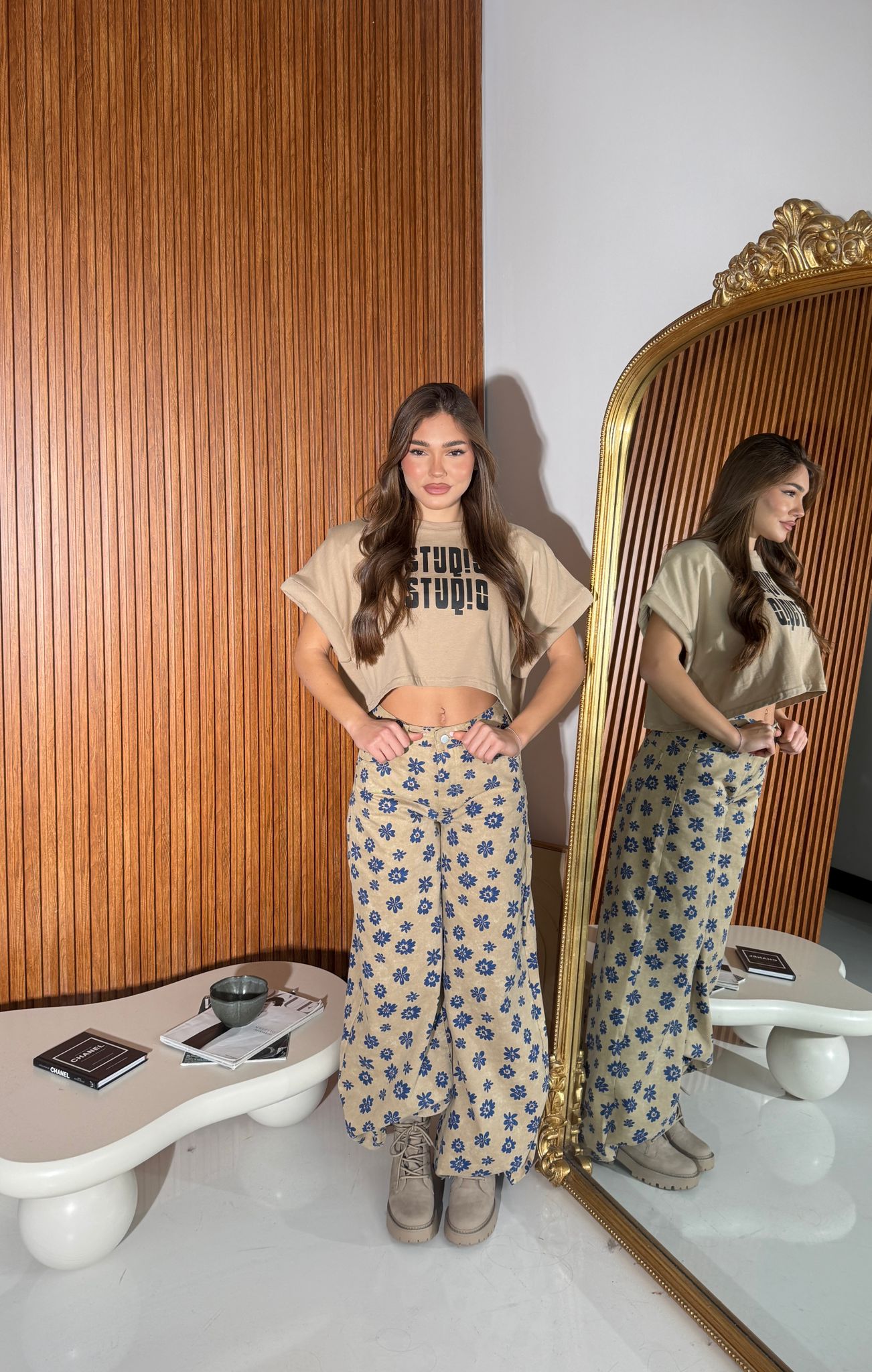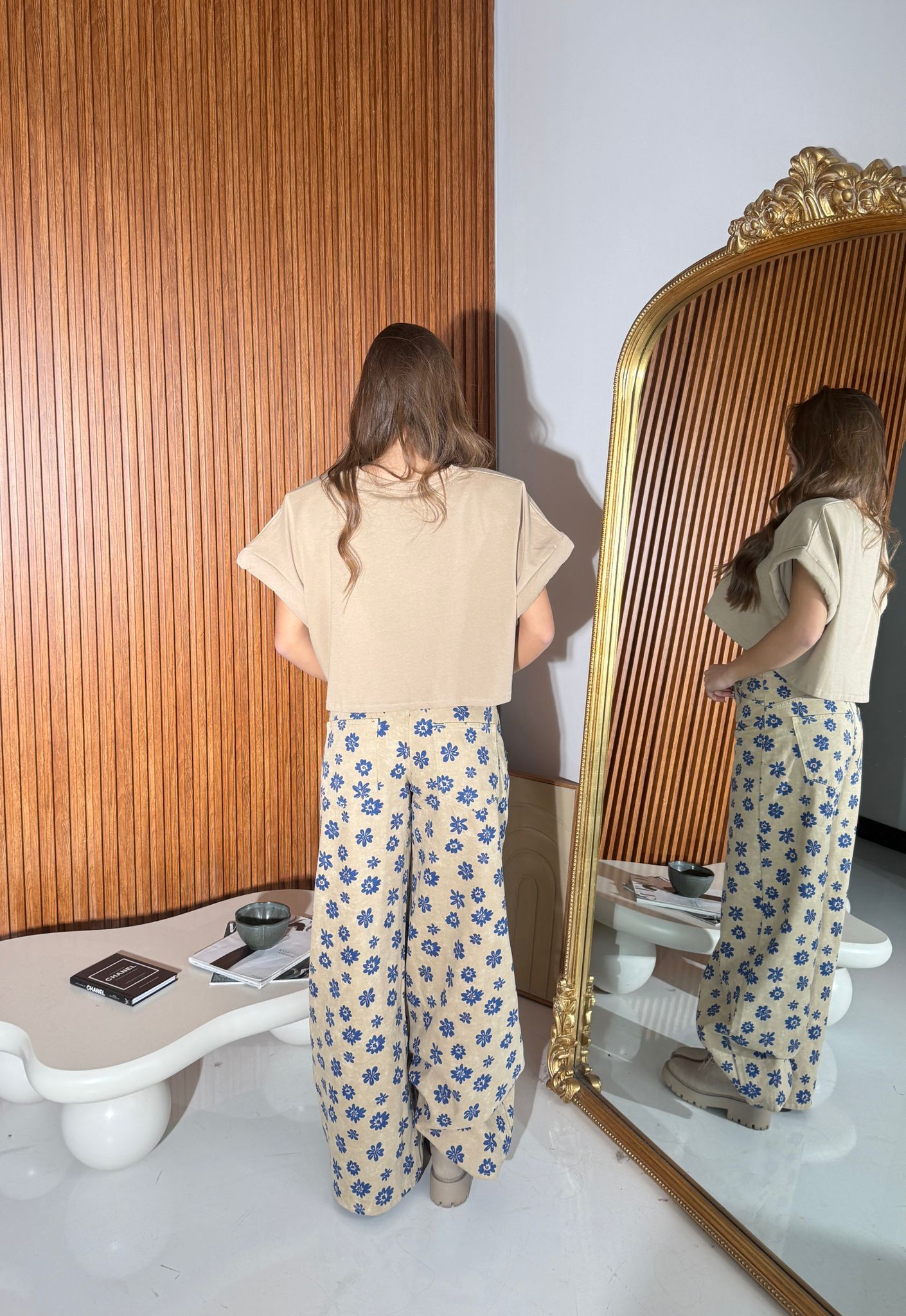 Jeans da donna a fantasia fiori modello a gamba larga con tasche, tessuto tela fissa non elasticizzato e veste bene la propria taglia. La modella indossa taglia S ed è alta 1,65 e pesa 52/53 KG.