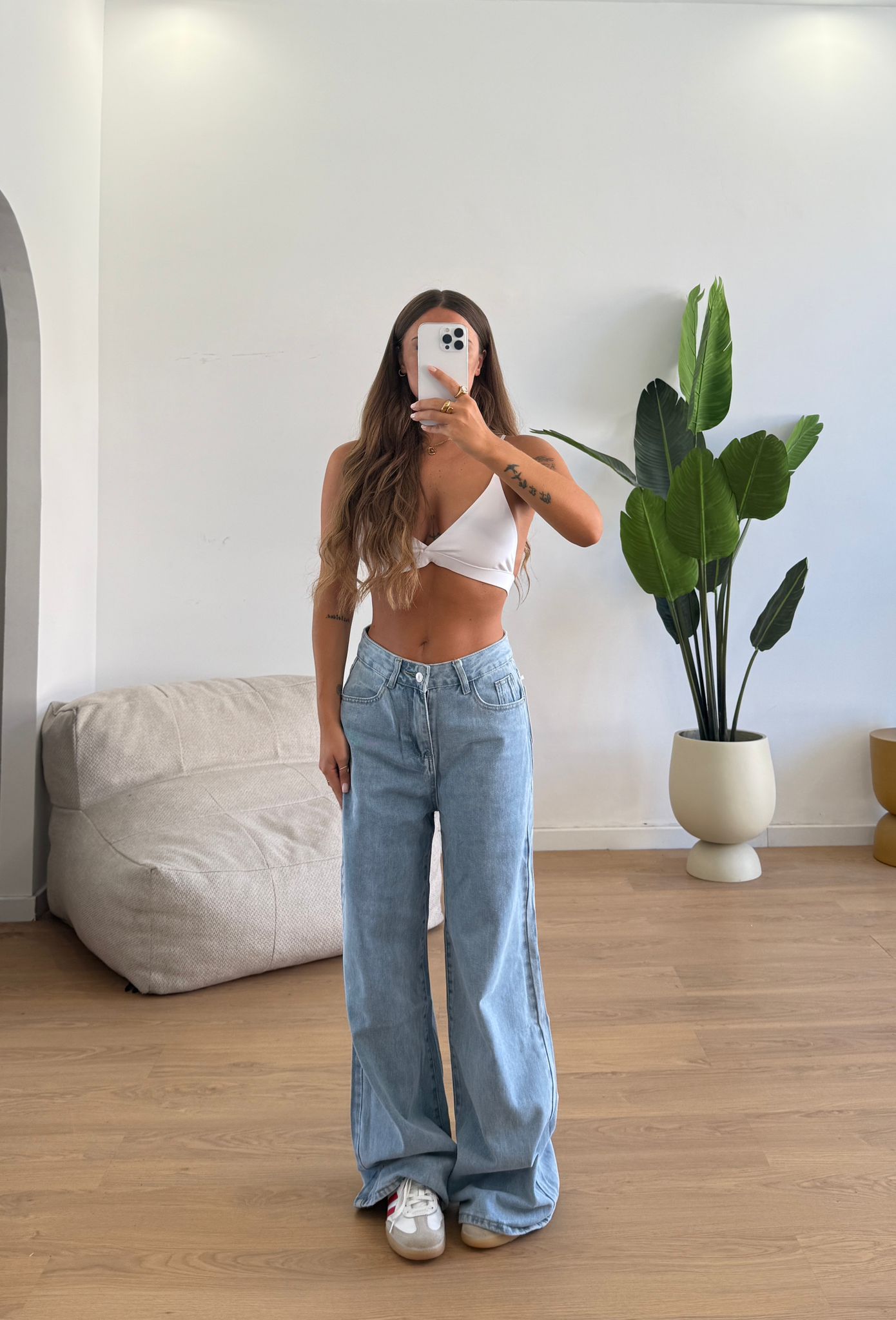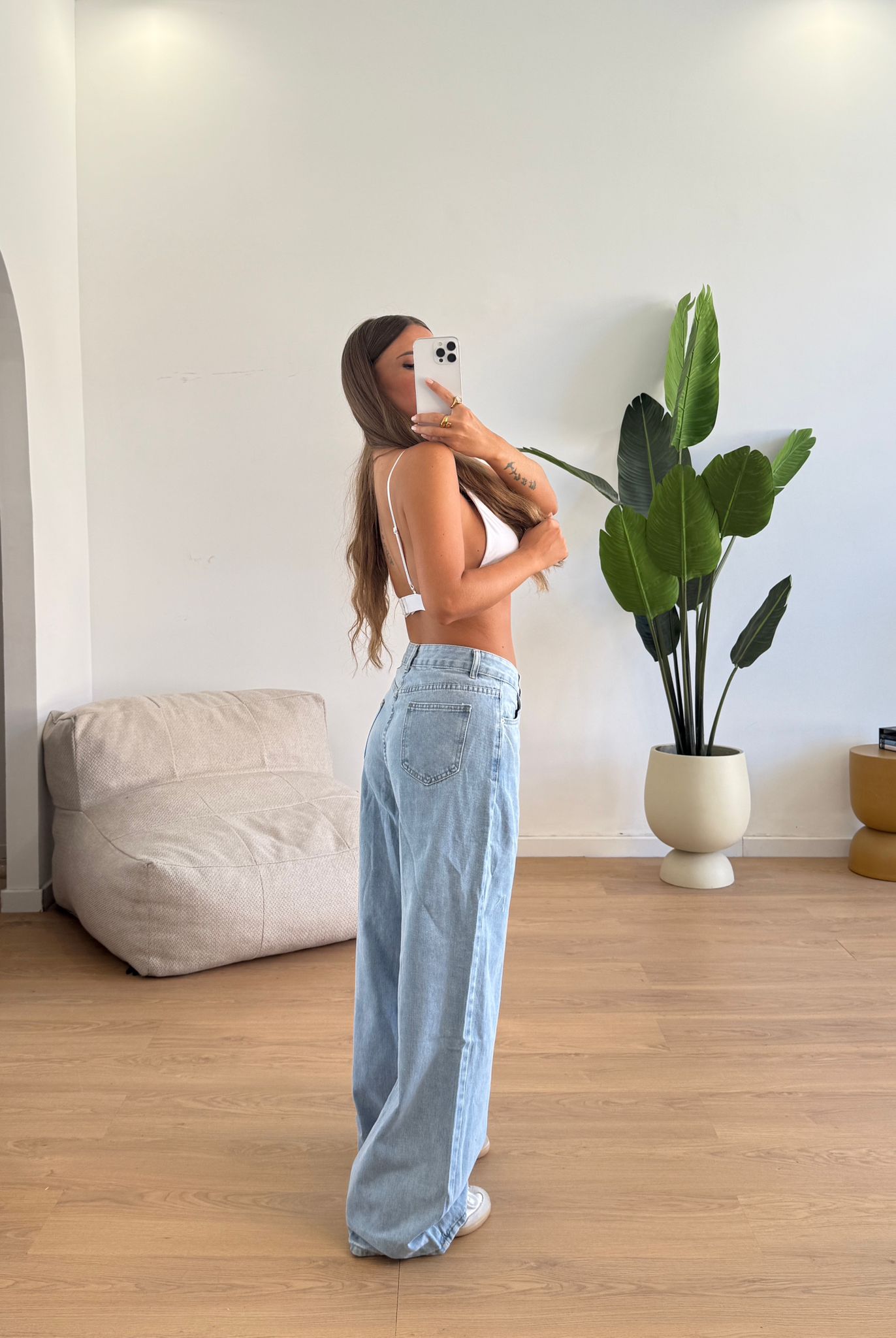 Jeans da donna in denim chiaro tessuto tela rigida e veste regolarmente la propria taglia e la modella indossa taglia S