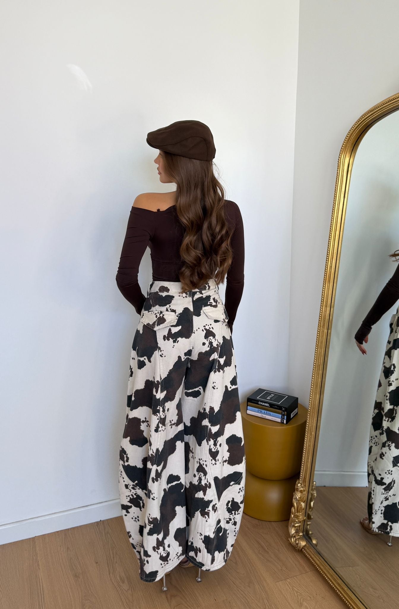 Jeans da donna fantasia COW in tela fissa e veste regolarmente la propria taglia e la modella indossa taglia S