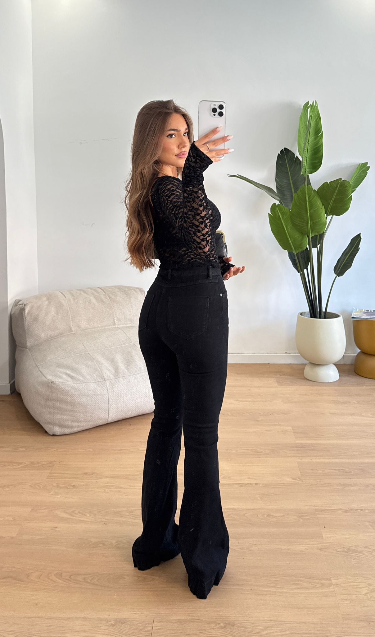 Jeans da donna a zampetta tessuto elasticizzato, vita alta e push-up sul retro, veste regolarmente la propria taglia e Giusy indossa taglia Xs