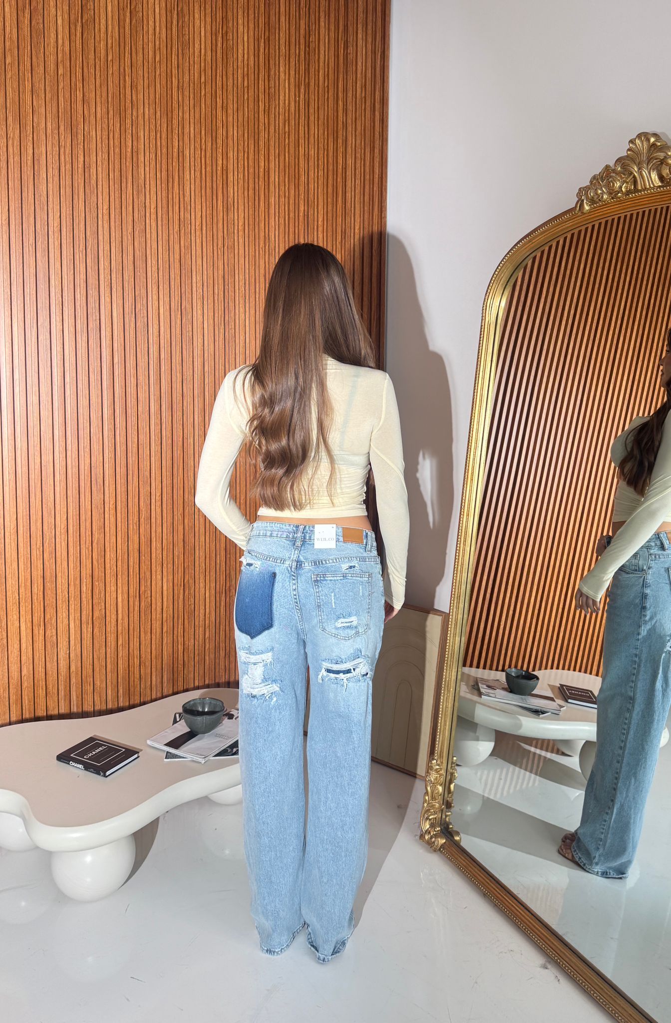 Jeans da donna in denim tessuto semi elasticizzato, modello wide-leg a vita alta e veste regolarmente la propria taglia, la modella indossa taglia M per ottenere un risultato più morbido.
