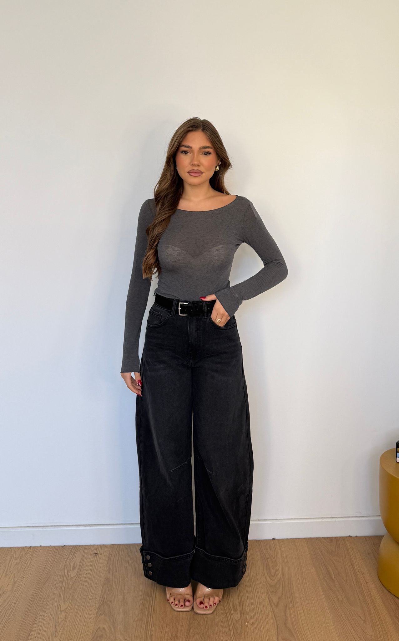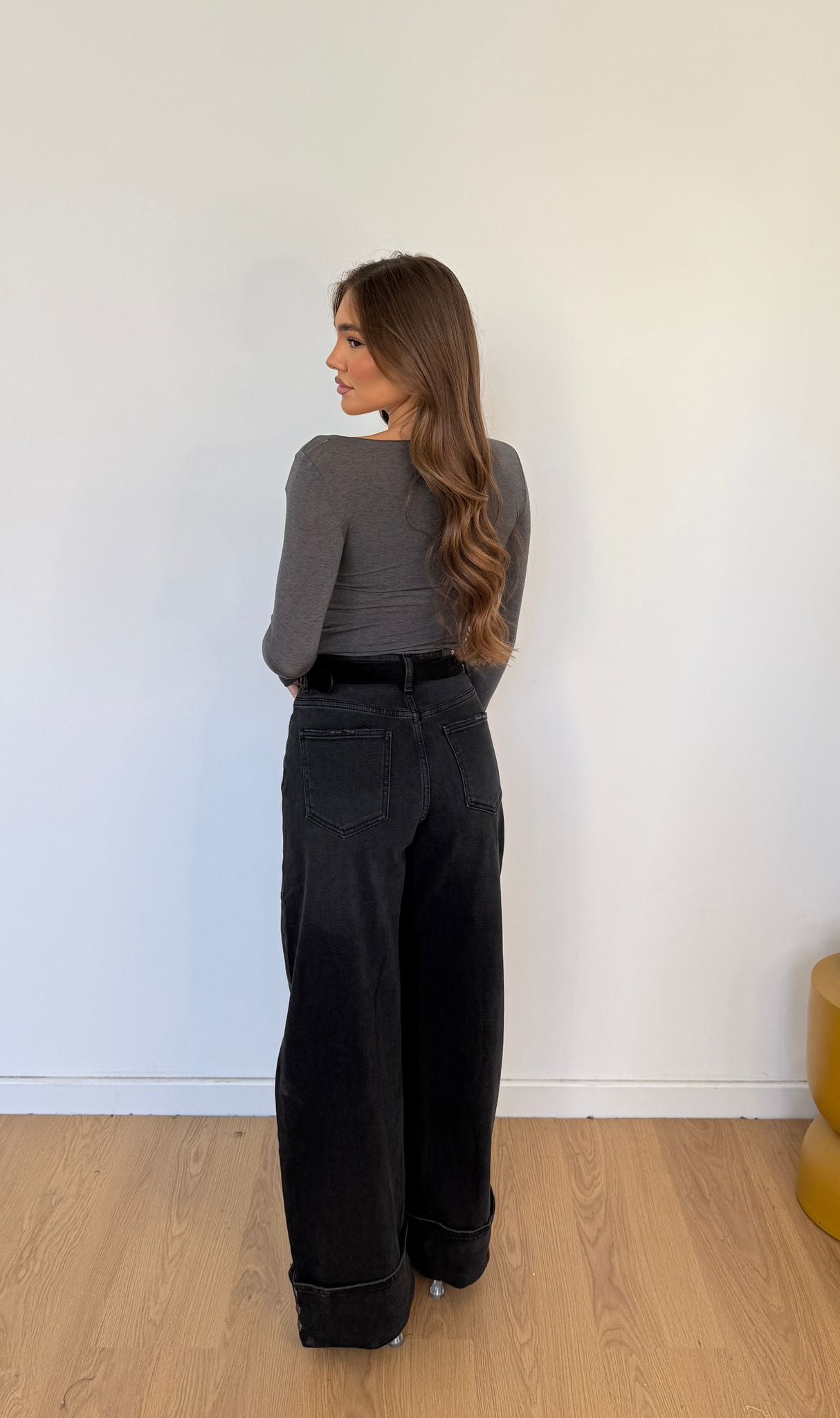 Jeans da donna in denim nero tessuto semi elasticizzato con cintura compresa e piegoni sul finale cucite e veste regolarmente la propria taglia e la modella indossa taglia XS