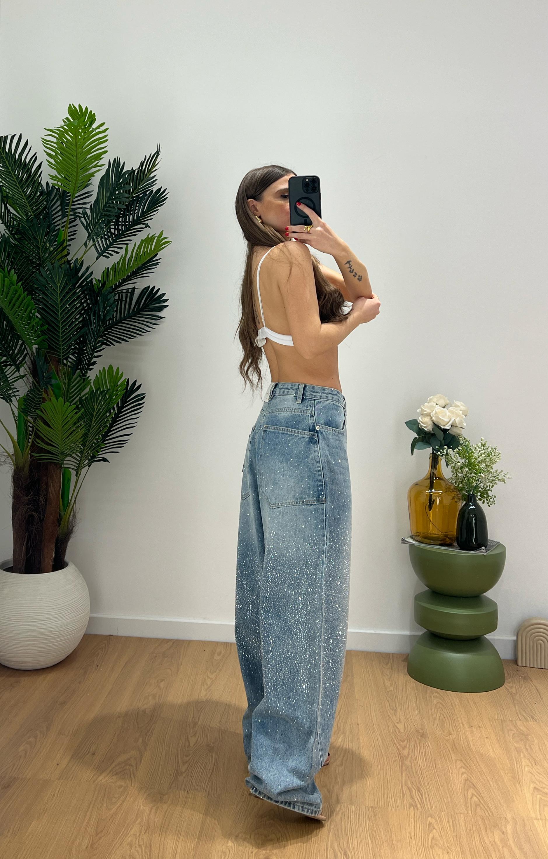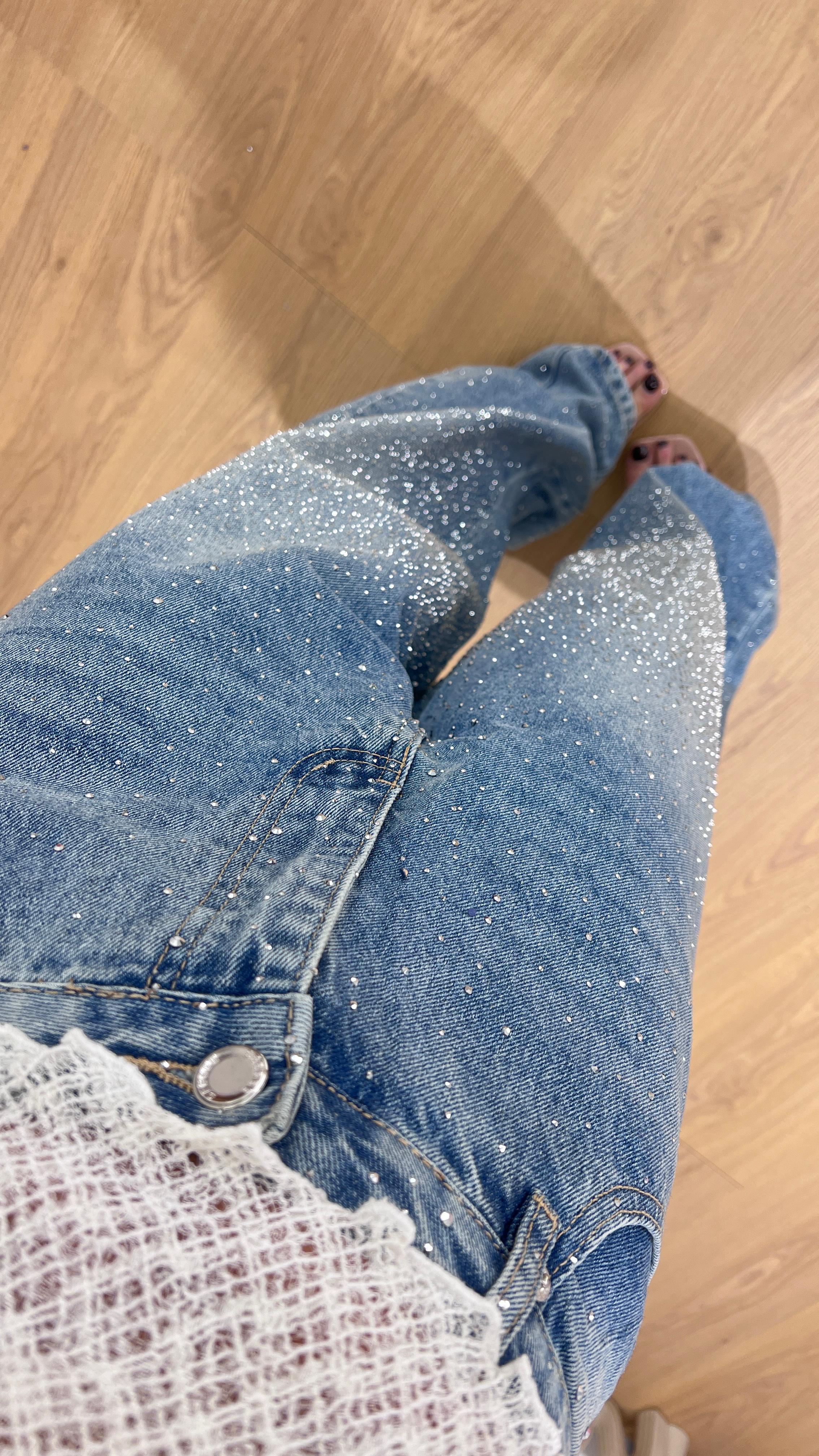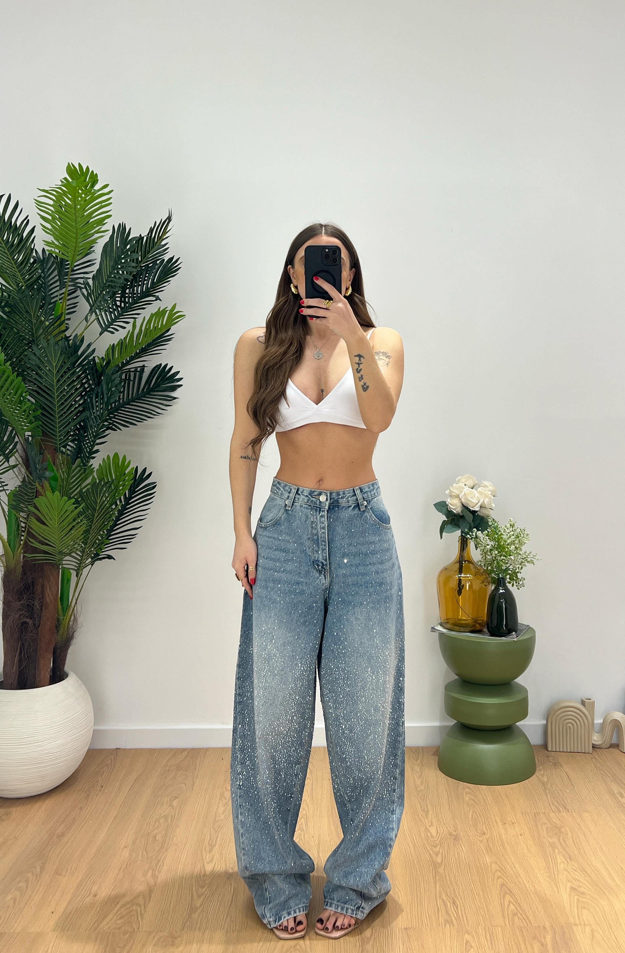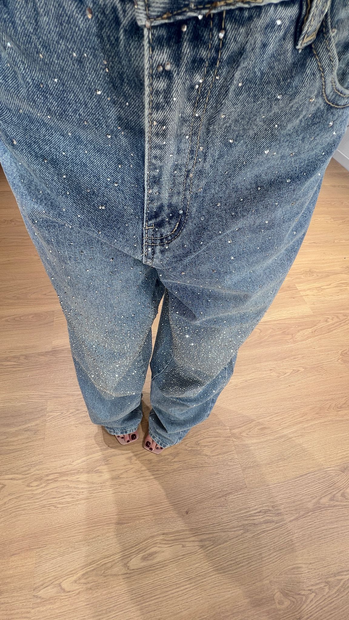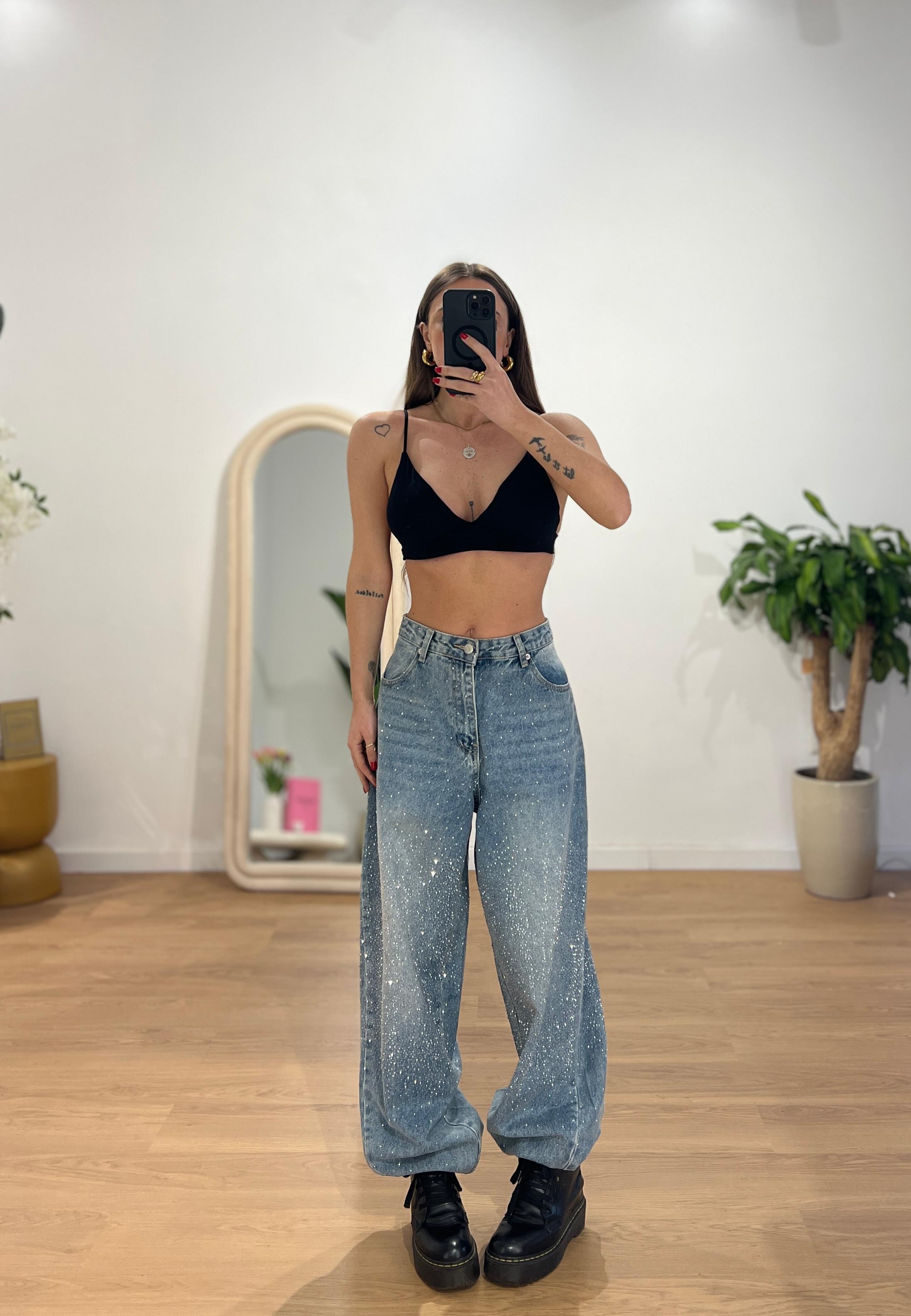 Jena s da donna in tela fissa non elasticizzato ricoperto di brillantini sia sul davanti cge sul retro, modello baggy ma veste regolarmente la propria taglia e giusy indossa taglia XS