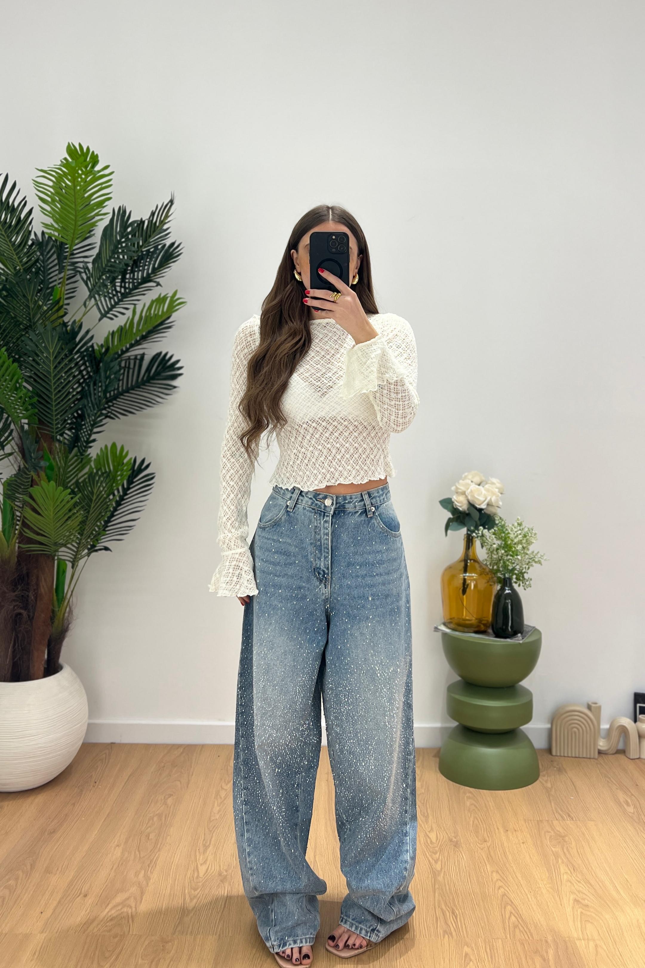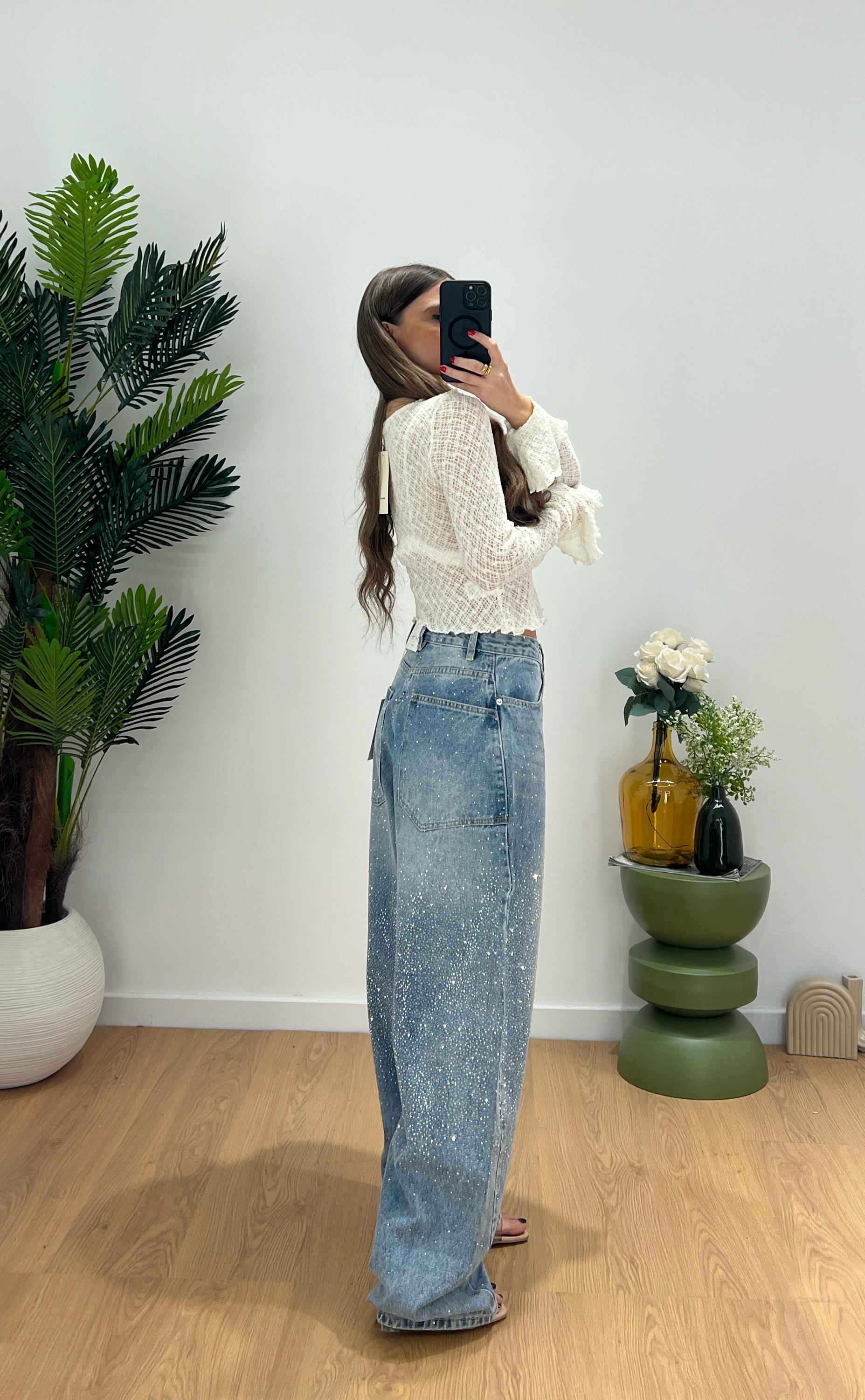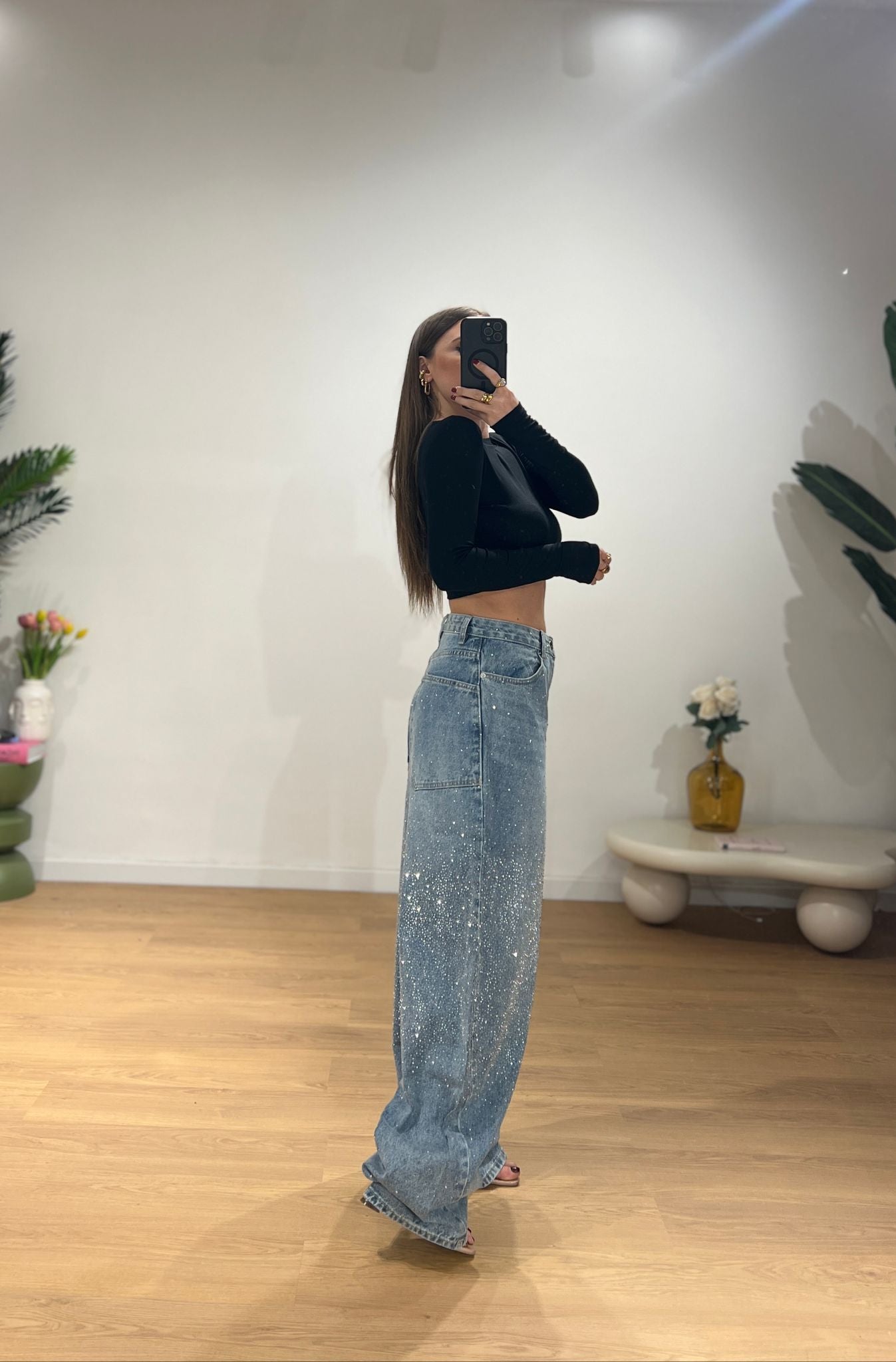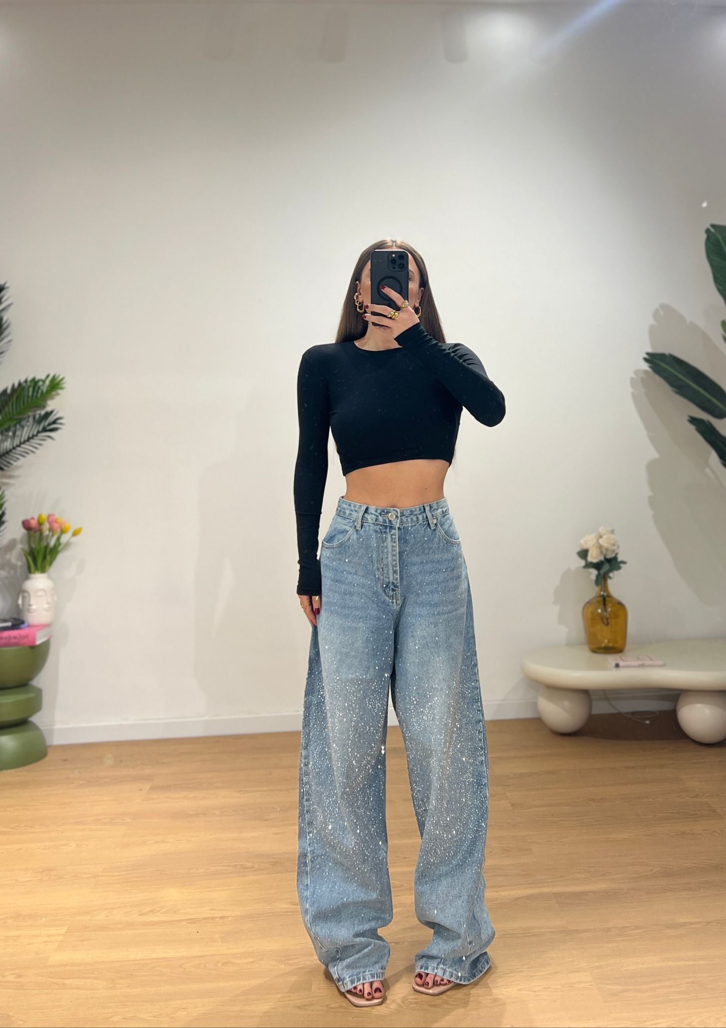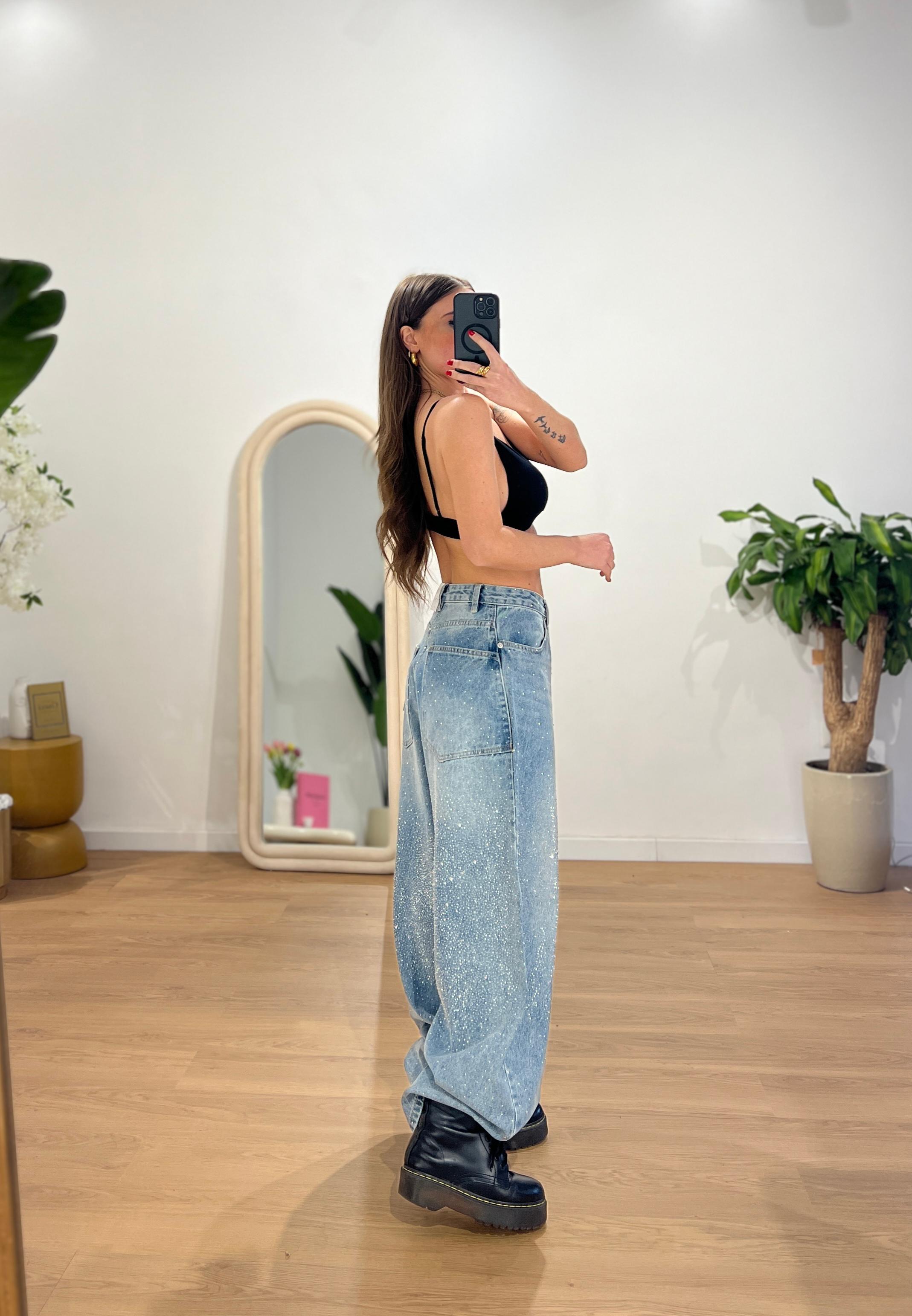 Jena s da donna in tela fissa non elasticizzato ricoperto di brillantini sia sul davanti cge sul retro, modello baggy ma veste regolarmente la propria taglia e giusy indossa taglia XS