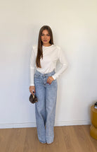 Jeans da donna in denim chiaro modello wide-leg in tela fissa non elasticizzato e veste regolarmente la propria taglia e la modella indossa taglia XS