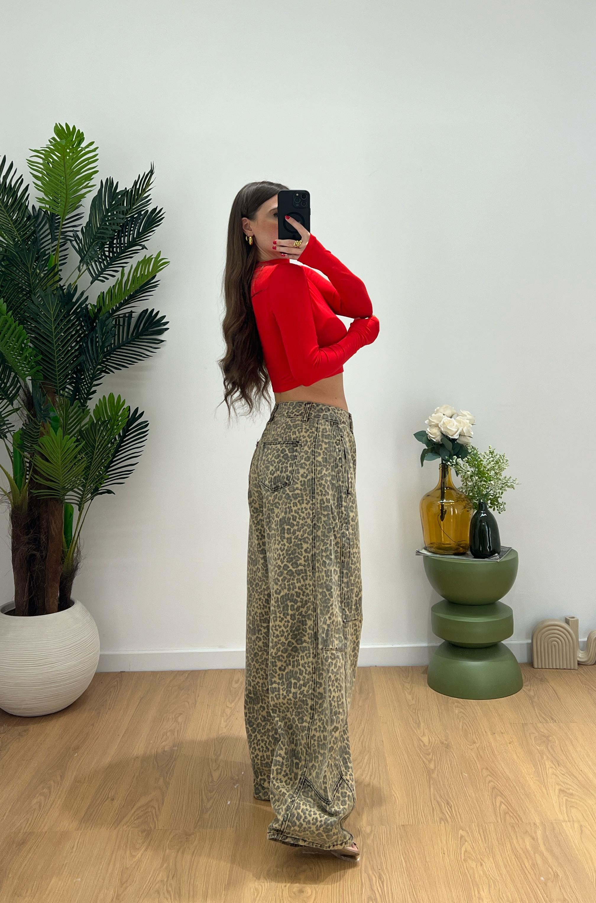 Jeans da donna in tela fissa modello ballon fit fantasia leopradata, veste regolarmente la propria taglia e giusy indossa taglia XS