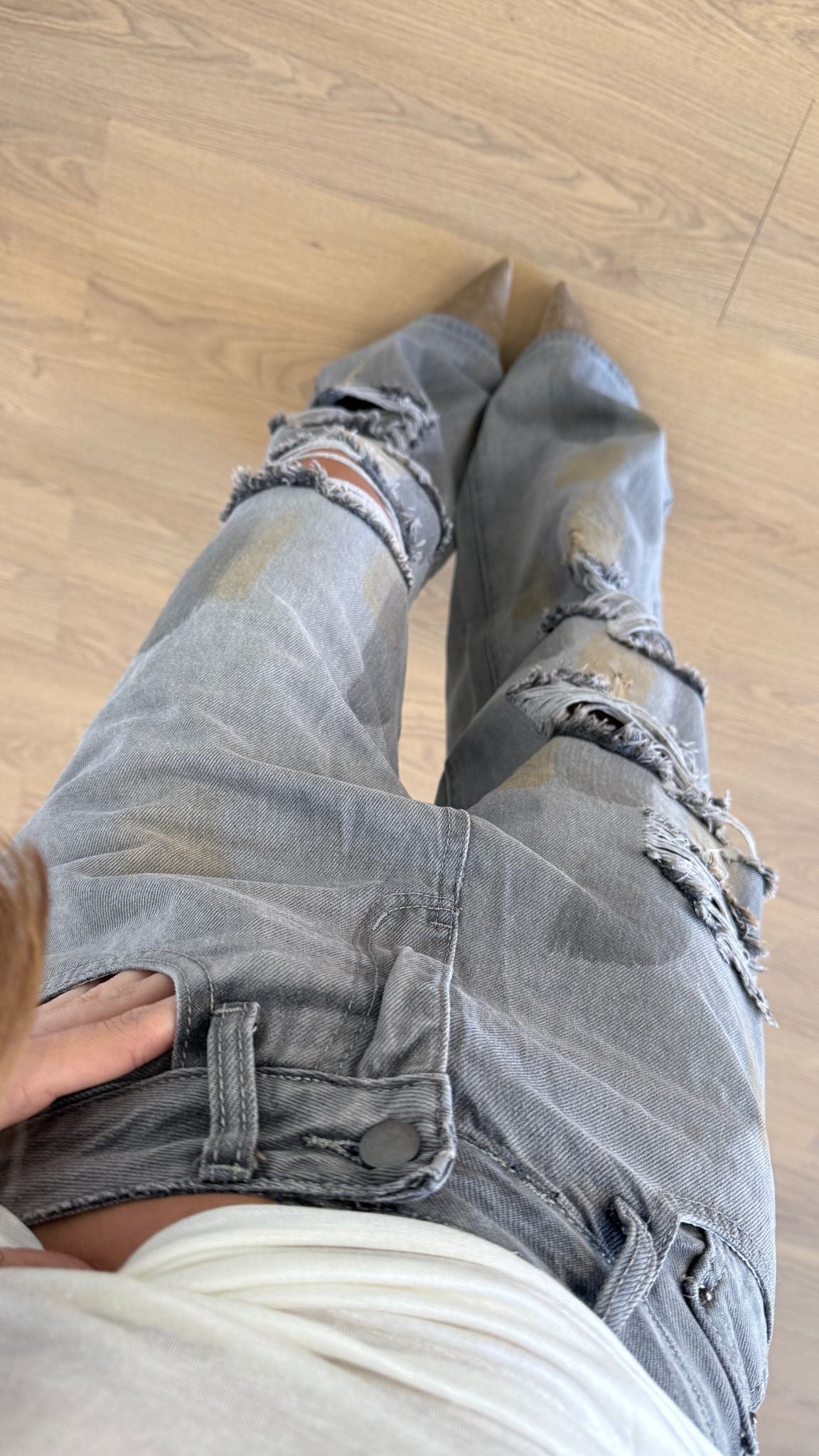 Jeans da donna in denim grigio in tela fissa non elasticizzato ma veste regolarmente la propria taglia e la modella indossa taglia S
