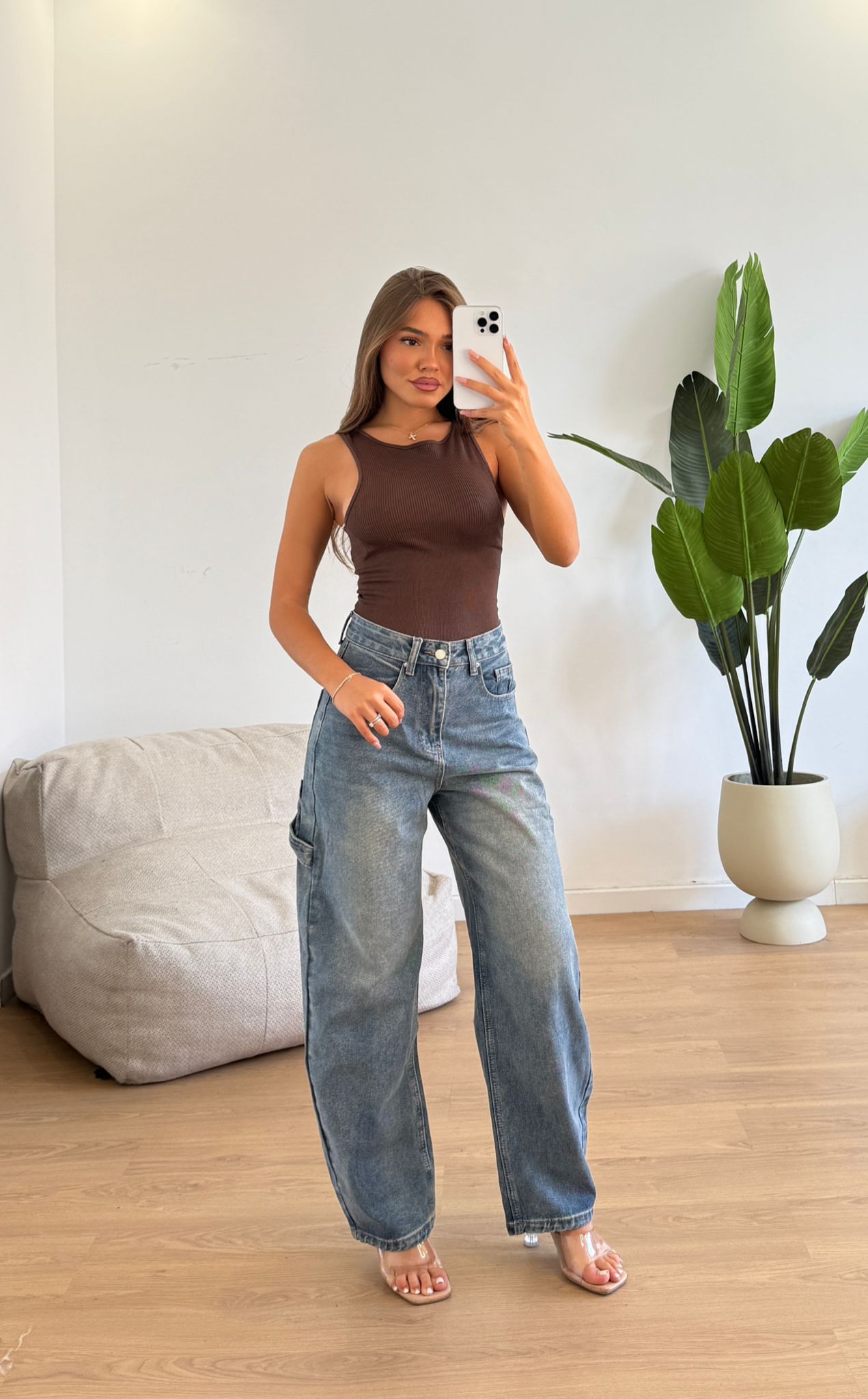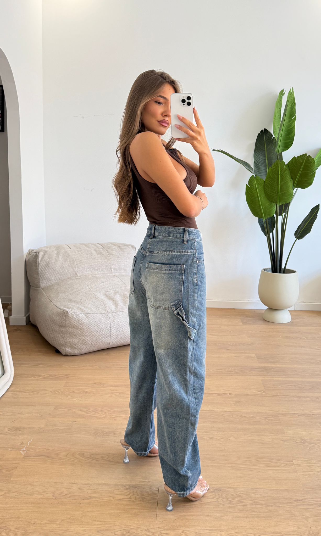 Jeans da donna in denim modello carpet in tela fissa ma veste regolarmente la propria taglia e la modella indossa taglia XS