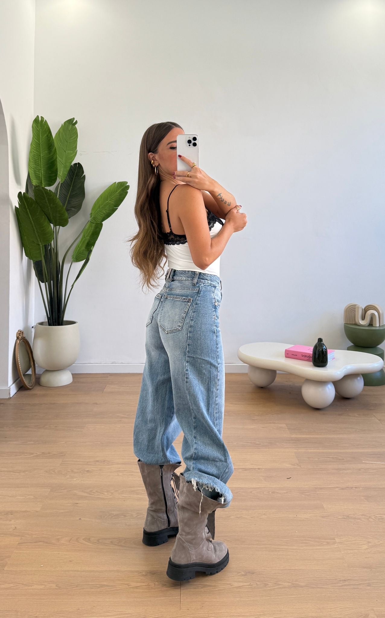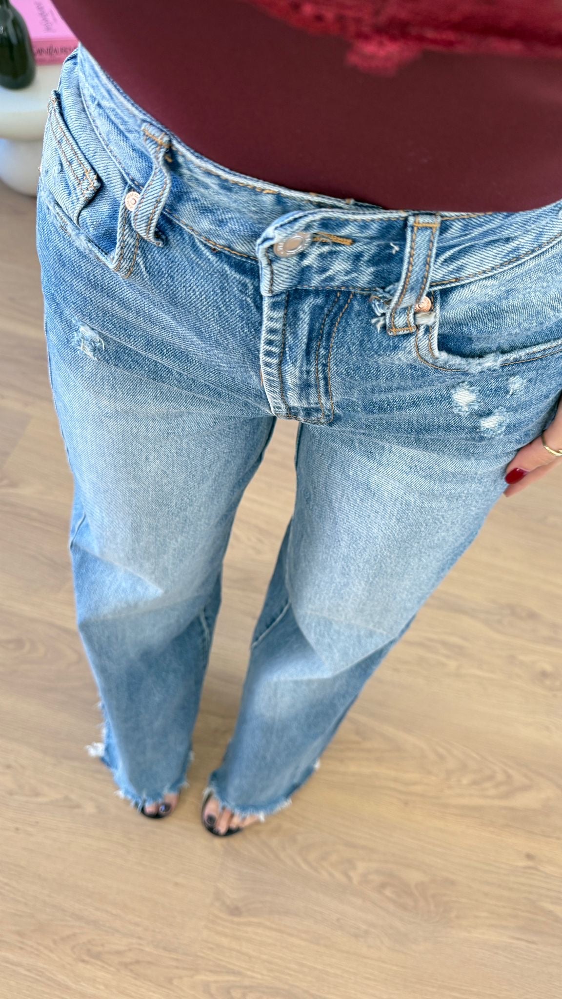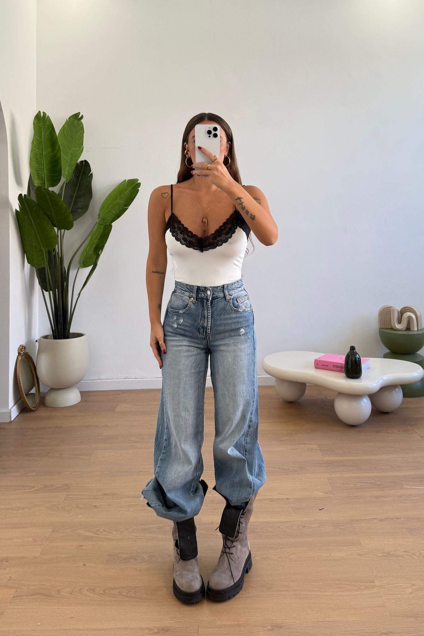 Jeans da donna in denim tessuto semi elasticizzato sfregiato sul finale ma veste regolarmente la propria taglia e la modella indossa taglia XS