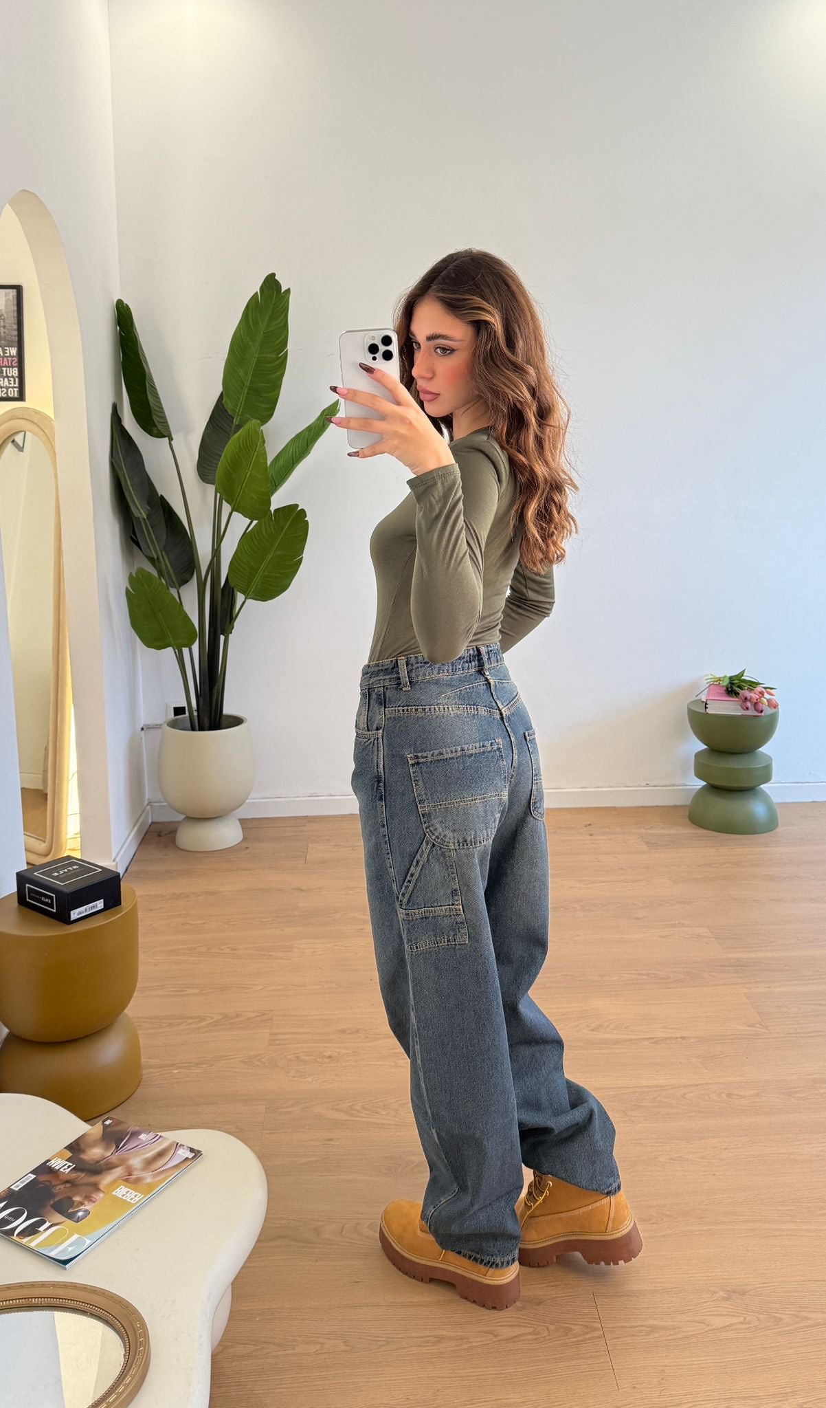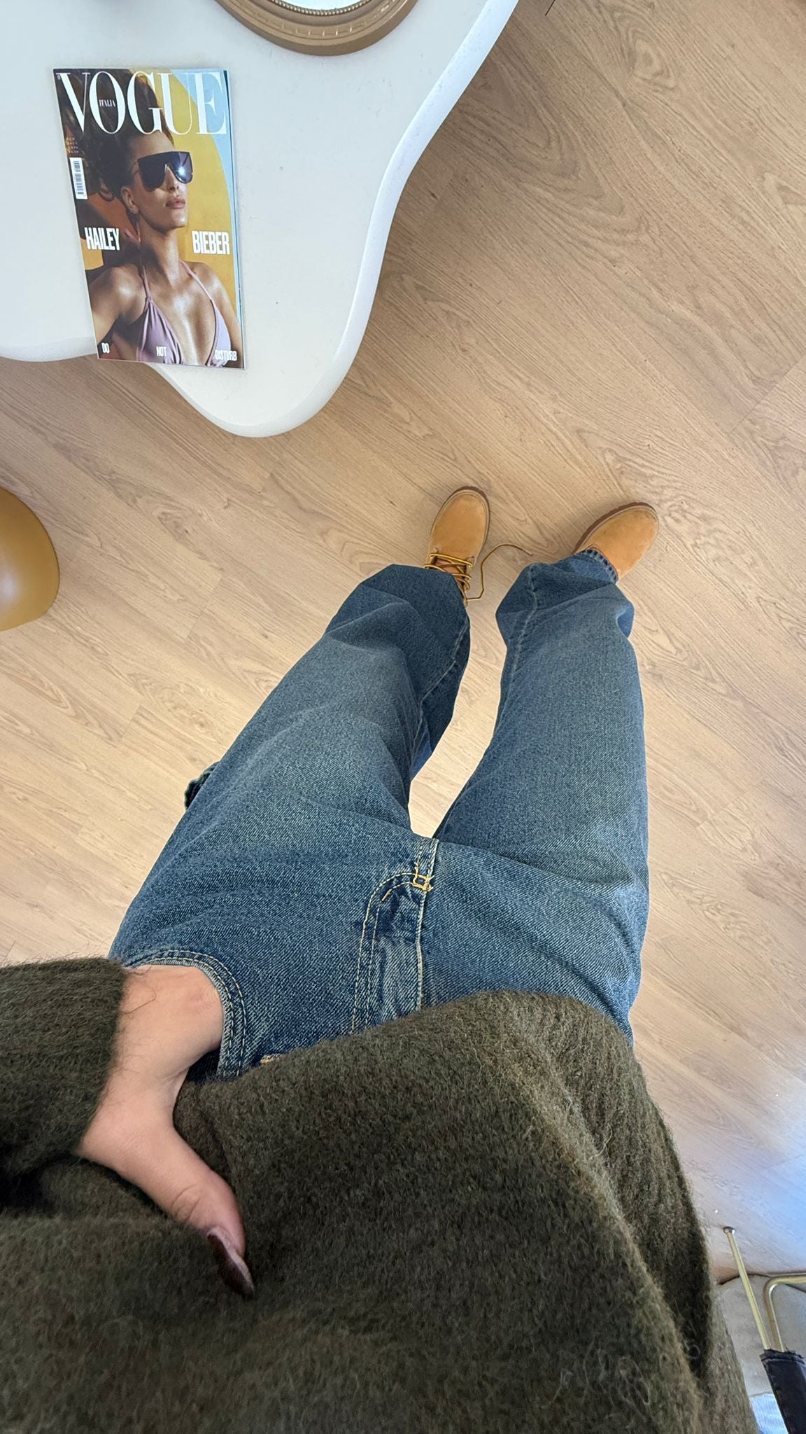 Jeans da donna in denim, tela fissa modello gamba larga. Veste regolarmente la propria taglia, la modella indossa taglia XS.