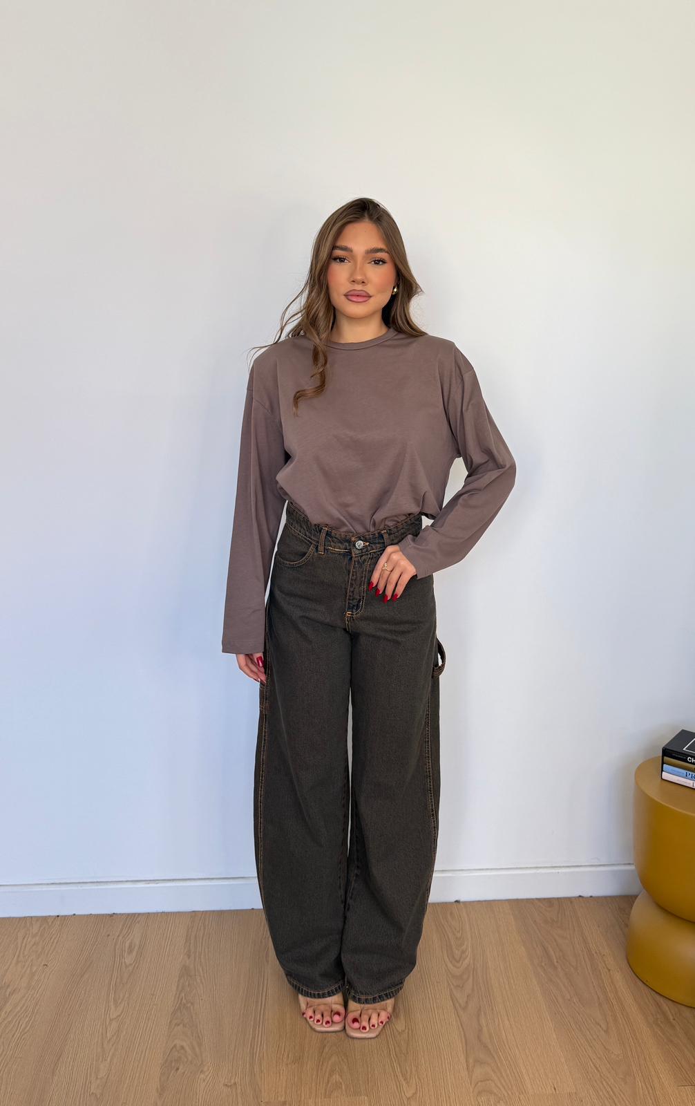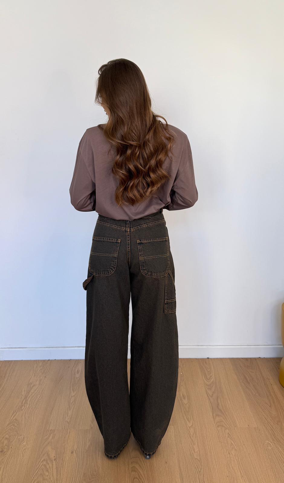 Jeans da donna in denim scuro tela fissa modello baggy, veste regolarmente la propria taglia e la modella indossa taglia XS