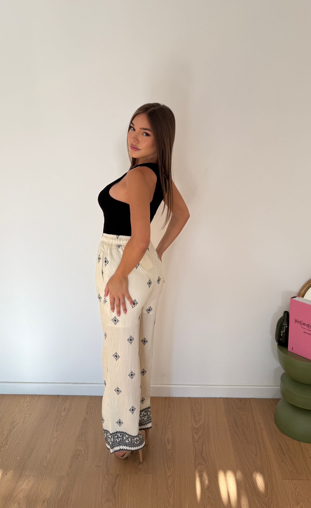 Pantalone da donna in semi Lino con shorts interno, elastico in vita e veste regolarmente la propria taglia e la modella indossa taglia S/M