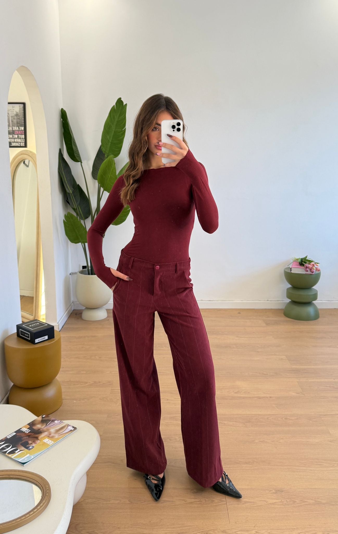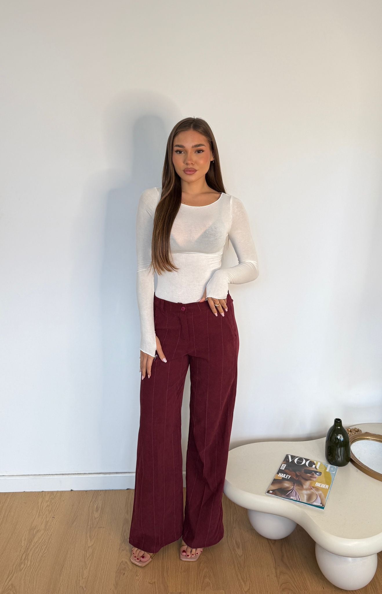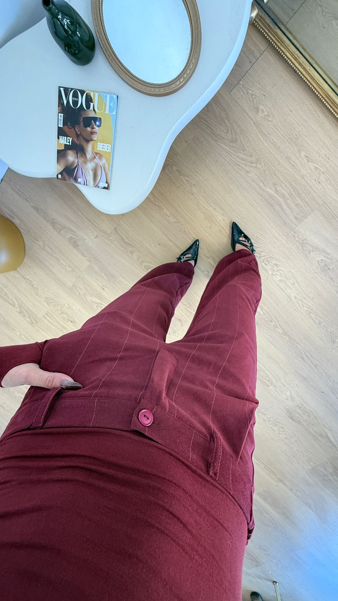 Pantalone da donna tessuto effetto camoscio,con elastico in vita sul retro e bottoncino sul davanti, semi elasticizzato, top quality. La modella indossa taglia S.
