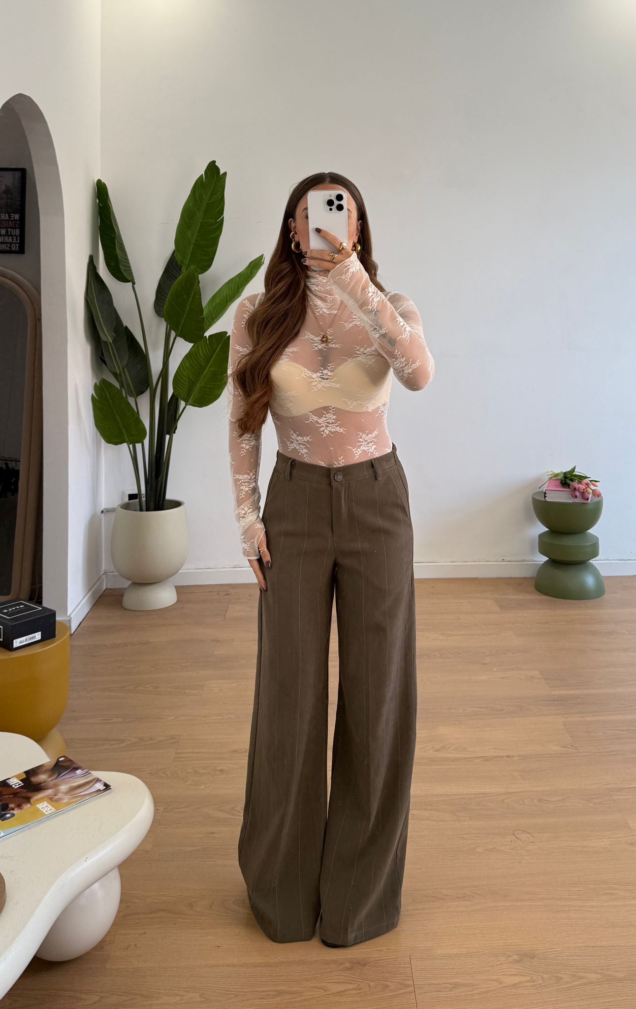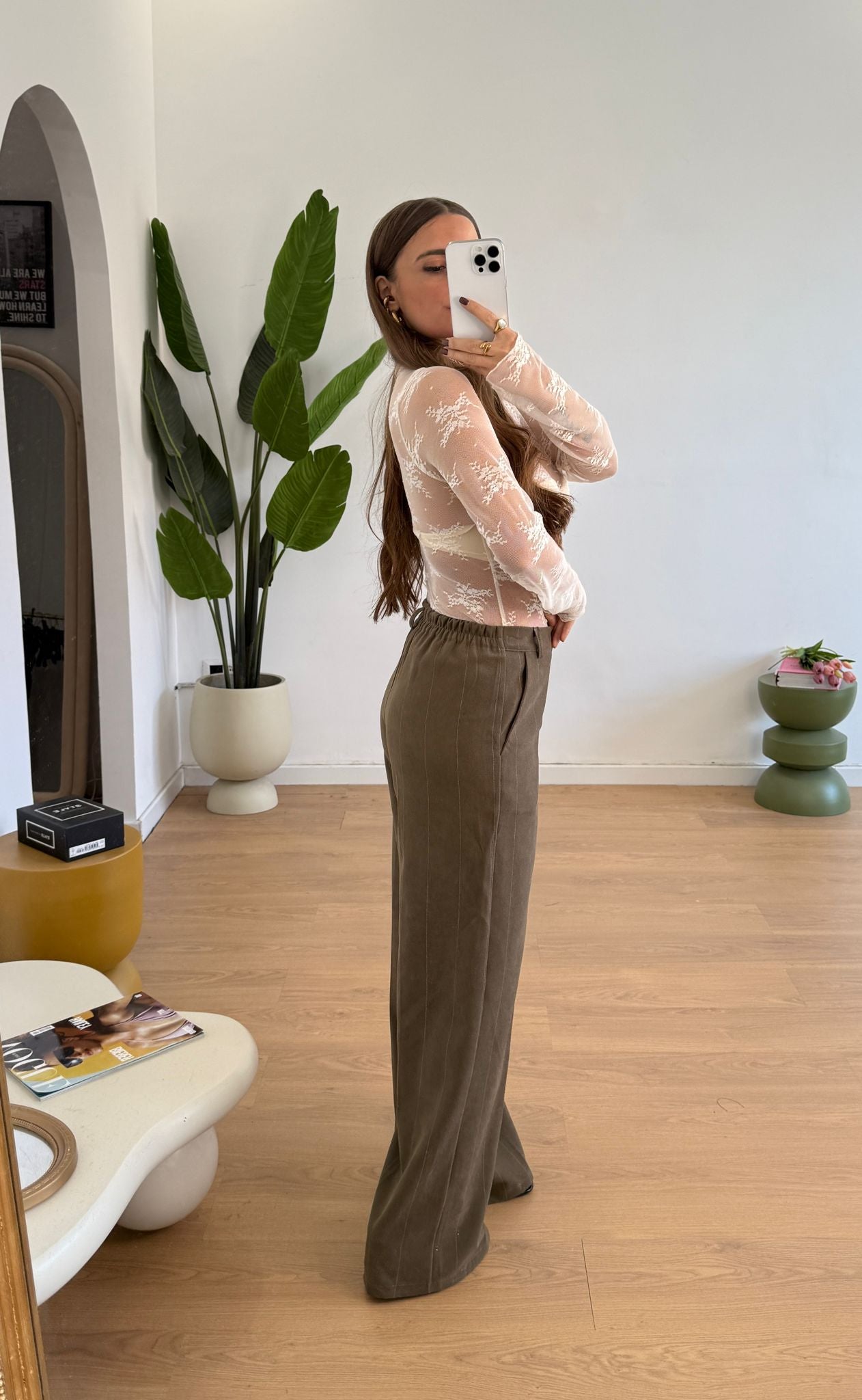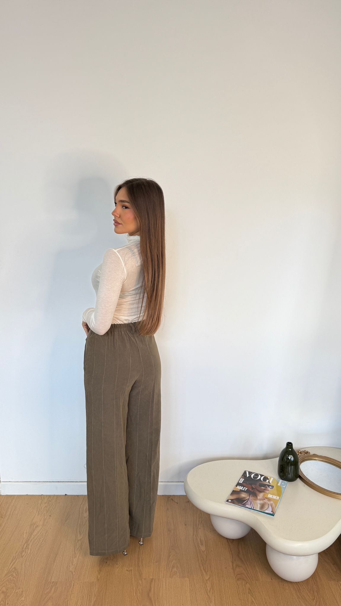 Pantalone da donna tessuto effetto camoscio,con elastico in vita sul retro e bottoncino sul davanti, semi elasticizzato, top quality. La modella indossa taglia S.