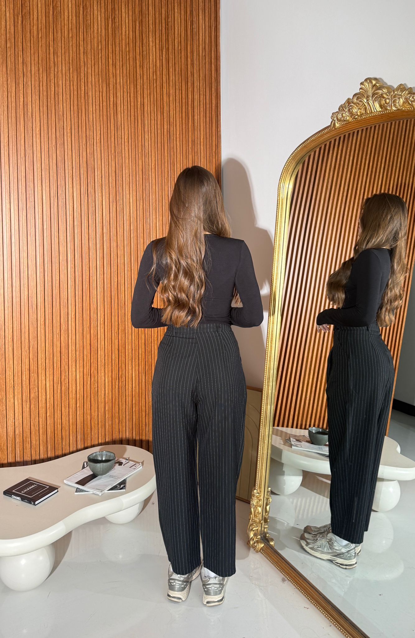 Pantalone da donna gessato in cotone modello ballon con pinces sul davanti, tasche laterali e chiusura bottoncino e zip. Il pantalone veste regolarmente la propria taglia e la modella indossa taglia S ed è alta 1,65 e pesa 52/53 KG.