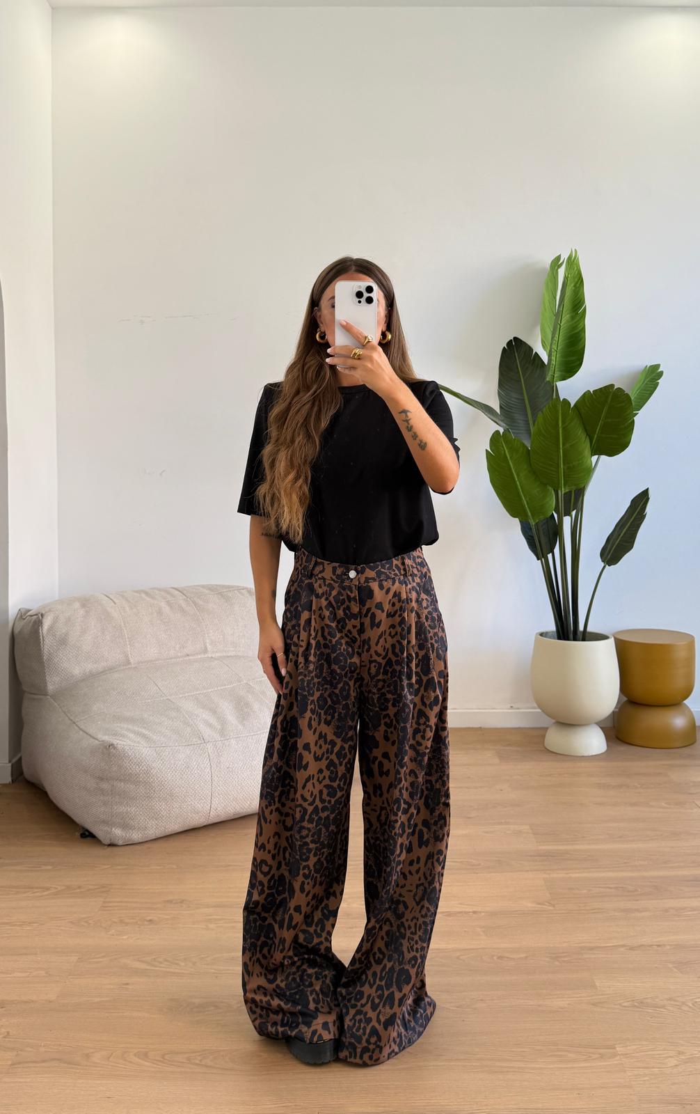Pantalone da donna effetto seta fantasia animalier e veste regolarmente la propria taglia e la modella indossa taglia S